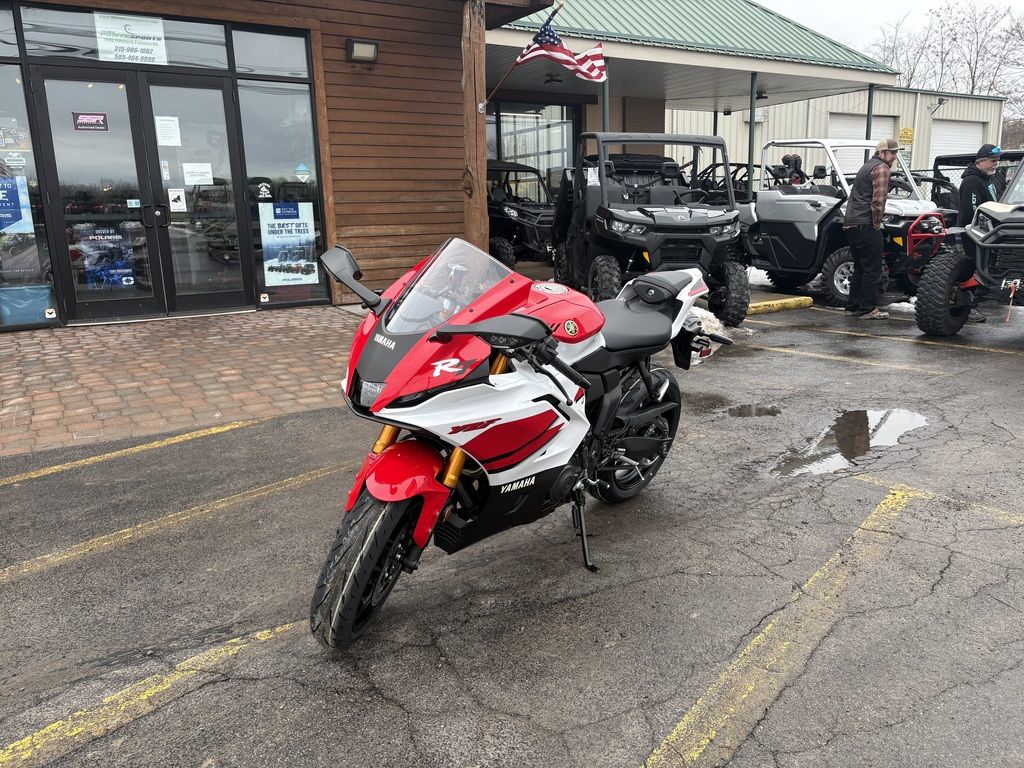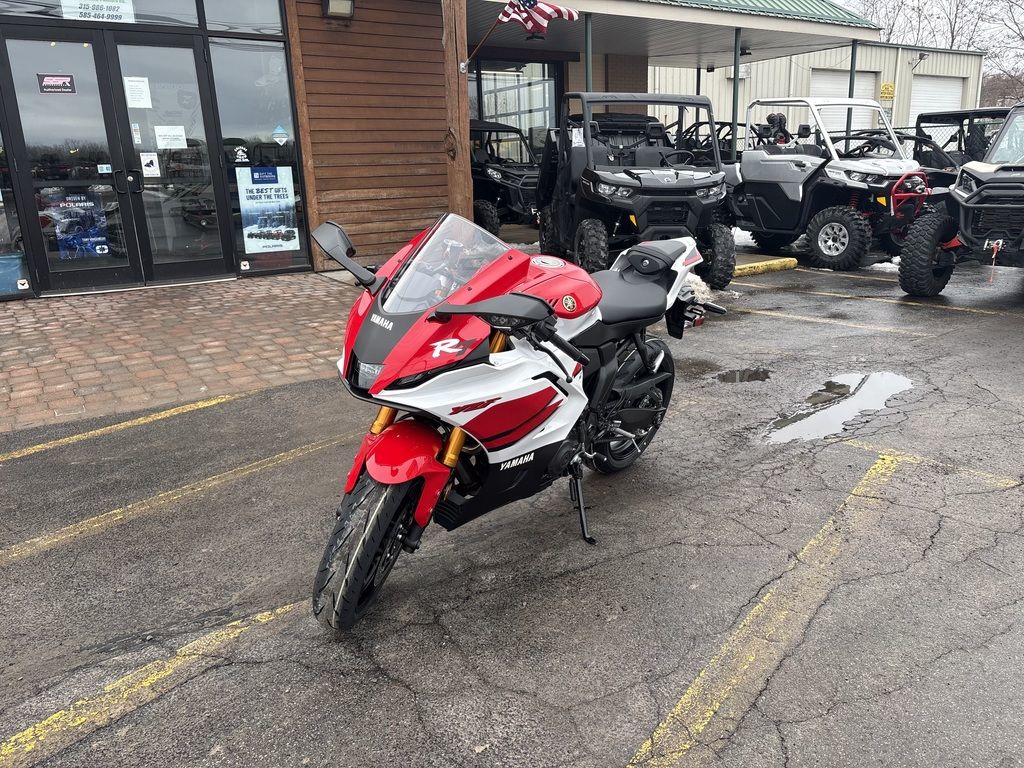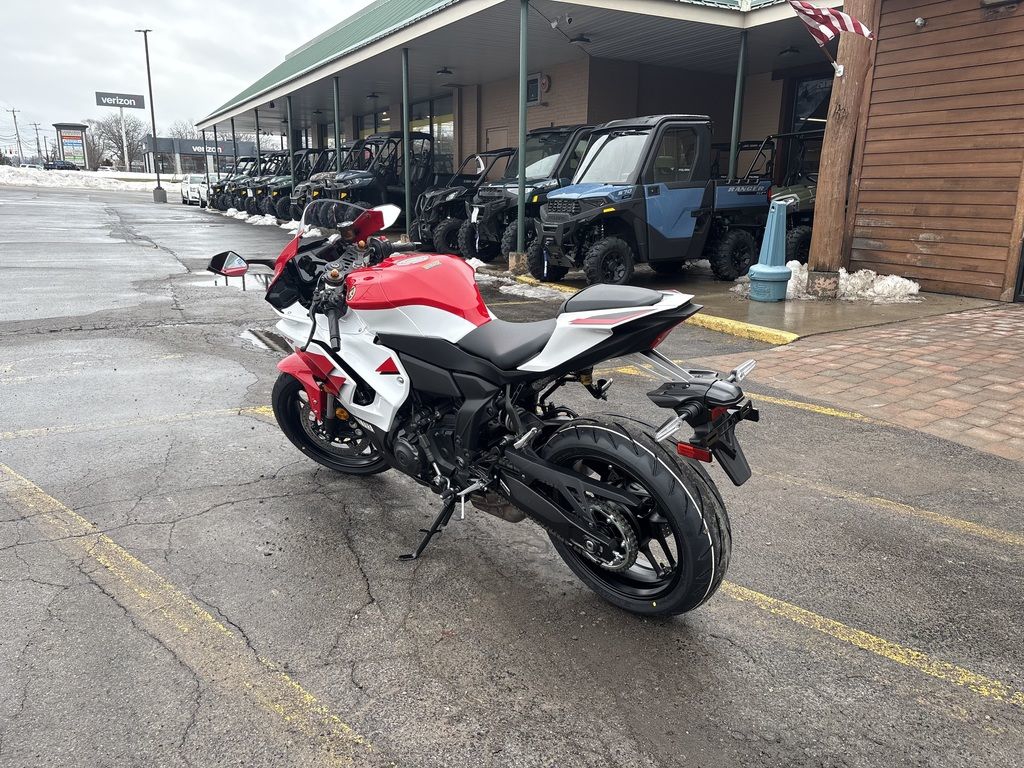 The new 2026 YZF-R7 70th Anniversary Edition's aerodynamic next-generation R-Series design combines with iconic white and red speed block livery, gold Yamaha Tuning Fork emblems, and Anniversary Edition badge to celebrate the 1955 birth of Yamaha Motor Company and seven decades of motorsports excellence in standout style.