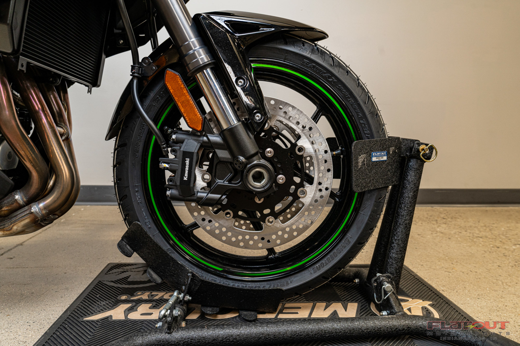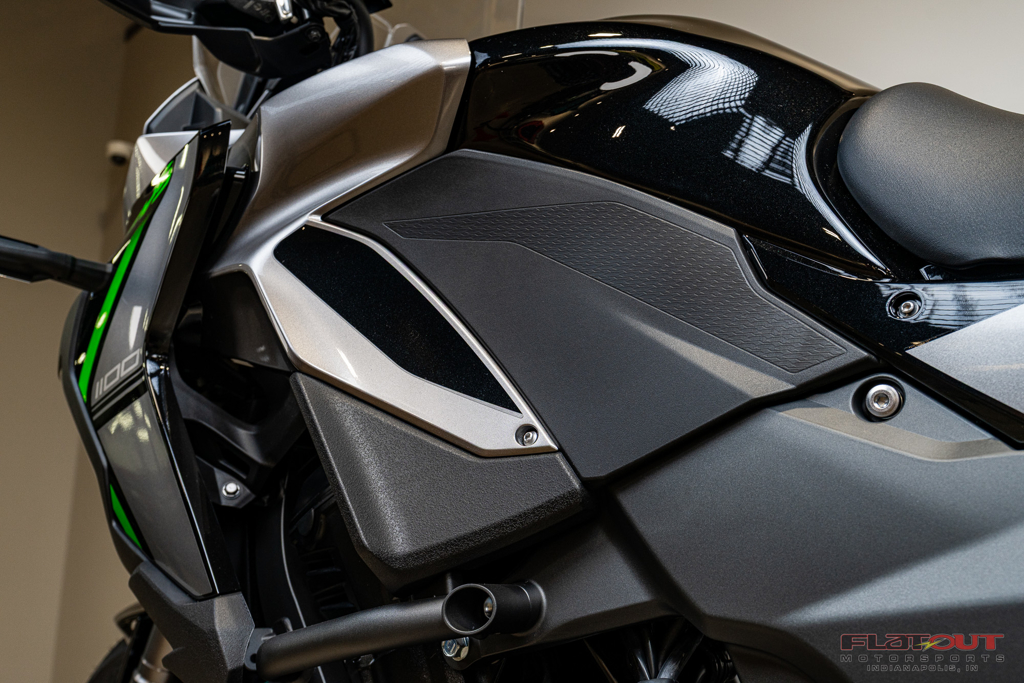 Highlights: Engine Type: 4-stroke, 4-cylinder, DOHC, 16-valve, Displacement: 1,043cc, Bore and Stroke: 77.0 x 56.0mm, Cooling: Liquid, Compression Ratio: 10.3:1, Fuel System: DFI® with 38mm Keihin ETV throttle bodies (4), Ignition: TCBI with electronic advance, Transmission:, 6-speed, return shift, Kawasaki Quick Shifter (KQS), Final Drive: Sealed chain, Front Suspension: 43mm inverted fork with KECS-controlled rebound and compression damping, manual spring preload adjustability and top-out springs/5.9 in. travel, Rear Suspension: Horizontal back-link, New Uni-Trak®, BFRC gas charged shock with piggyback reservoir, KECS-controlled compression and rebound dampin electronically-adjustable spring preload/5.9 in. travel, Front Brakes: Dual 310mm petal-style discs with four-piston calipers, ABS, Rear Brakes: Single 250mm petal disc with single-piston caliper, ABS, Front Tire: 120/70 Zr-17, Rear Tire: 180/55 Zr-17, Wheelbase: 59.8 in., Seat Height: 33.1 in., Rake: 27.0 deg., Trail: 4.0 in.
