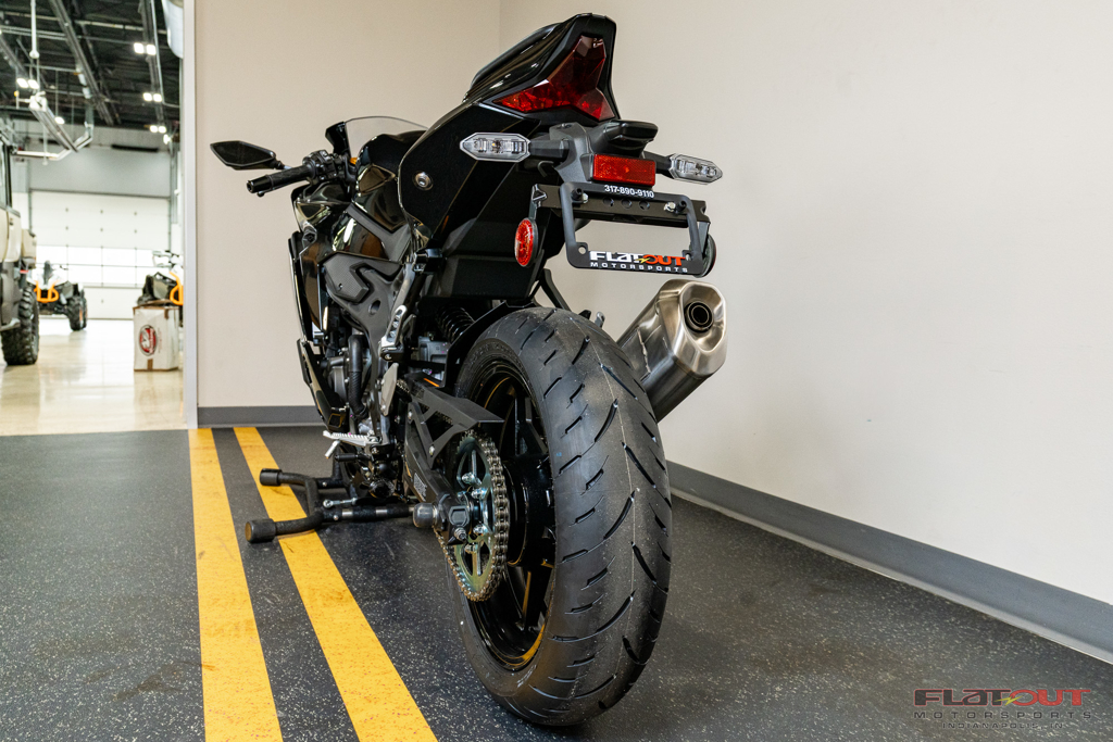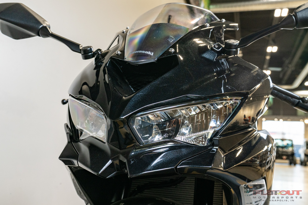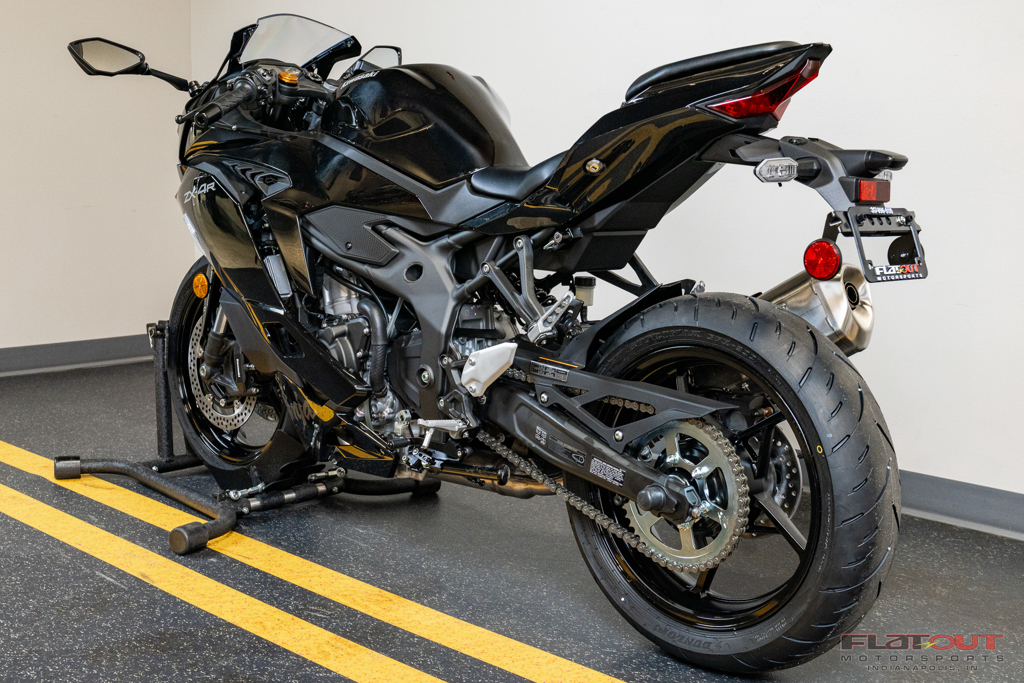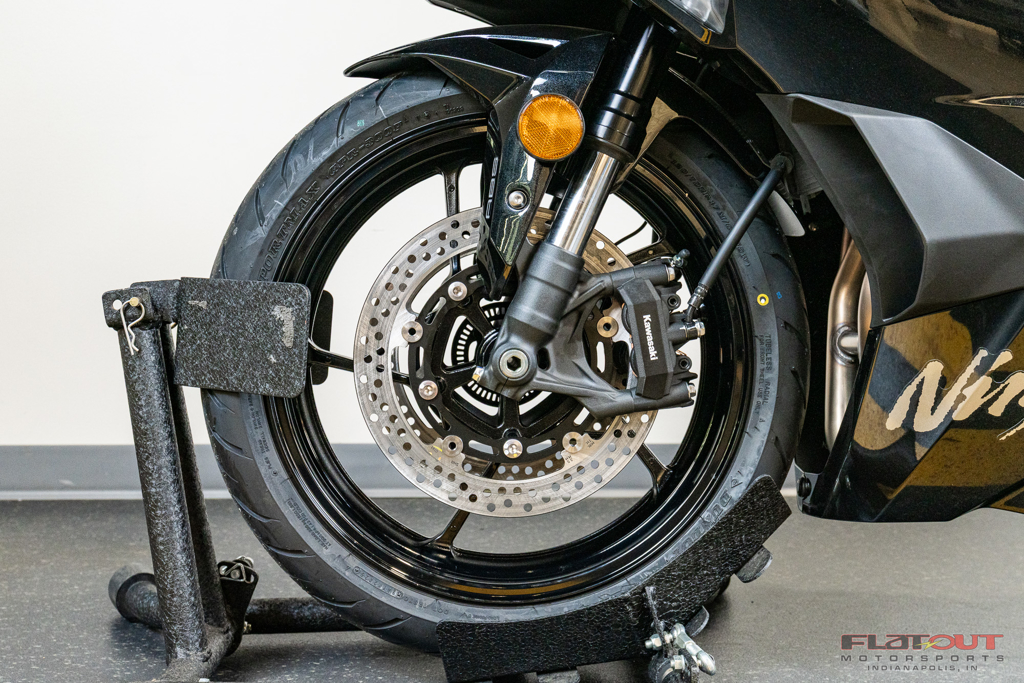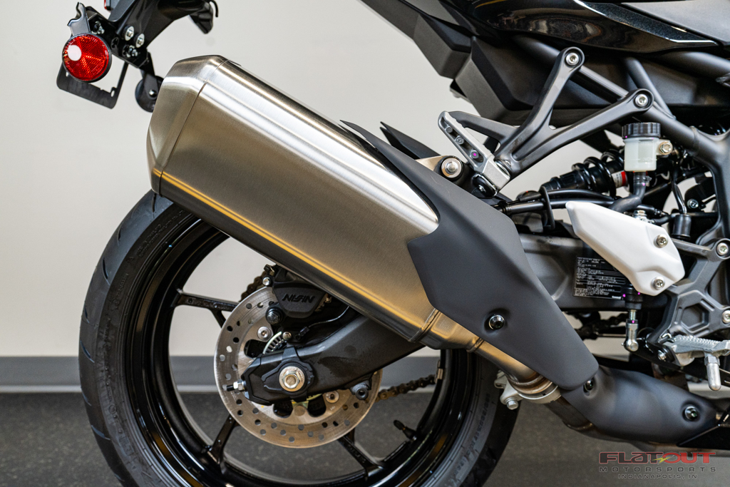Highlights: Engine Type: 4-stroke, Parallel Twin, DOHC, Displacement: 399cc, Bore and Stroke: 70.0 x 51.8mm, Cooling: Liquid, Compression Ratio: 11.5:1, Fuel System: DFI® with dual 32mm throttle bodies, Ignition: TCBI w/digital advance, Transmission: 6-speed, Final Drive: Sealed chain,Front Suspension: 41mm hydraulic telescopic fork/4.7 in. travel, Rear Suspension: Horizontal back-link with adjustable spring preload/5.1 in. travel, Front Brakes: Single 310mm semi-floating petal-type disc with 2-piston calipers (and ABS), Rear Brakes: Single 220mm petal-type disc with single-piston caliper (and ABS), Front Tire: 110/70-17, Rear Tire: 150/70-17, Wheelbase: 53.9 in., Seat Height: 30.9 in., Rake: 24.7 deg., Trail: 3.6 in., Fuel Capacity: 3.7 gal., Dry Weight: Curb Weight: 366 lb.