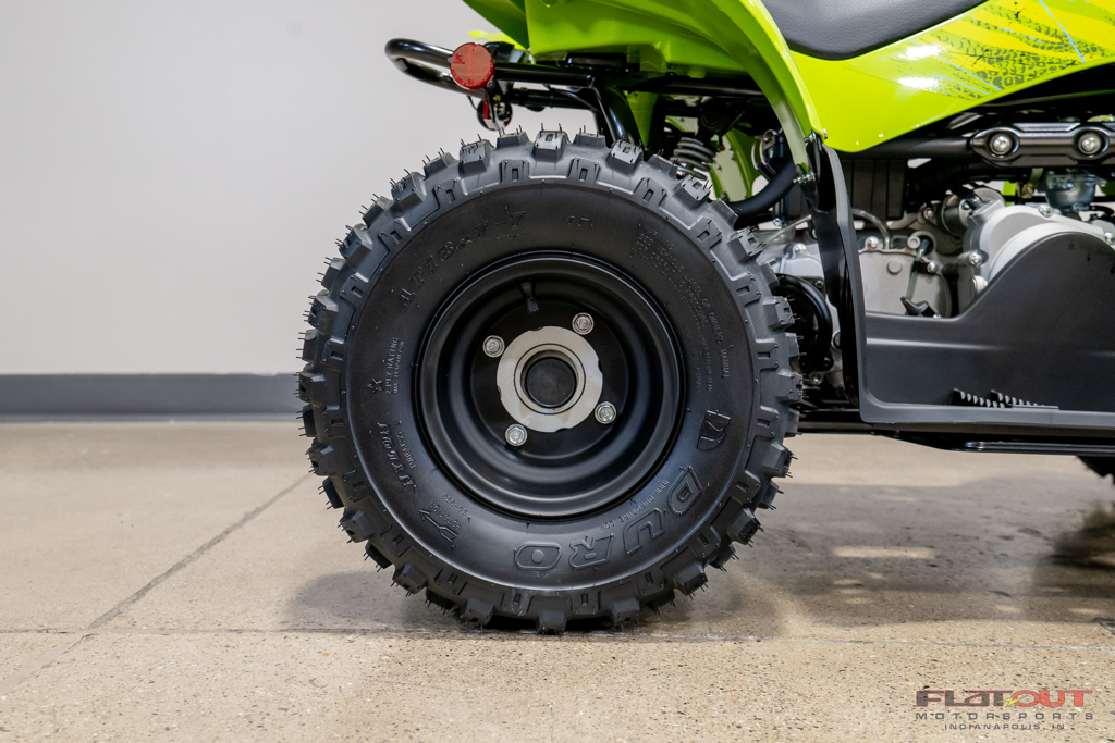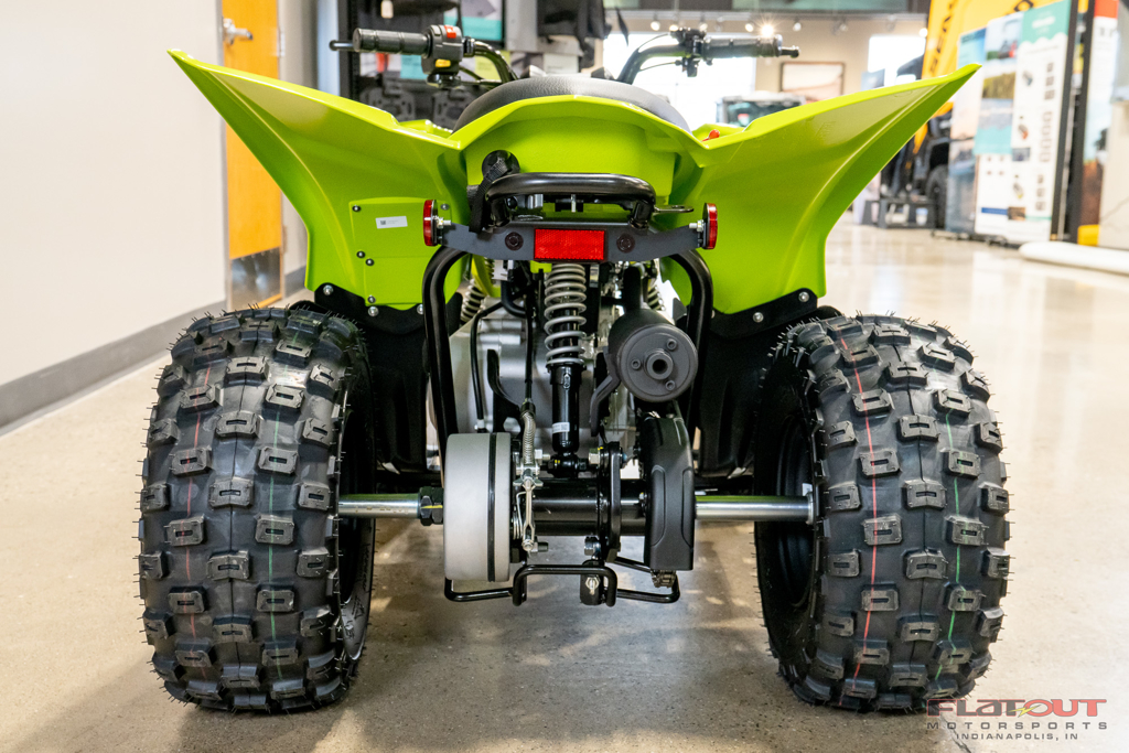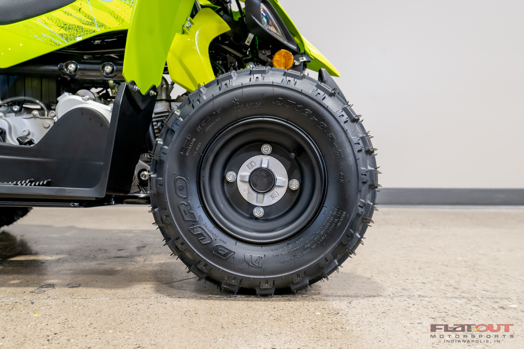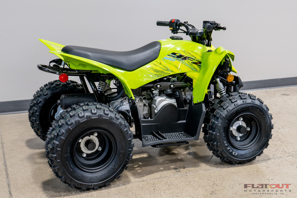 Highlights: Engine Type: SOHC 4-stroke; 2 valves, Displacement: 49cc, Bore x Stroke: 39.0mm x 41.4mm, Engine Cooling: Air, Fuel System: Carburetor, Front Travel: 2.4 in., Front Suspension: Single I-arm, Front Brake Type: Dual drum, Front Tires: AT16 x 6.5-7, Rear Travel: 2.0 in., Rear, Suspension: Single shock swingarm, Rear Brake Type: Drum, Rear Tires: AT16 x 7-7, Dry Weight: Curb Weight: 220 lb., Fuel Capacity: 1.5 gal., Ground Clearance: 3.5 in., Machine Dimensions (LxWxH): 49.2 in. x 32.3 in. x 30.3 in., Wheelbase: 32.7 in., Final Drive: Chain, Transmission: CVT Engine Type: Single-Cylinder Displacement: 3 cu. in. (49 cc) Bore x Stroke: Bore: 1.54 in. (39 mm); Stroke: 1.63 in. (41.4 mm) Cylinders: 1 Engine Cooling: Air Fuel System: Gas Starting System: Electric / Kick Front Travel: 2.4 in. (61 mm) Front Suspension: A-Arm Front Brake Type: Dual Sealed Drum Front Tires: Duro® AT 16 X 6.5-7 Rear Suspension: Swing Arm Rear Travel: 2 in. (50.8 mm) Rear Brake Type: Sealed Drum Rear Tires: Duro® AT 16 X 7-7 Frame: Steel Fuel Capacity: 1.5 gal. (5.7 L) Ground Clearance: 3.5 in. (88.9 mm) Machine Dimensions (LxWxH): L: 49.2 in. (1249.7 mm); W: 32.3 in. (820.4 mm); H: 30.3 in. (769.6 mm) Wheelbase: 32.7 in. (830.6 mm) Drive Train: Continuously Variable (CVT) Tachometer: Optional