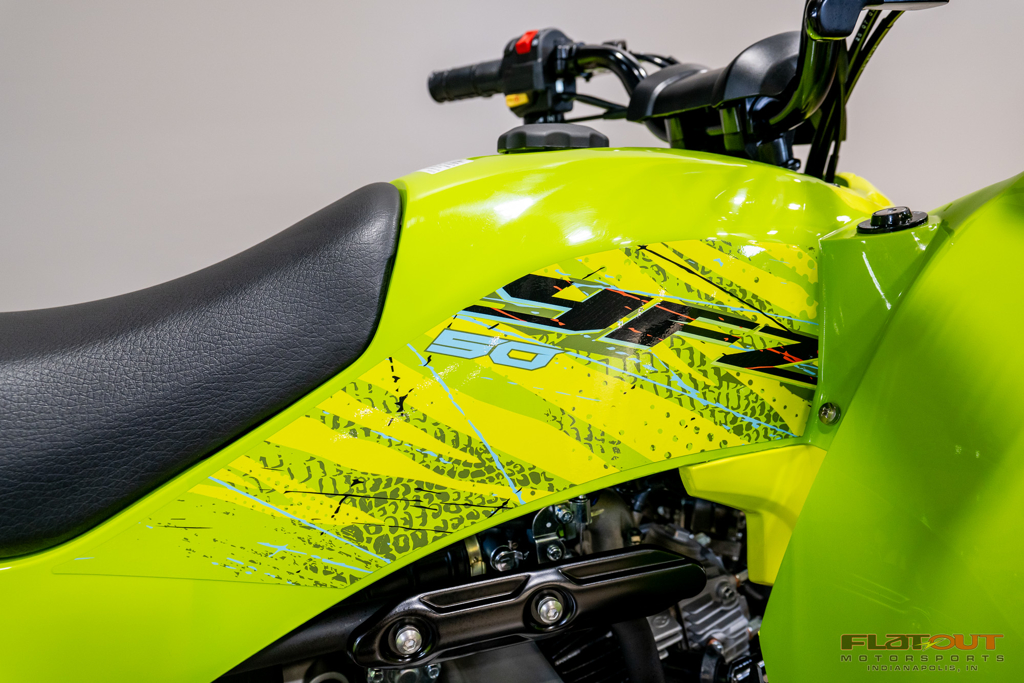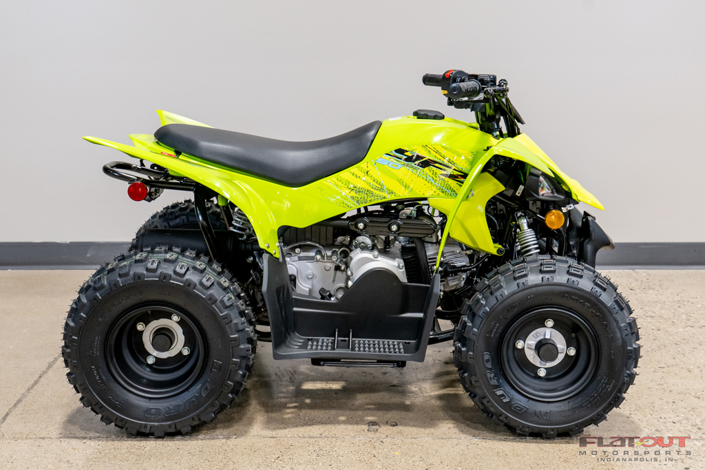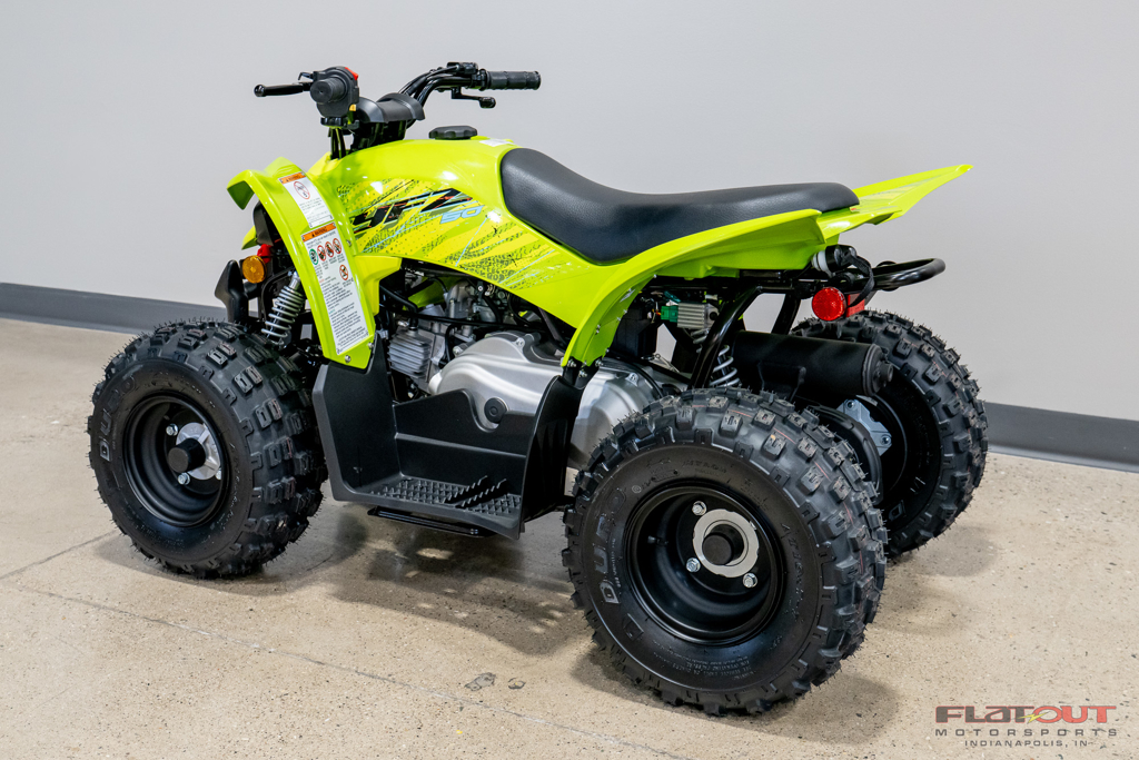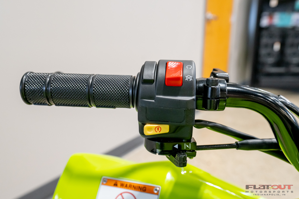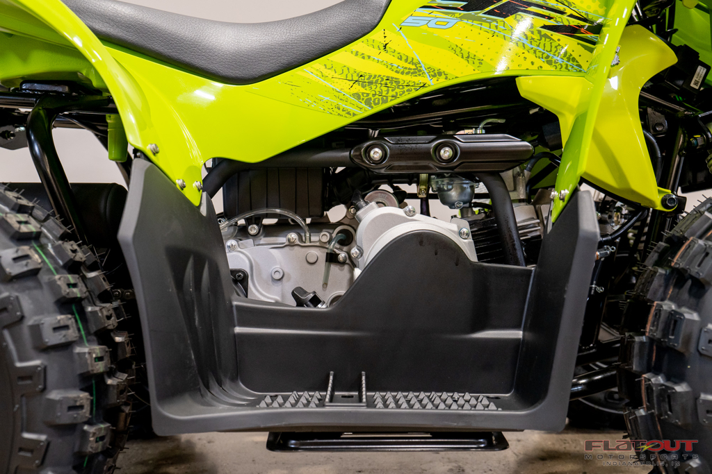 Highlights: Engine Type: SOHC 4-stroke; 2 valves, Displacement: 49cc, Bore x Stroke: 39.0mm x 41.4mm, Engine Cooling: Air, Fuel System: Carburetor, Front Travel: 2.4 in., Front Suspension: Single I-arm, Front Brake Type: Dual drum, Front Tires: AT16 x 6.5-7, Rear Travel: 2.0 in., Rear, Suspension: Single shock swingarm, Rear Brake Type: Drum, Rear Tires: AT16 x 7-7, Dry Weight: Curb Weight: 220 lb., Fuel Capacity: 1.5 gal., Ground Clearance: 3.5 in., Machine Dimensions (LxWxH): 49.2 in. x 32.3 in. x 30.3 in., Wheelbase: 32.7 in., Final Drive: Chain, Transmission: CVT Engine Type: Single-Cylinder Displacement: 3 cu. in. (49 cc) Bore x Stroke: Bore: 1.54 in. (39 mm); Stroke: 1.63 in. (41.4 mm) Cylinders: 1 Engine Cooling: Air Fuel System: Gas Starting System: Electric / Kick Front Travel: 2.4 in. (61 mm) Front Suspension: A-Arm Front Brake Type: Dual Sealed Drum Front Tires: Duro® AT 16 X 6.5-7 Rear Suspension: Swing Arm Rear Travel: 2 in. (50.8 mm) Rear Brake Type: Sealed Drum Rear Tires: Duro® AT 16 X 7-7 Frame: Steel Fuel Capacity: 1.5 gal. (5.7 L) Ground Clearance: 3.5 in. (88.9 mm) Machine Dimensions (LxWxH): L: 49.2 in. (1249.7 mm); W: 32.3 in. (820.4 mm); H: 30.3 in. (769.6 mm) Wheelbase: 32.7 in. (830.6 mm) Drive Train: Continuously Variable (CVT) Tachometer: Optional