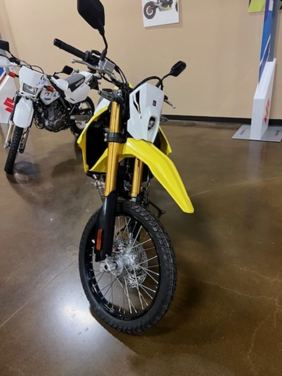 - The DR-Z4S’ new bodywork features Suzuki Champion Yellow No. 2 / Solid Special White No. 2 or Solid Iron Gray bodywork with modern graphics. The bodywork smoothly fits together, creating a “linear connection” from front to rear, through a bold horizontal line the flows from the front fender through to the tail. The MX-inspired styling also conveys the impression that the DR-Z4S is a serious off-road performer.