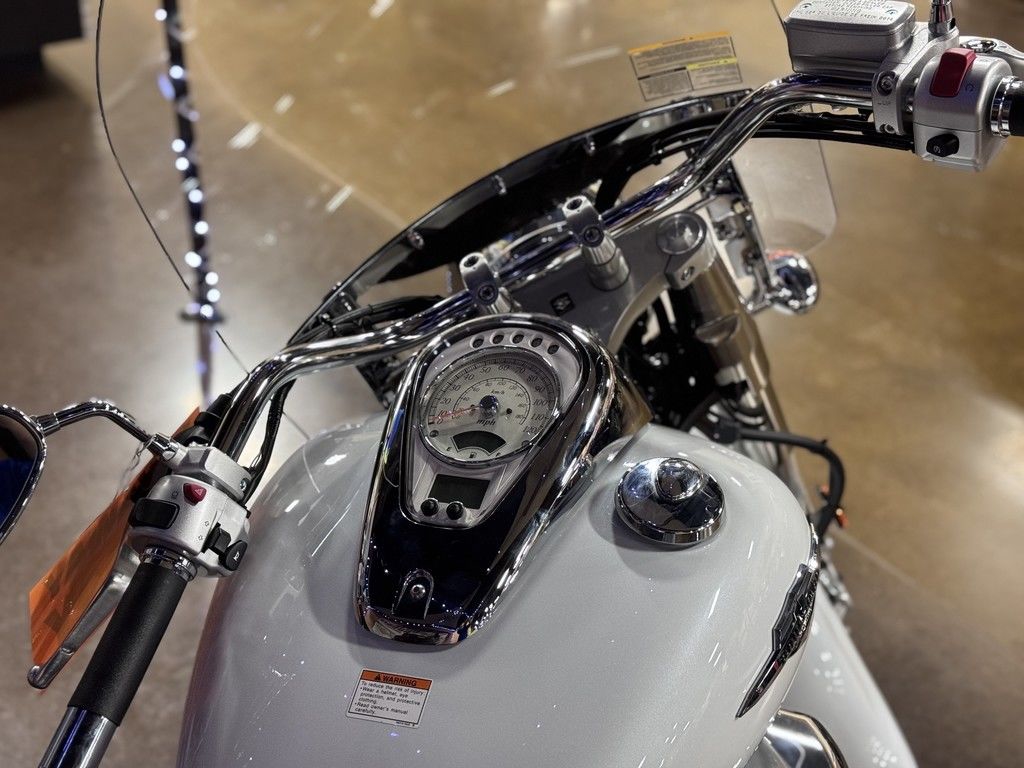 With deep Pearl Brilliant White paint covering its bold styling, this cruiser stands out in a crowd, while an extensive list of features makes it ideal for comfortable, long-distance cruising. Tour-ready features include a plush seat in the middle of a spacious riding position, an aerodynamic windshield, and studded dual seats that deliver all-day rider and passenger comfort.