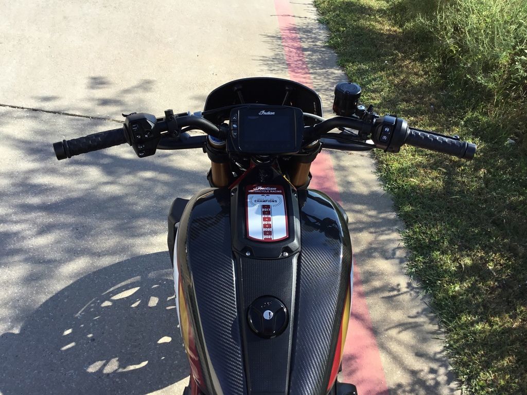 Premium carbon fiber bodywork, including the tank shrouds, headlight nacelle, front fender, and seat cowl, give the FTR Championship Edition a lightweight, aggressive, and premium appearance. The exposed weave contrasts perfectly with the championship graphics, while every curve and contour echoes Indian’s meticulous design philosophy. It’s a motorcycle that commands attention—both in motion and at rest.