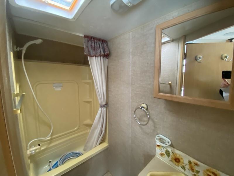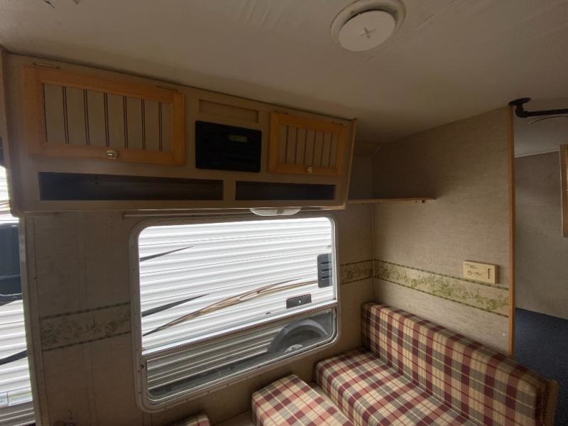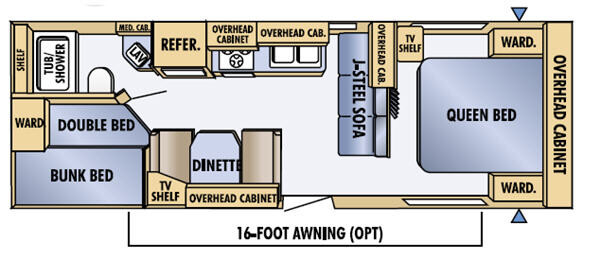Rear Bath, Tub Shower, Lav., Medicine Cabinet, Wardrobe, Rear Double Bed with Overhead Bunk & Wardrobe, TV Shelf, Booth Dinette, Refrigerator, 3 Burner Range, Double Kitchen Sink, J-Steel Sofa, Front Queen Bed w/Wardrobes & TV Shelf, Overhead Cabinets Throughout, and Much More!