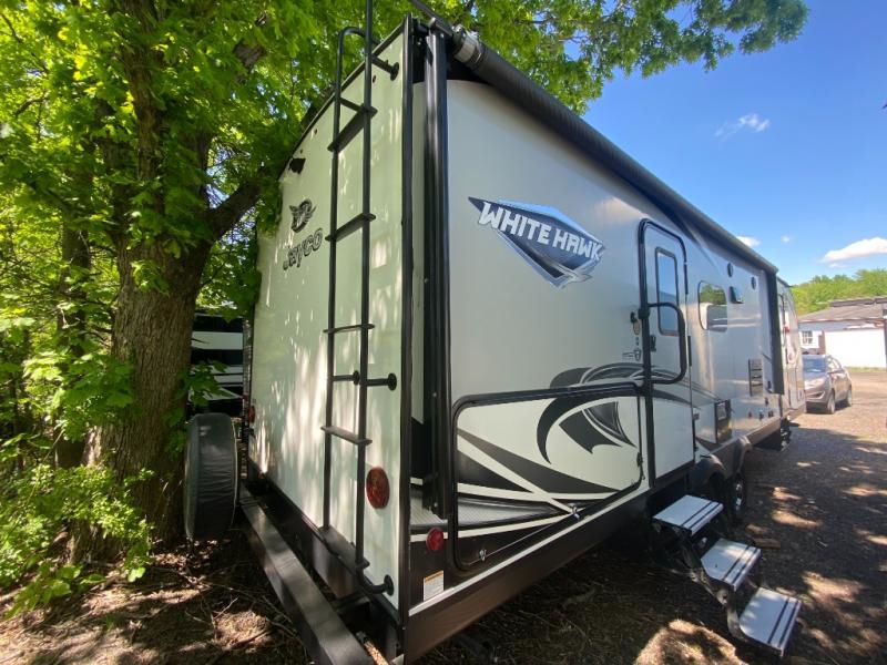 When you take your next adventure in this White Hawk travel trailer, you will soar to new heights. The addition of stainless steel appliances in the kitchen gives this trailer a home-like and luxurious feeling, and the secluded bathroom located in the rear of this unit gives you the privacy you desire. You can spend each evening gazing up at the stars underneath the 19' electric awning with LED lighting, and you won't even have to run inside when you become thirsty because this model comes equipped with an outdoor kitchen. At the end of the night, you can comfortably rest your head upon the Jayco-exclusive Simmons mattress in the front private bedroom.
