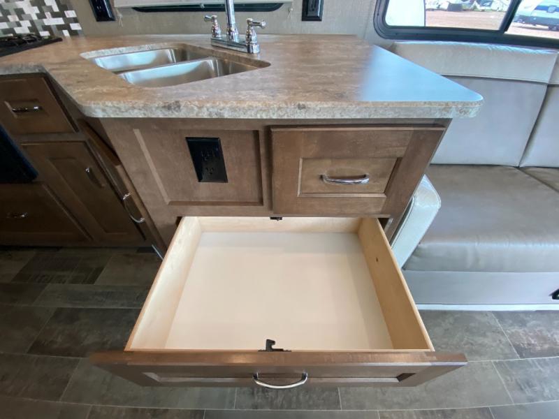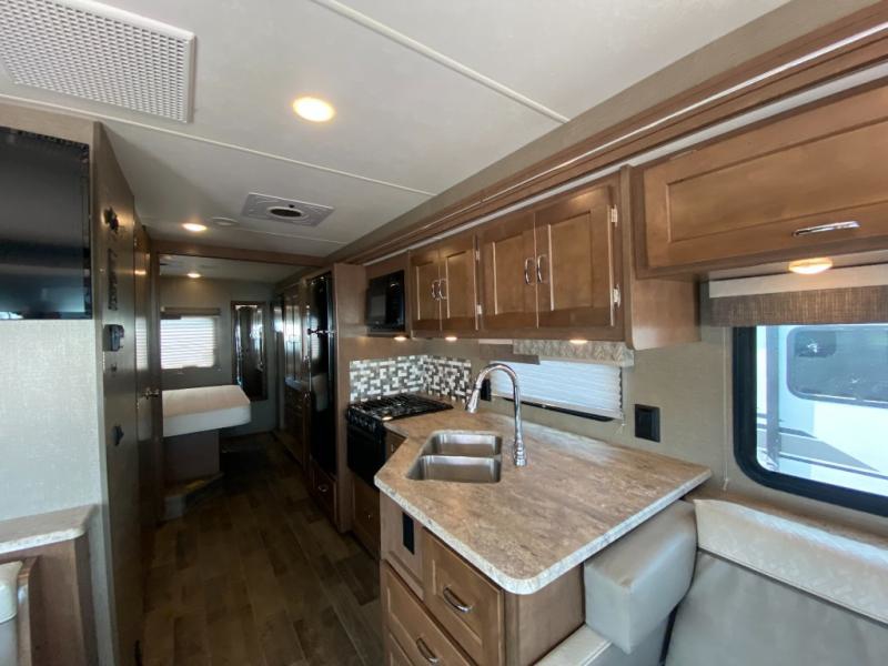 When you travel in this Intent Class A Gas motorhome, you are traveling in an exceptional RV that contains all of the amenities you want and need, plus many extra. The fully stocked kitchen, which is located on the full-wall slide out, contains a residential refrigerator that gives you the space you need to keep your perishable items from spoiling, and everyone will love gathering together each evening in the warm summer air as you party underneath the 22' electric awning with LED lights.