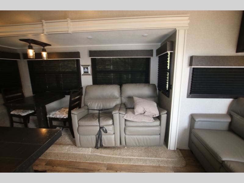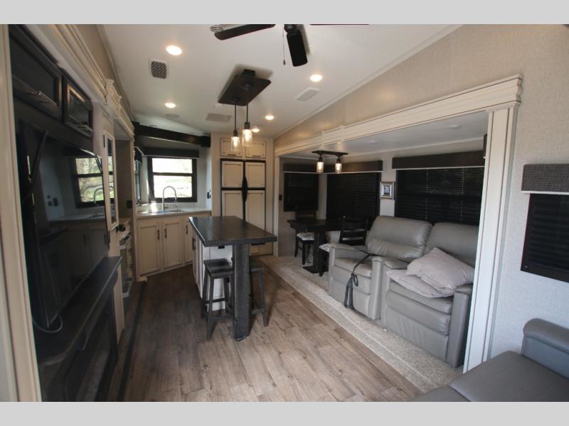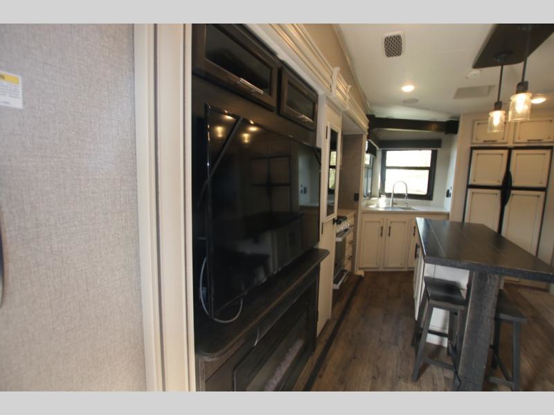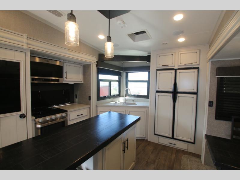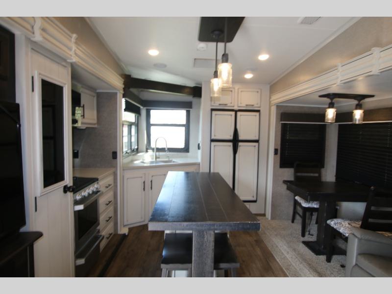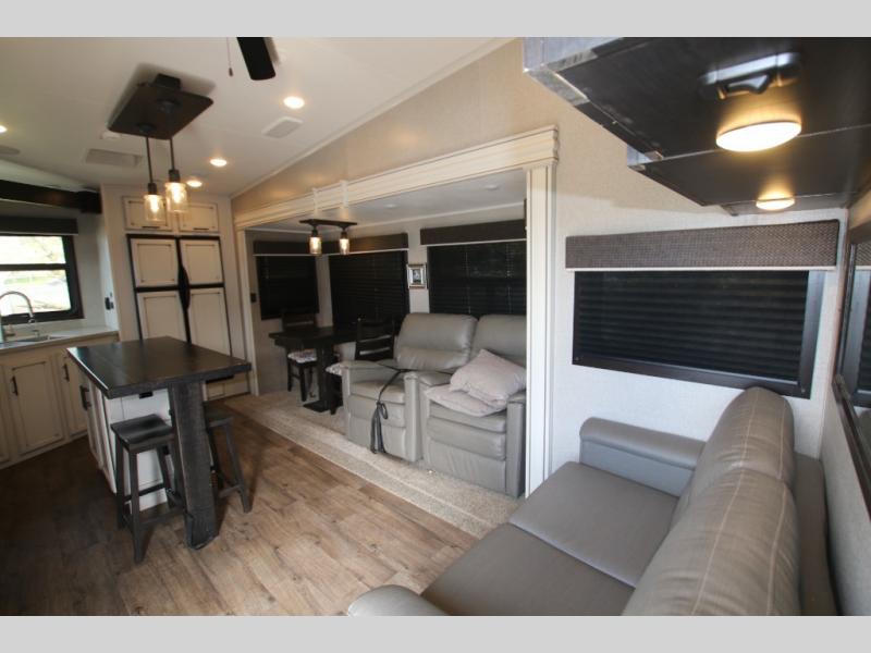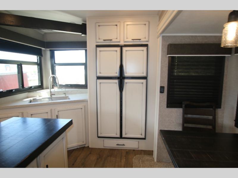 The huge island with bar stools creates a stylish focal point for this Eagle fifth wheel! Not only can you gather around the island in the bar stools, but you can also sit back in one of the two recliners, at the free-standing table with chairs, or on the hide-a-bed sofa while you chat with the cook. And the cook will appreciate having extra space from the opposing slides to move around and grab ingredients from the 13.5 cubic foot refrigerator. Plus, you'll also find a private bedroom up front so that you can retire in comfort once the day has ended.