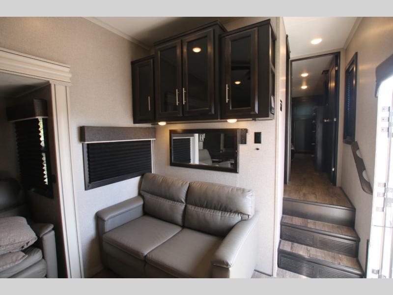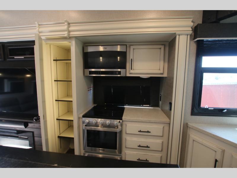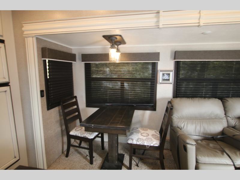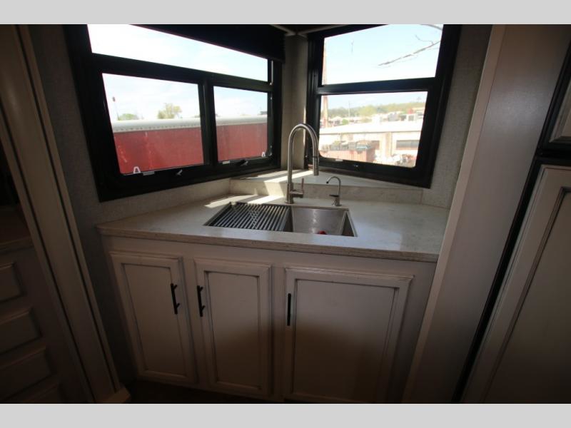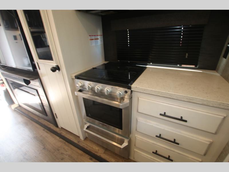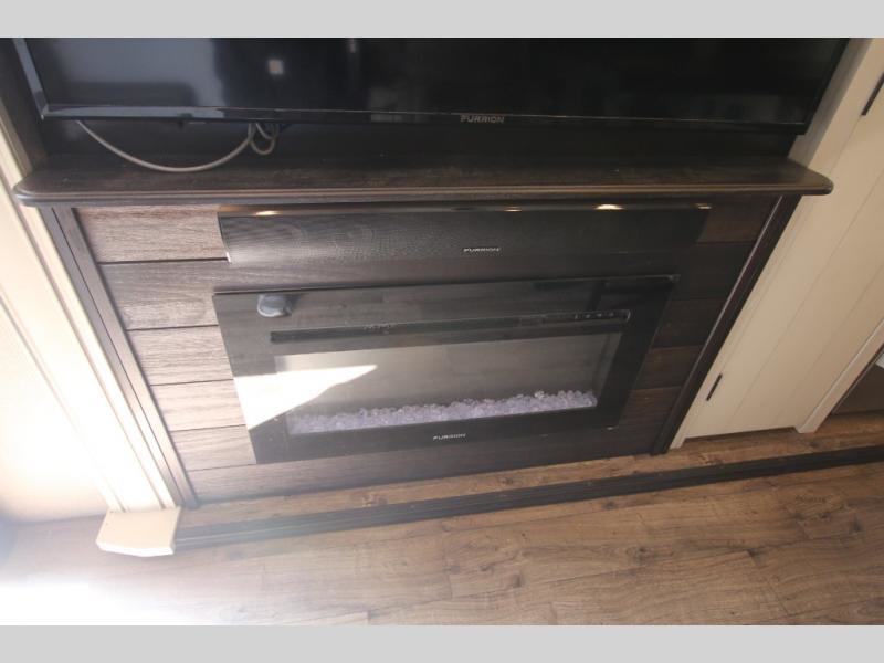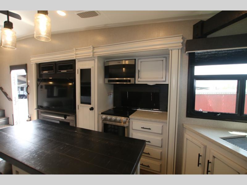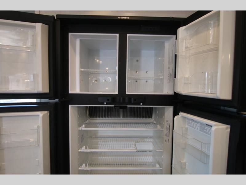 The huge island with bar stools creates a stylish focal point for this Eagle fifth wheel! Not only can you gather around the island in the bar stools, but you can also sit back in one of the two recliners, at the free-standing table with chairs, or on the hide-a-bed sofa while you chat with the cook. And the cook will appreciate having extra space from the opposing slides to move around and grab ingredients from the 13.5 cubic foot refrigerator. Plus, you'll also find a private bedroom up front so that you can retire in comfort once the day has ended.