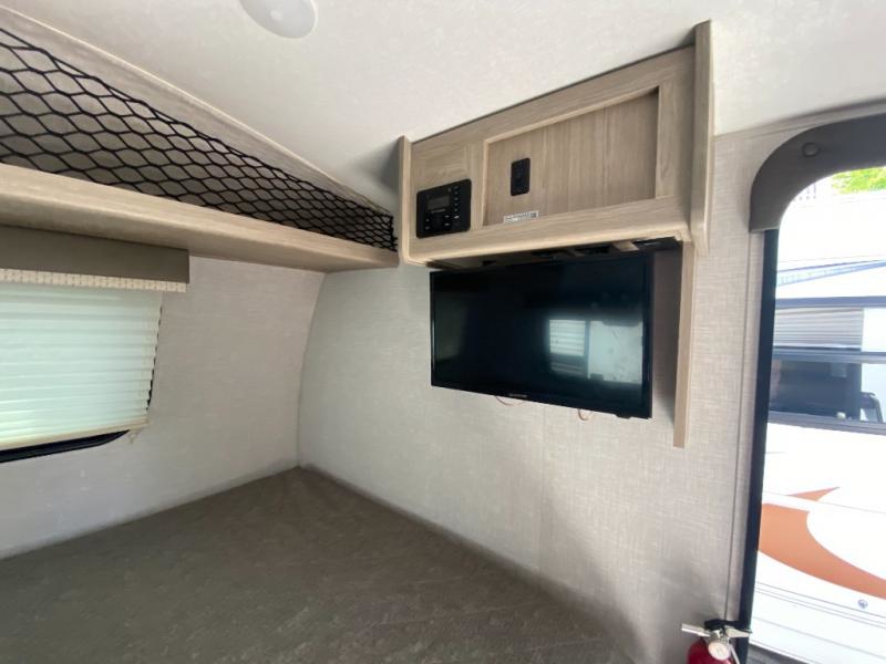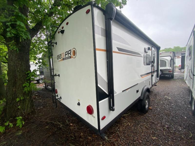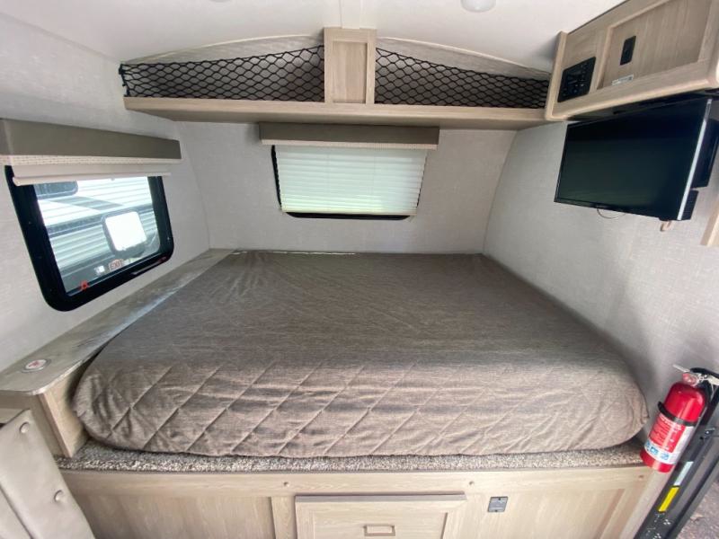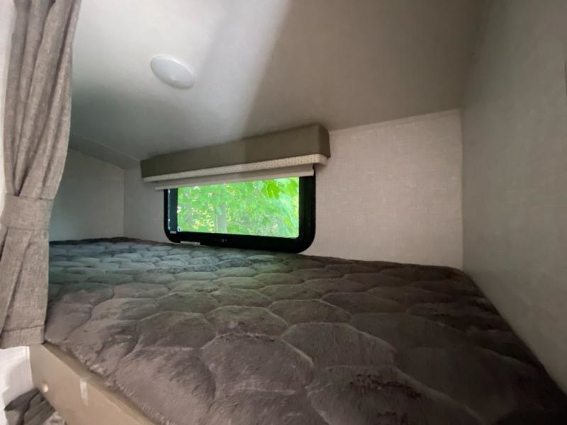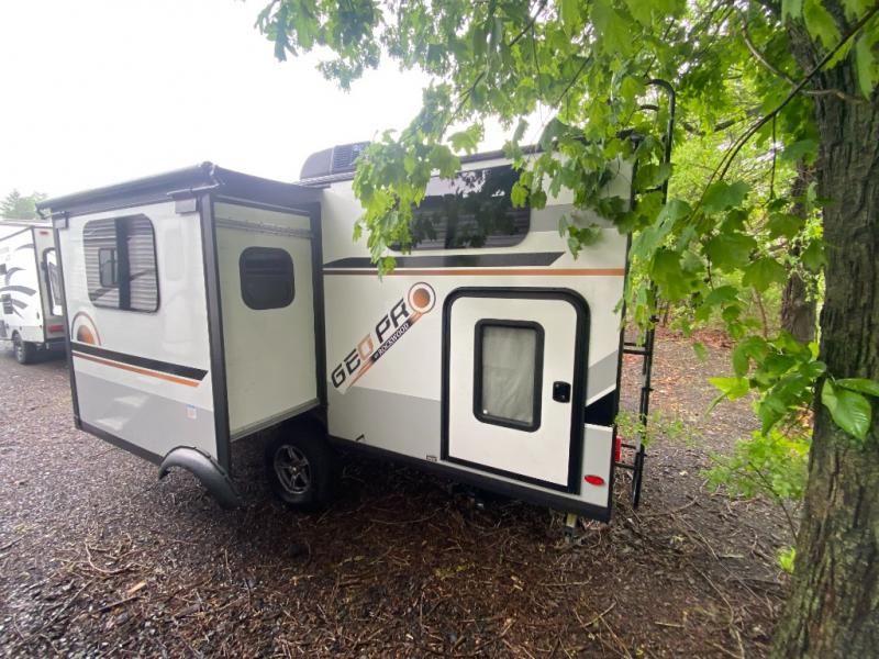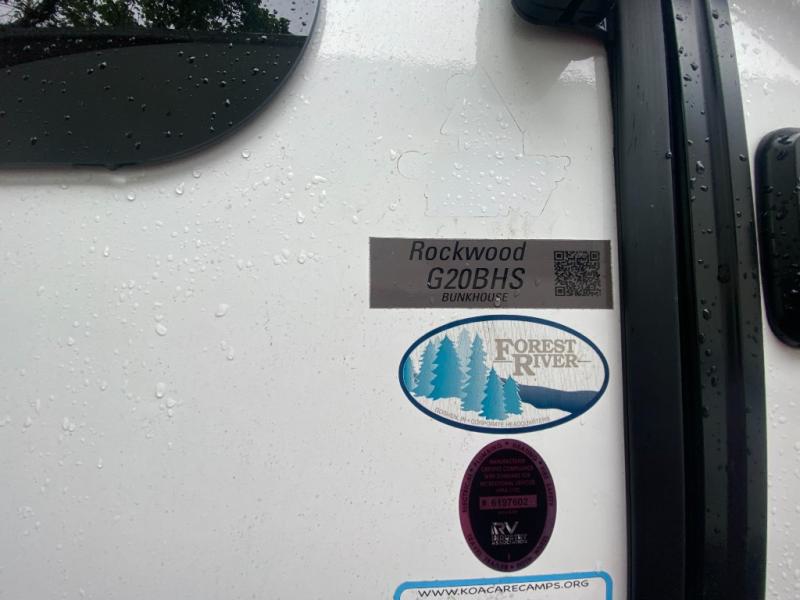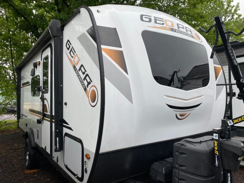 Explore the used 2021 Forest River Rockwood Geo Pro G20BHS—a lightweight, off-road-ready travel trailer perfect for adventurous families. This 21' 2" bunkhouse model comfortably sleeps up to 5 and features a slide-out dinette, full rear bath, and a front full-size bed. With a dry weight of 3,513 lbs, it's easily towable by many SUVs. Enjoy amenities like a 190W roof-mounted solar panel, 13,500 BTU A/C, 20,000 BTU furnace, and a 14' power awning. Additional features include an outdoor griddle, frameless windows, and a rear ladder. Ideal for off-grid camping and weekend getaways.