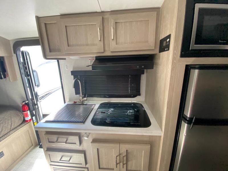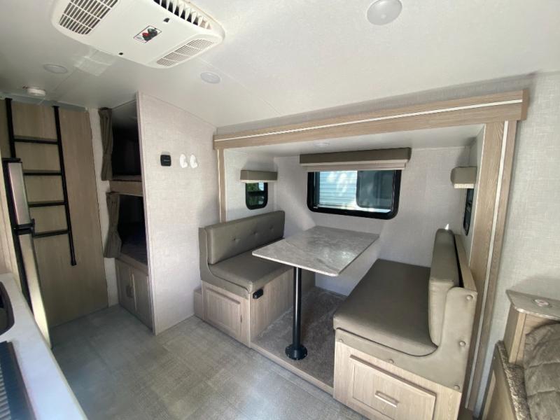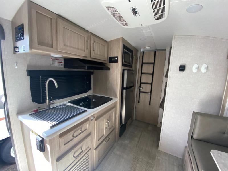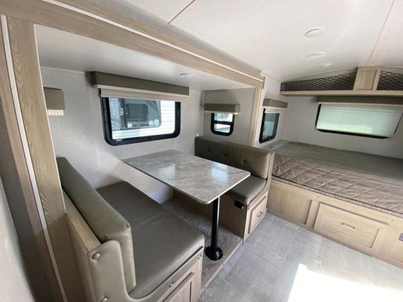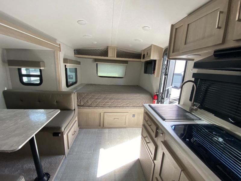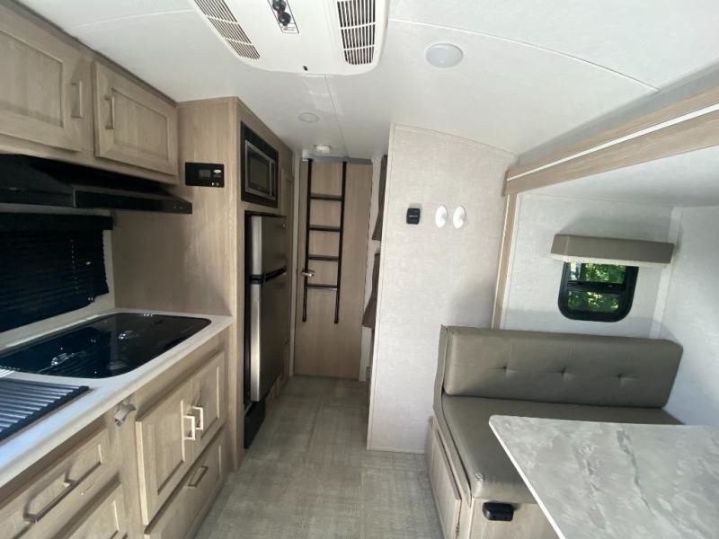 This 21-foot travel trailer offers a queen bed, twin-over-twin bunks, and a slide-out dinette, accommodating up to 5 people. It features a 190W solar panel, power awning with LED lighting, off-road package, and heated holding tanks for off-grid adventures. Inside, you'll find a 3-burner cooktop, microwave, 12V refrigerator, and a full rear bathroom. With a dry weight of 3,513 lbs, it's towable by many mid-size vehicles. Ideal for families seeking a lightweight and well-equipped RV