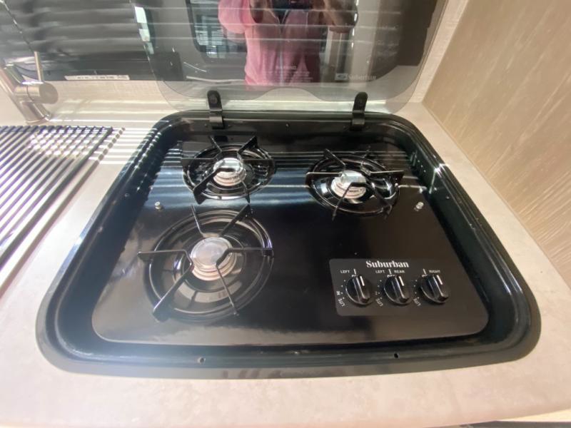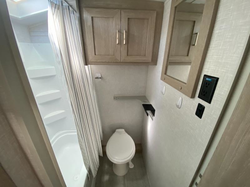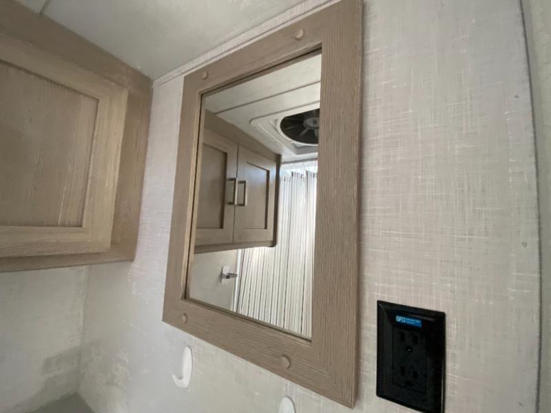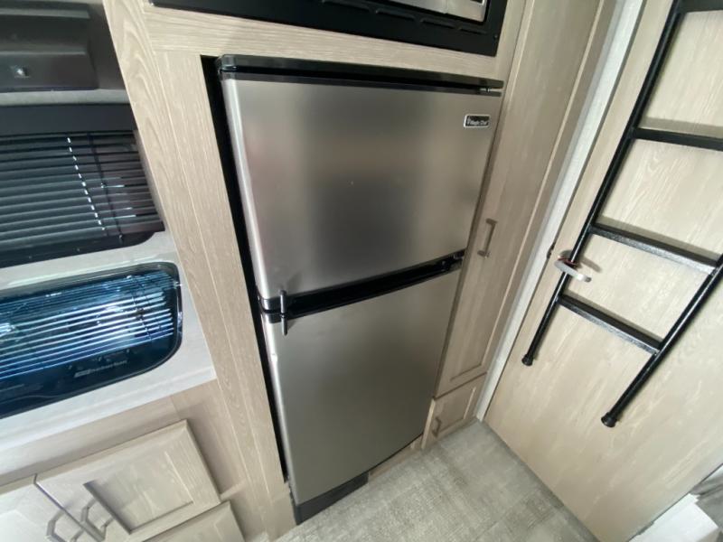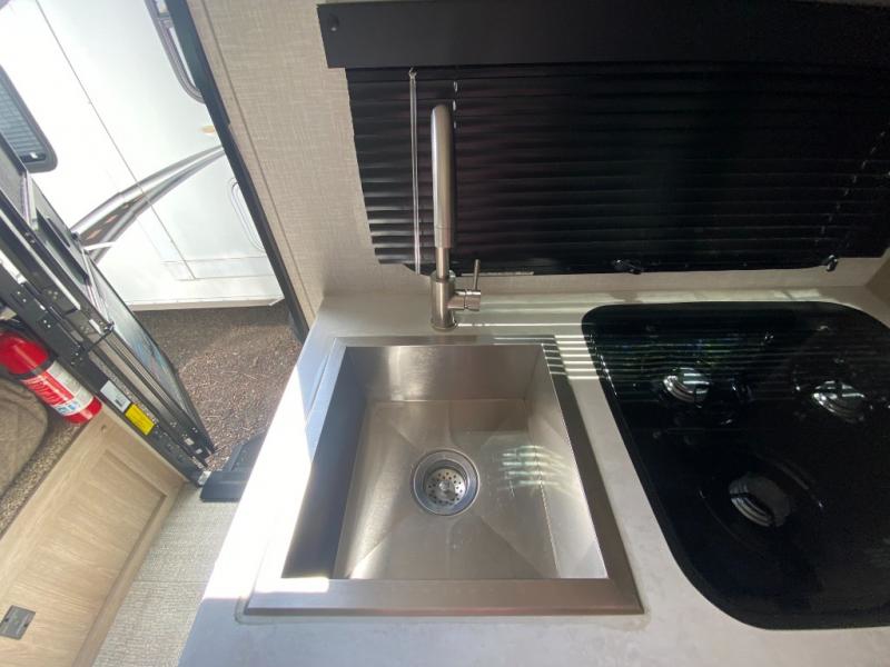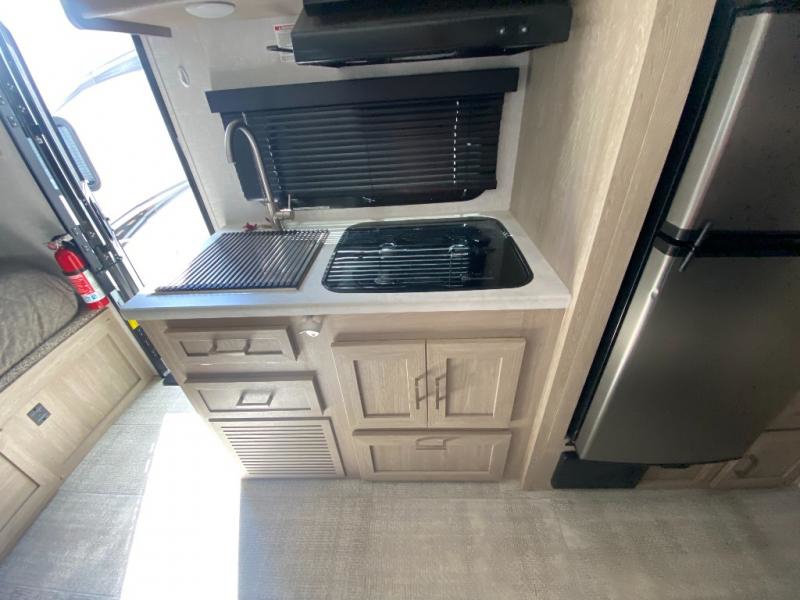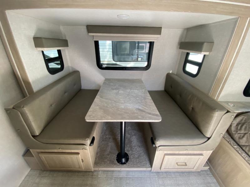 This 21-foot travel trailer offers a queen bed, twin-over-twin bunks, and a slide-out dinette, accommodating up to 5 people. It features a 190W solar panel, power awning with LED lighting, off-road package, and heated holding tanks for off-grid adventures. Inside, you'll find a 3-burner cooktop, microwave, 12V refrigerator, and a full rear bathroom. With a dry weight of 3,513 lbs, it's towable by many mid-size vehicles. Ideal for families seeking a lightweight and well-equipped RV