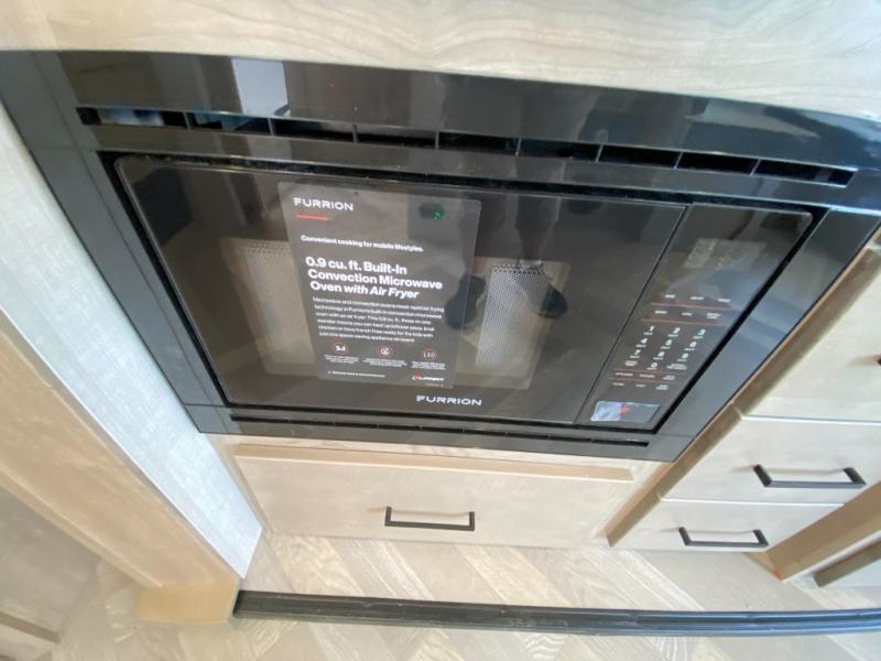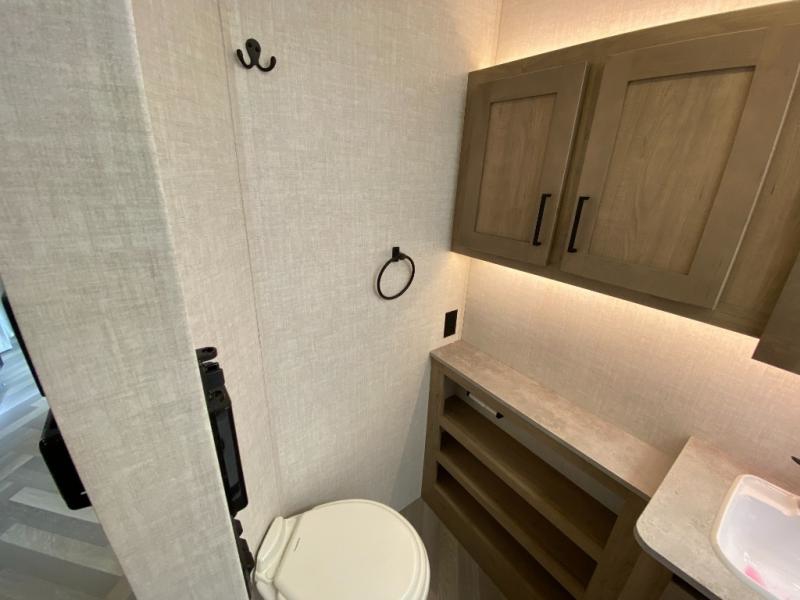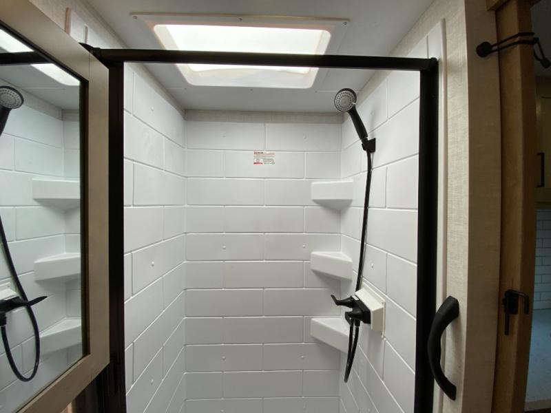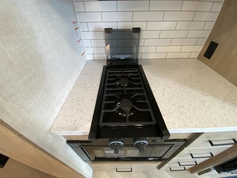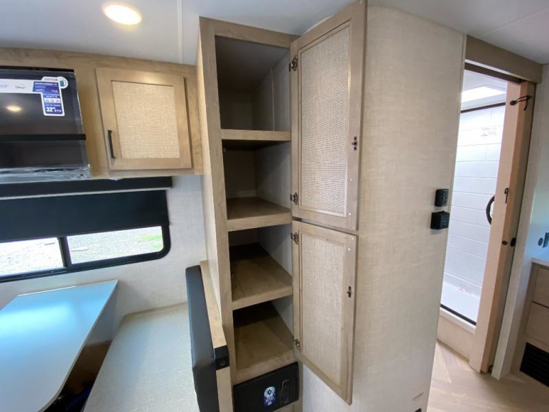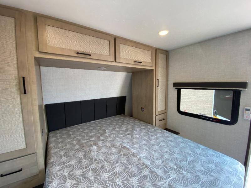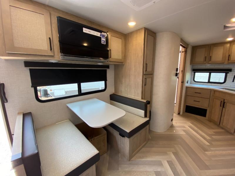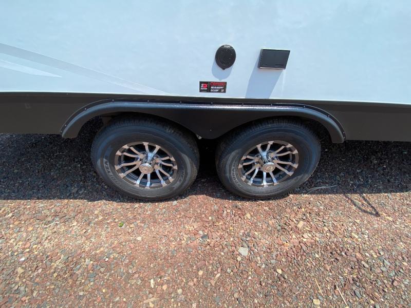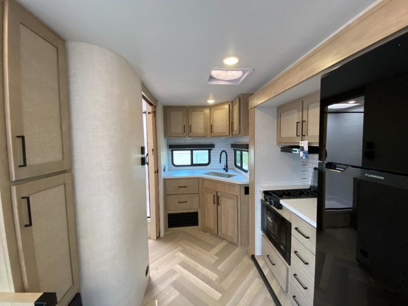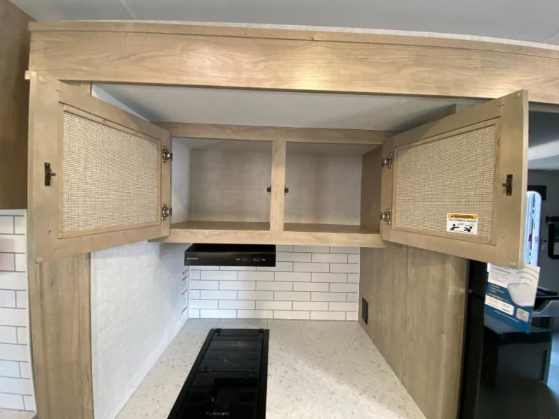 Camping trips just got a whole lot better in this tandem axle, single slide travel trailer! Once you arrive at the campground, you can put out the 18' power awning, grab your camp chairs from the pass-through storage, and relax! When you're getting hungry, head to the rear corner kitchen that includes ample counter space, a two burner cooktop, plus a 10 cu. ft. 12V refrigerator. There is also a pantry to store snacks and paper goods! You can get cozy after dinner on the theater seating that sits directly across from the HDTV for easy viewing, and there is a legless dinette if game night is in order. When you're ready for bed, the queen bed up front will provide a great night's rest, and there is a privacy curtain if you have a guest staying over on the dinette. And don't worry about storage space; this model has you covered with dual bedroom wardrobes, overhead cabinets, and convenient shoe storage!