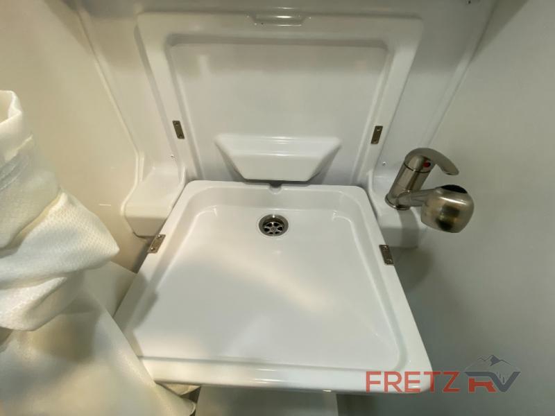 This camper van with a full rear bath will meet your needs surprisingly well. Two twin beds will provide comfortable sleeping space each night, and the lagun table in between the beds will be the perfect place to enjoy breakfast together. There is a bath wardrobe to keep your clothes tidy, plus you'll find overhead cabinets above the beds and additional storage just as you enter the coach for your belongings. This coach also includes swivel captain's seats with a removable table for even more seating and dining space.