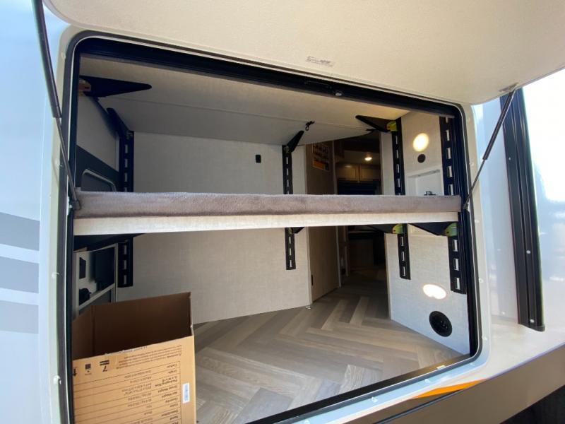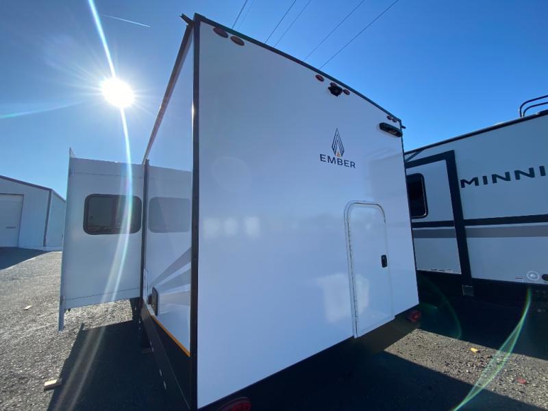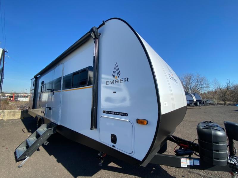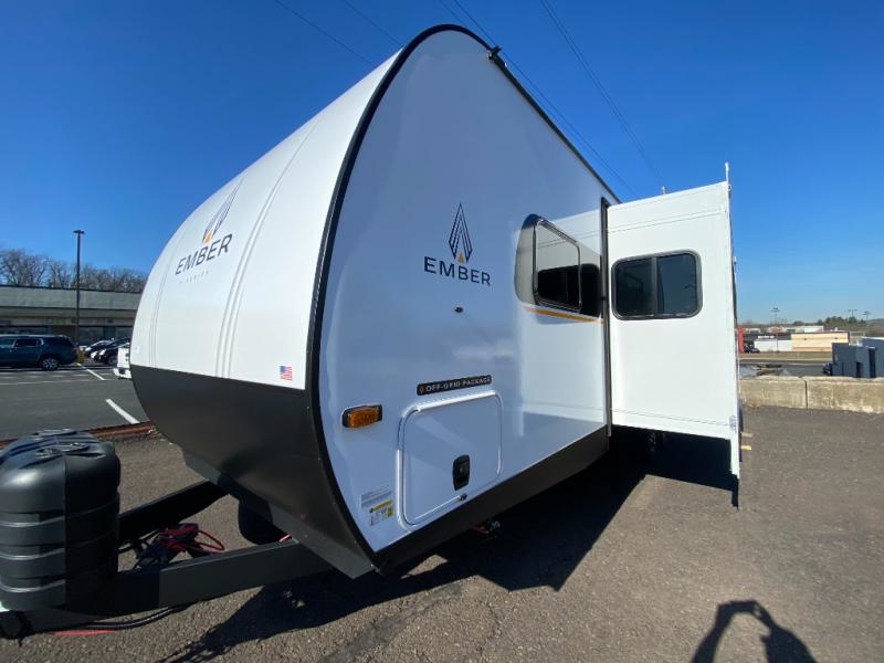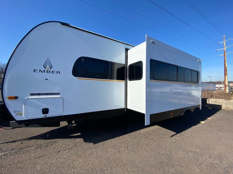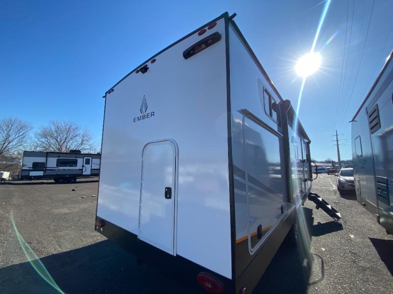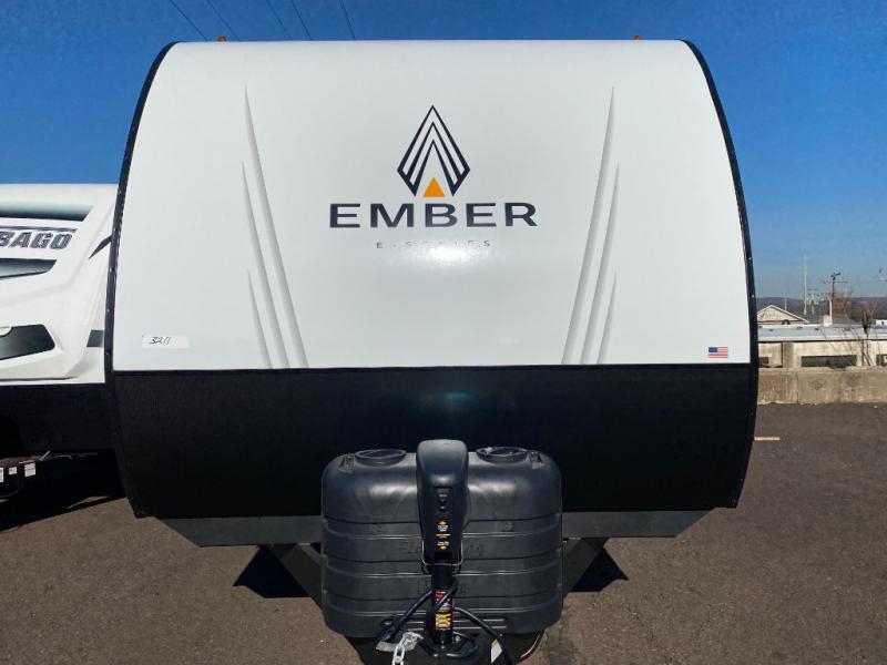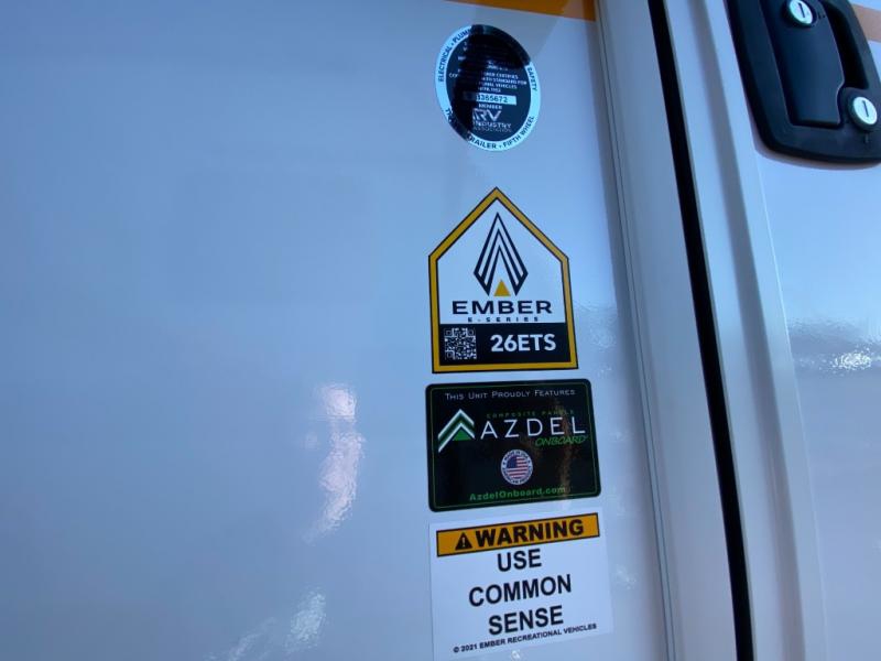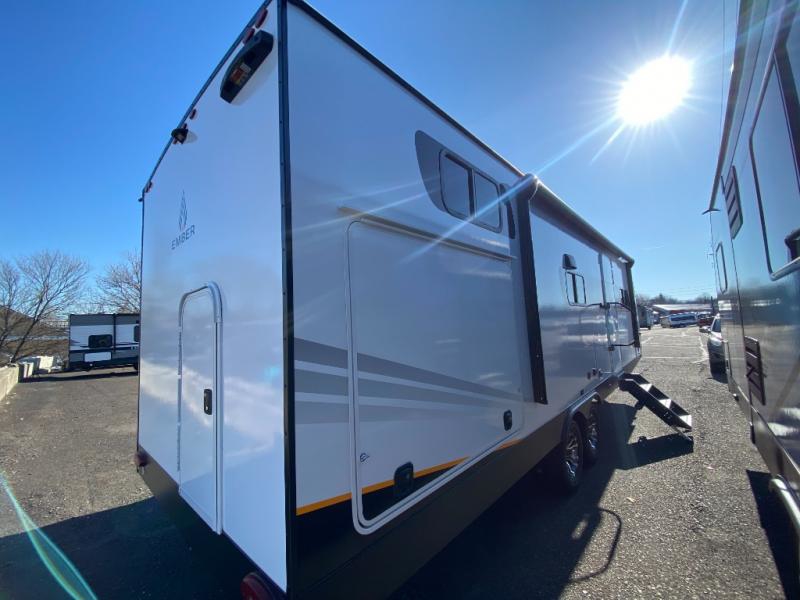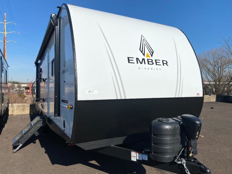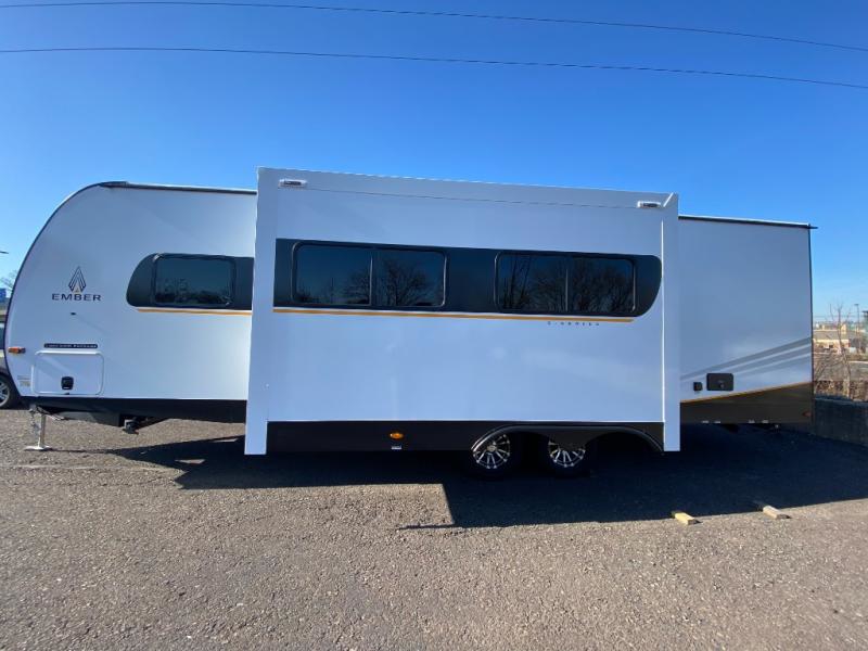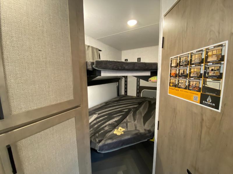 This model resembles 22ETS, but you'll enjoy added theater seating and a larger exterior length for more interior space! The patent-pending repositionable EmberTrack E-Track bunk/storage system includes 74" x 45" cargo space, and there are multiple single/double bunk configurations to fit your needs. The front walk-around true residential queen bed includes dual nightstands and dual wardrobes, and you'll appreciate sliding doors that makes a private bedroom. This E-Series kitchen includes an air fryer convection microwave, a two burner cooktop, plus a breakfast bar with bar stools so you can visit with the chef as they cook meals. A legless dinette will provide a place to dine, or you can take your plate outdoors to sit under the 18' power awning with a dimmable LED light. You'll also find a pass-through storage outside, along with a docking station and a kayak/bike storage door!