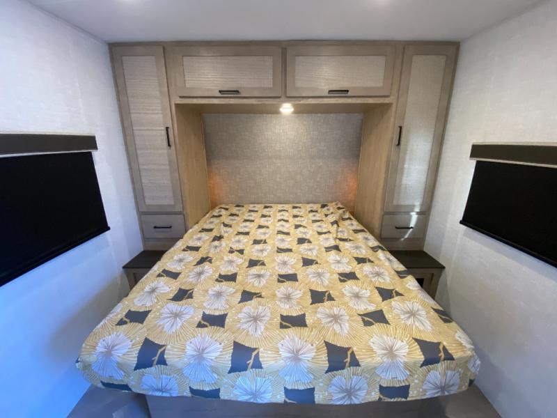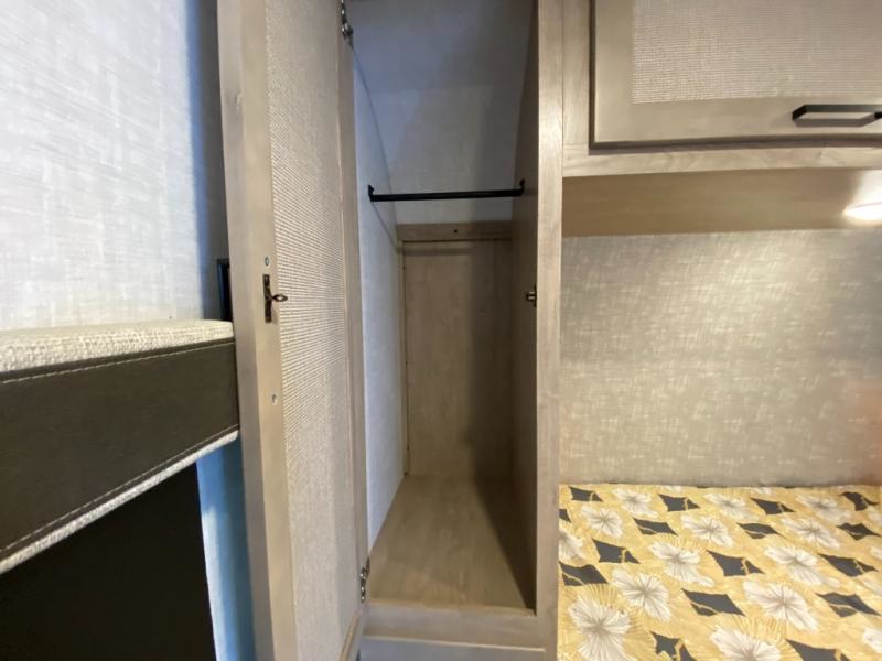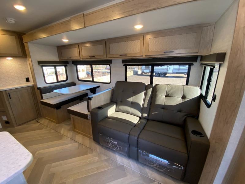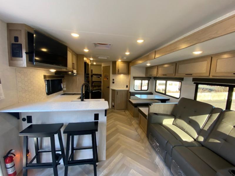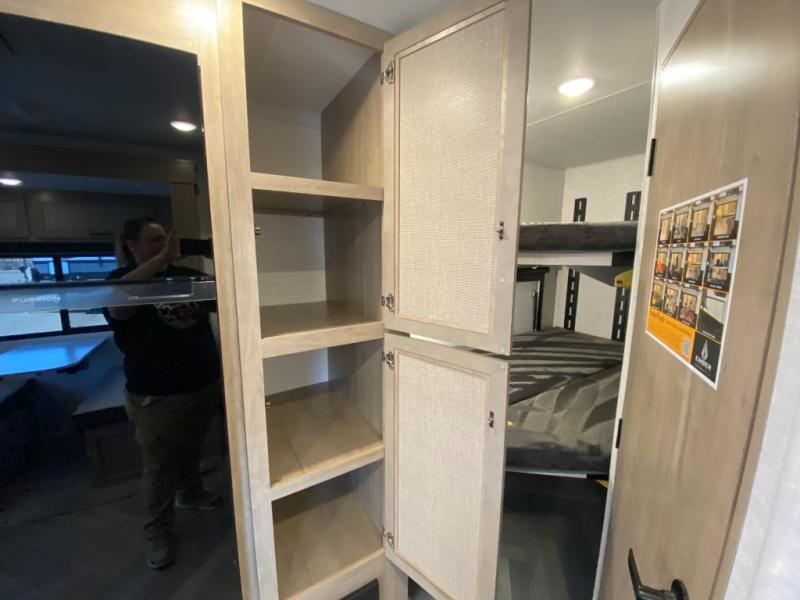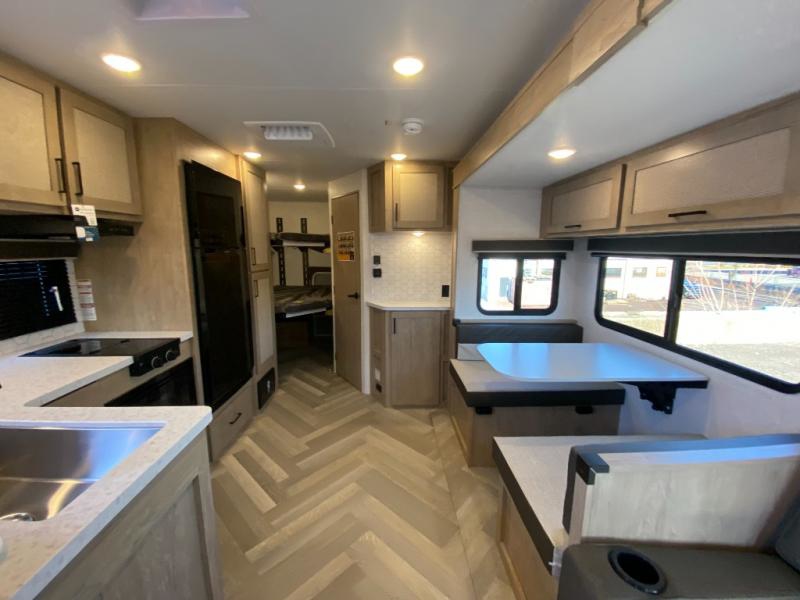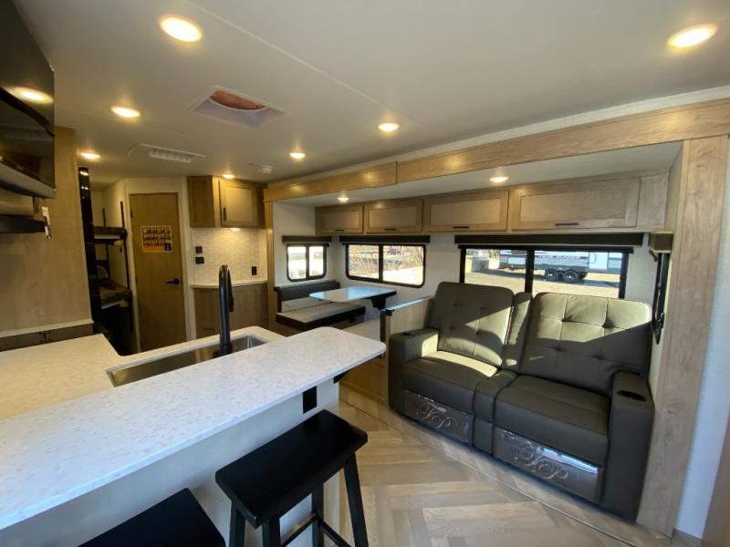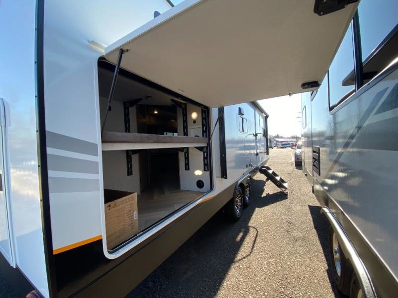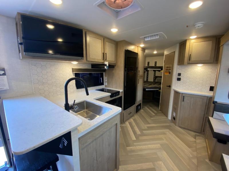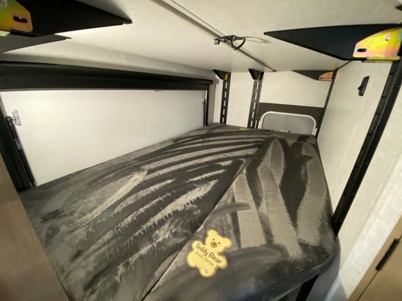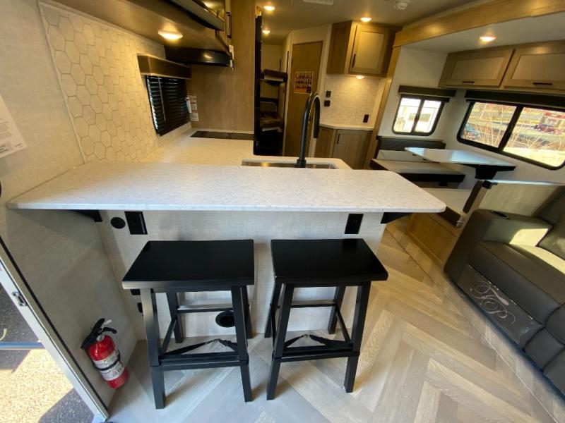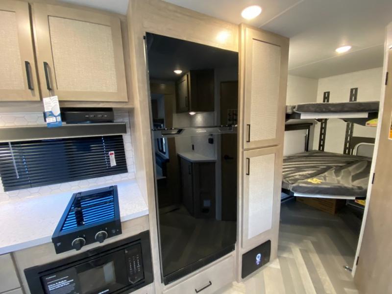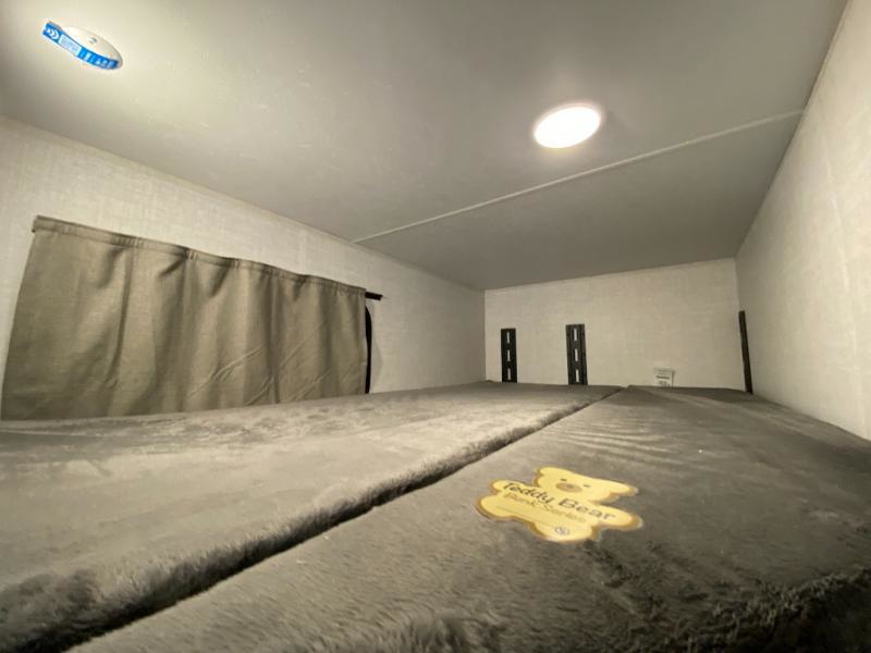 This model resembles 22ETS, but you'll enjoy added theater seating and a larger exterior length for more interior space! The patent-pending repositionable EmberTrack E-Track bunk/storage system includes 74" x 45" cargo space, and there are multiple single/double bunk configurations to fit your needs. The front walk-around true residential queen bed includes dual nightstands and dual wardrobes, and you'll appreciate sliding doors that makes a private bedroom. This E-Series kitchen includes an air fryer convection microwave, a two burner cooktop, plus a breakfast bar with bar stools so you can visit with the chef as they cook meals. A legless dinette will provide a place to dine, or you can take your plate outdoors to sit under the 18' power awning with a dimmable LED light. You'll also find a pass-through storage outside, along with a docking station and a kayak/bike storage door!