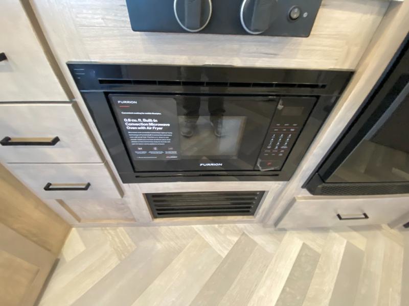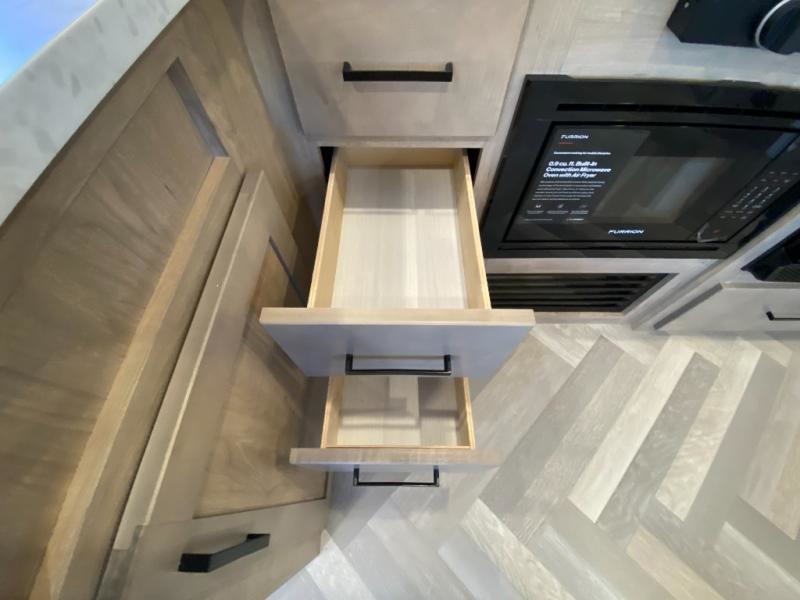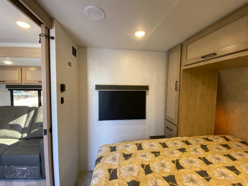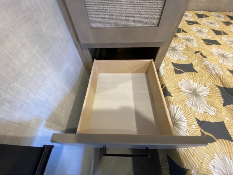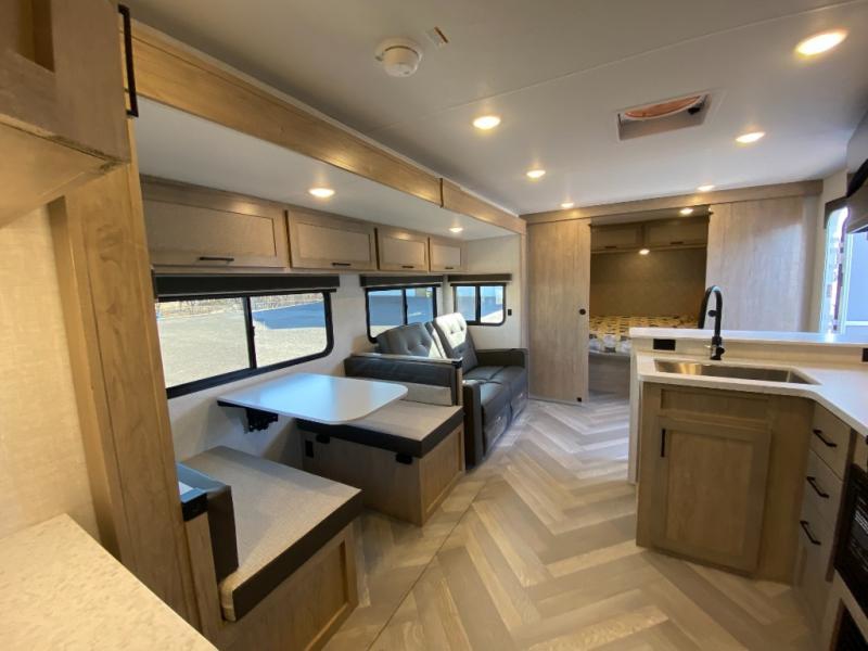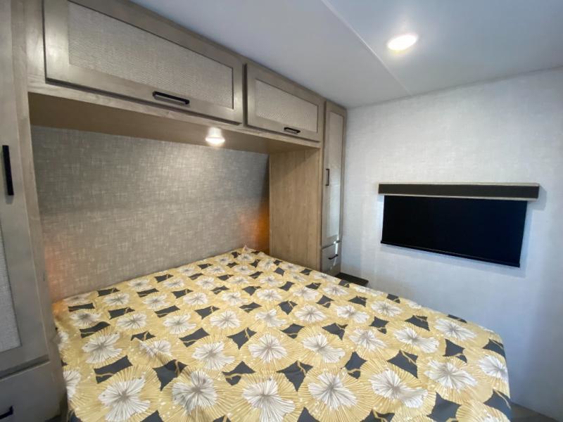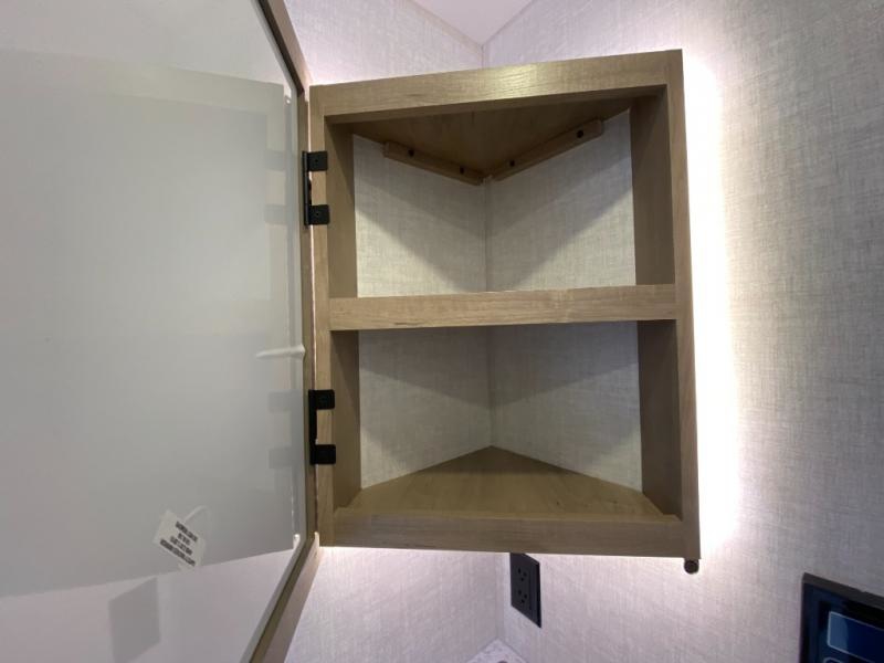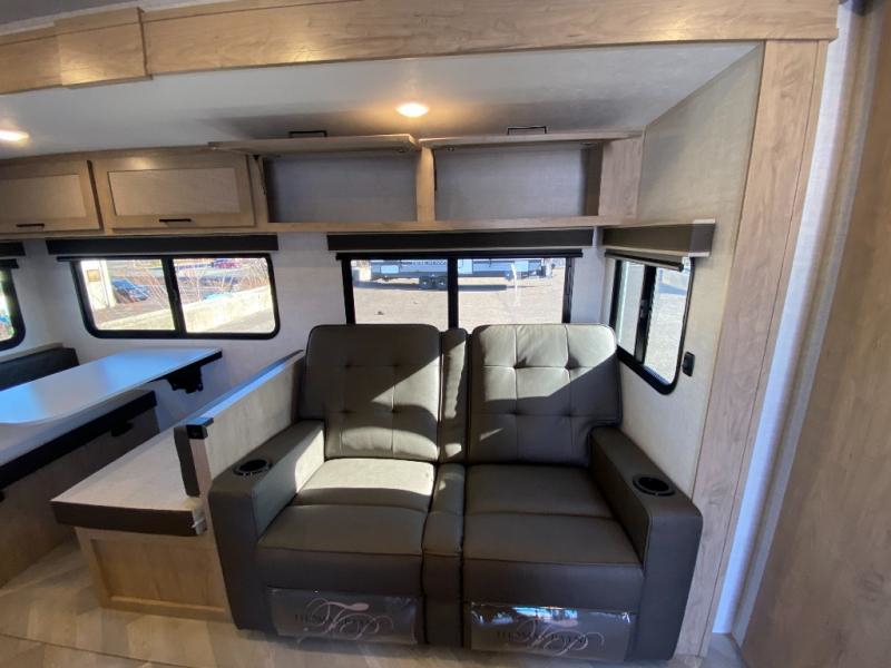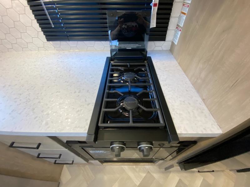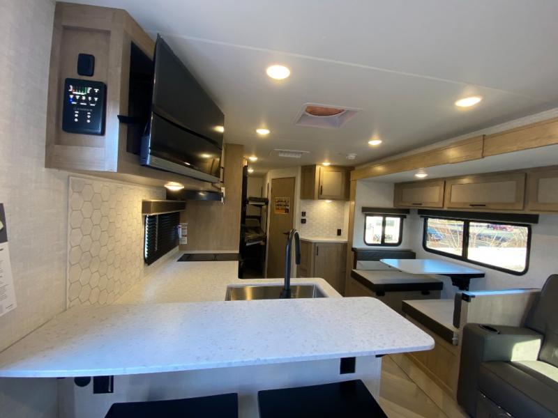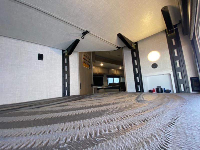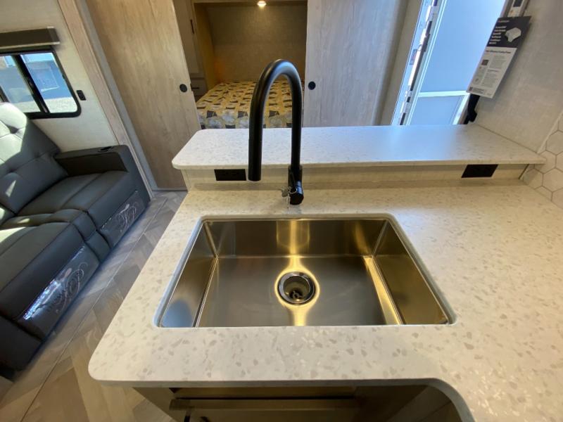 This model resembles 22ETS, but you'll enjoy added theater seating and a larger exterior length for more interior space! The patent-pending repositionable EmberTrack E-Track bunk/storage system includes 74" x 45" cargo space, and there are multiple single/double bunk configurations to fit your needs. The front walk-around true residential queen bed includes dual nightstands and dual wardrobes, and you'll appreciate sliding doors that makes a private bedroom. This E-Series kitchen includes an air fryer convection microwave, a two burner cooktop, plus a breakfast bar with bar stools so you can visit with the chef as they cook meals. A legless dinette will provide a place to dine, or you can take your plate outdoors to sit under the 18' power awning with a dimmable LED light. You'll also find a pass-through storage outside, along with a docking station and a kayak/bike storage door!