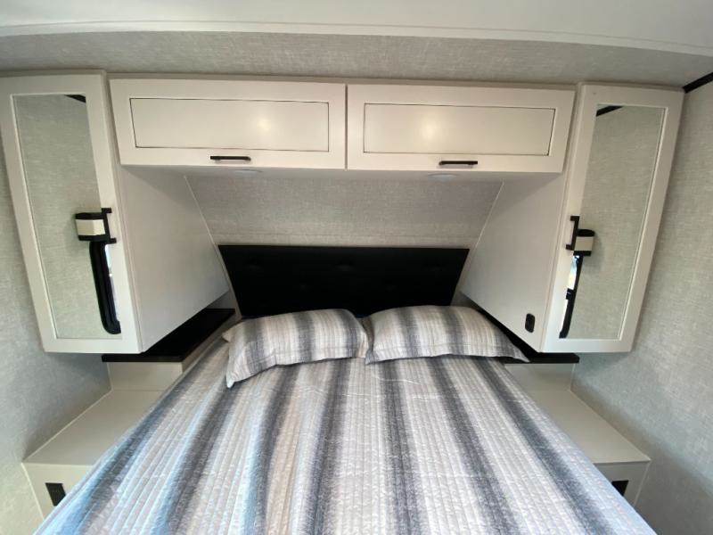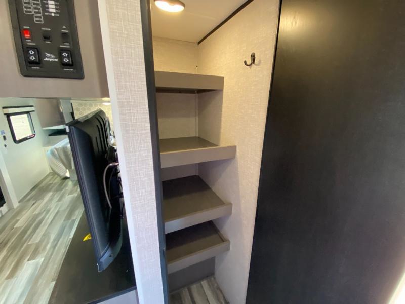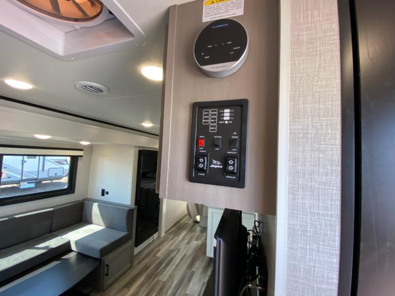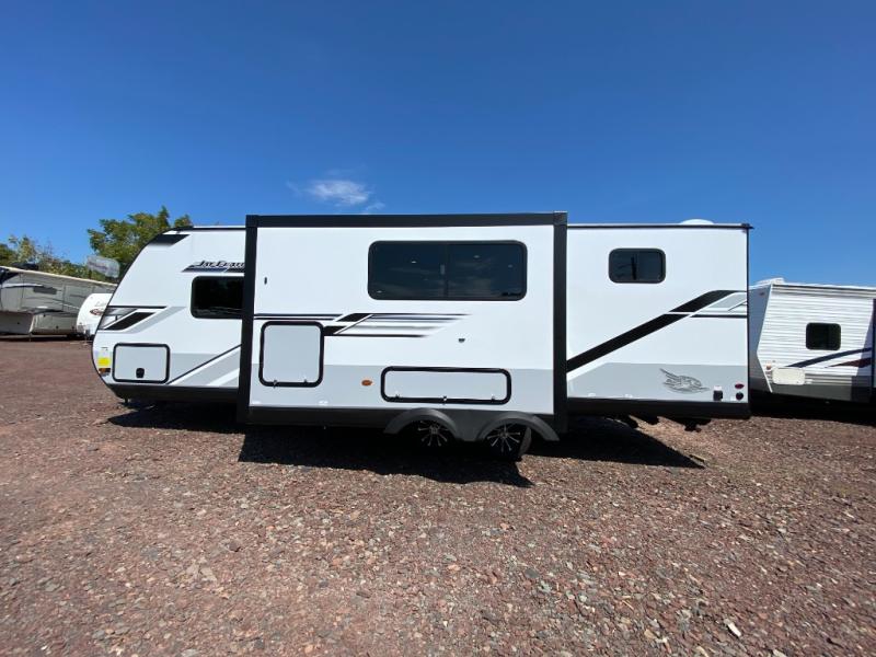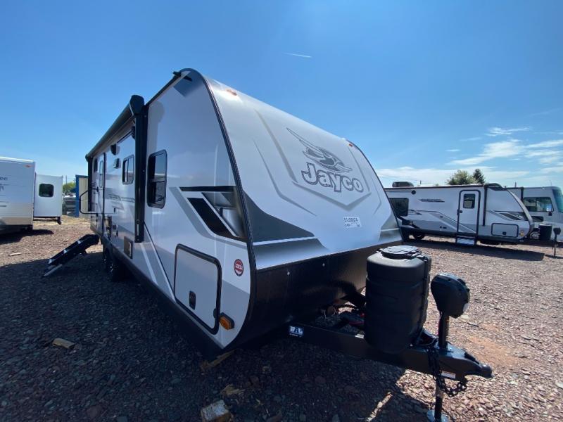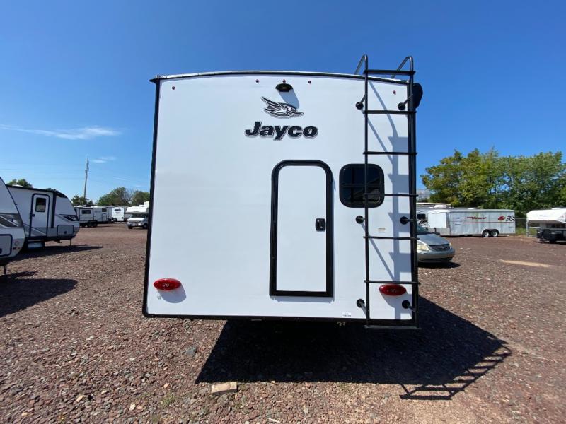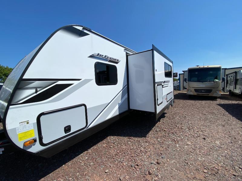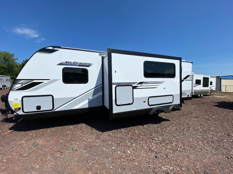 With any Jay Feather travel trailer by Jayco, you will enjoy lightweight towing, convenient exterior amenities, and at-home comforts inside! The Overlander 1 Solar Package included within the Jay Sport Package comes with a 200W solar panel and a 30-amp digital controller so you can enjoy some off-grid camping. There is also a modern graphics package with a dual-colored sidewall, LCI Solid Step fold-down aluminum tread steps on the main entry door, and Climate Shield 0 -100° F tested weather insulation package that will allow you to camp in all sorts of climates. The Customer Value Package will make time outdoors easier than ever with a power tongue jack and a Rock Solid stabilizer system, plus American-made nitro-filled Goodyear tires with self-adjusting electric brakes. More exterior features include a Keyed-Alike locking system, marine grade exterior speakers, a Magnum Truss roof system, and the list goes on! And we haven't even touched on the interior comforts, like the residential style seamless countertops and vinyl flooring throughout, decorative backsplash, handcrafted hardwood door/drawer fronts, and multiple USB charging ports to keep you going!