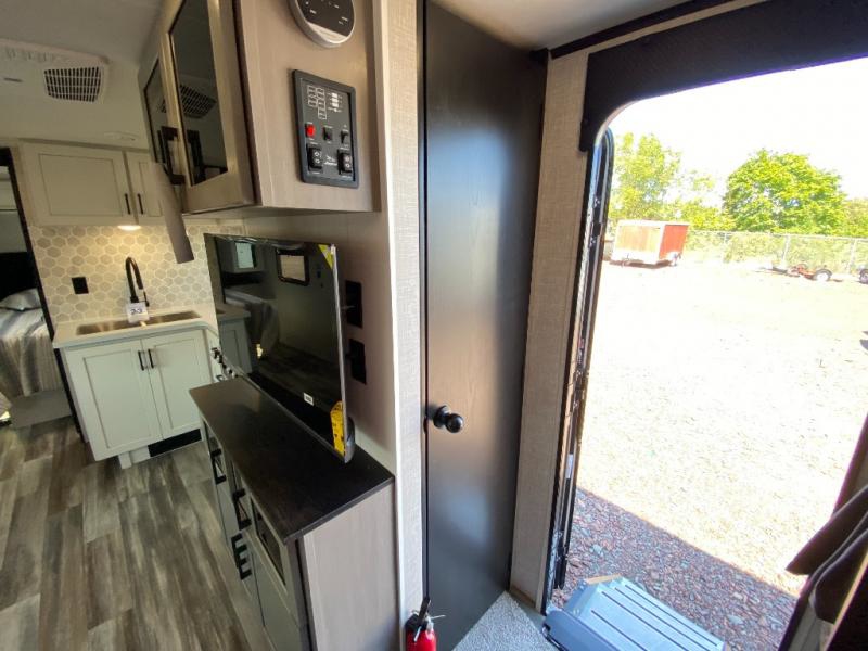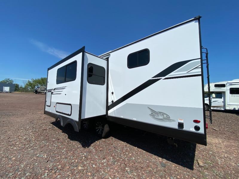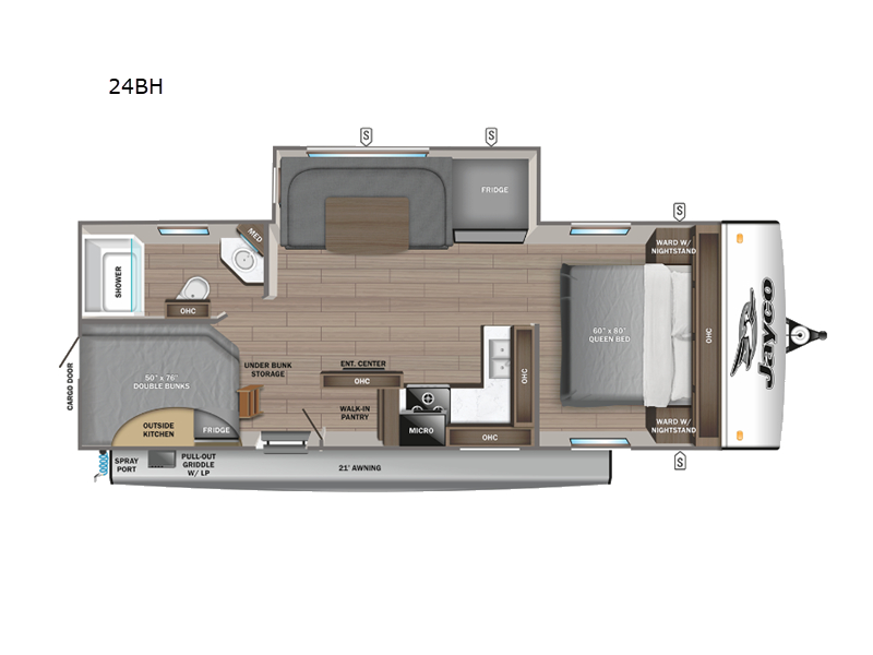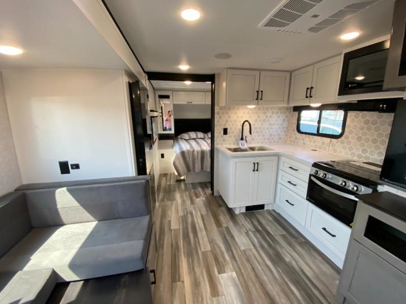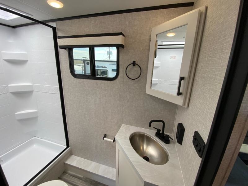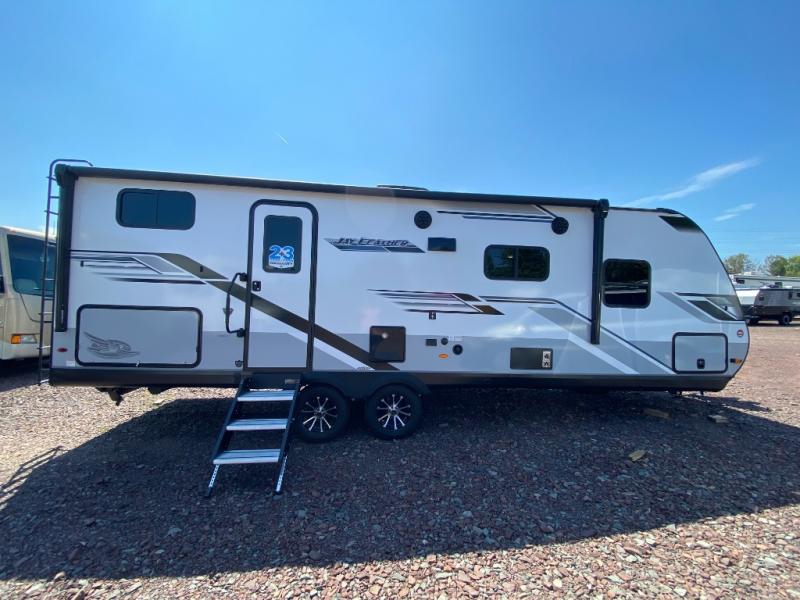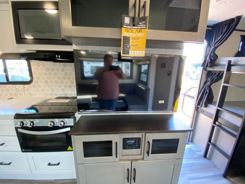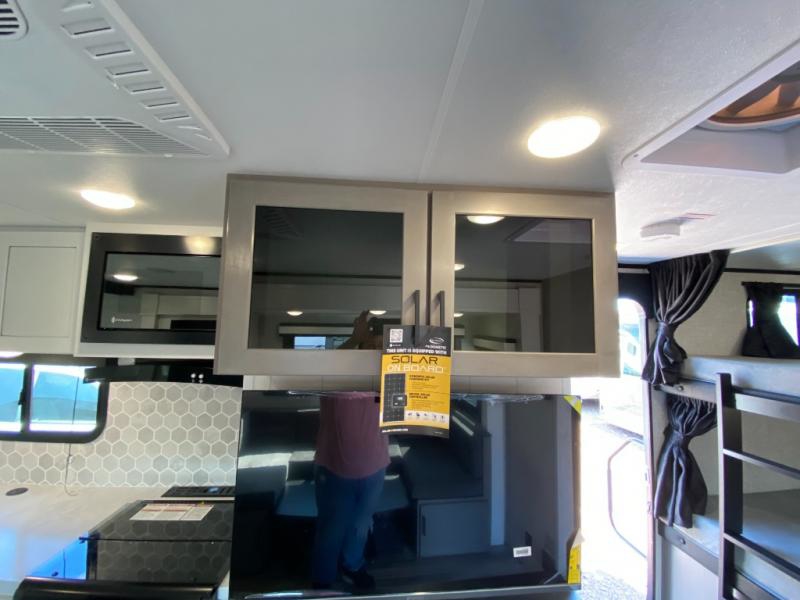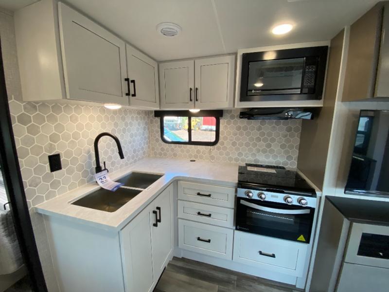 With any Jay Feather travel trailer by Jayco, you will enjoy lightweight towing, convenient exterior amenities, and at-home comforts inside! The Overlander 1 Solar Package included within the Jay Sport Package comes with a 200W solar panel and a 30-amp digital controller so you can enjoy some off-grid camping. There is also a modern graphics package with a dual-colored sidewall, LCI Solid Step fold-down aluminum tread steps on the main entry door, and Climate Shield 0 -100° F tested weather insulation package that will allow you to camp in all sorts of climates. The Customer Value Package will make time outdoors easier than ever with a power tongue jack and a Rock Solid stabilizer system, plus American-made nitro-filled Goodyear tires with self-adjusting electric brakes. More exterior features include a Keyed-Alike locking system, marine grade exterior speakers, a Magnum Truss roof system, and the list goes on! And we haven't even touched on the interior comforts, like the residential style seamless countertops and vinyl flooring throughout, decorative backsplash, handcrafted hardwood door/drawer fronts, and multiple USB charging ports to keep you going!