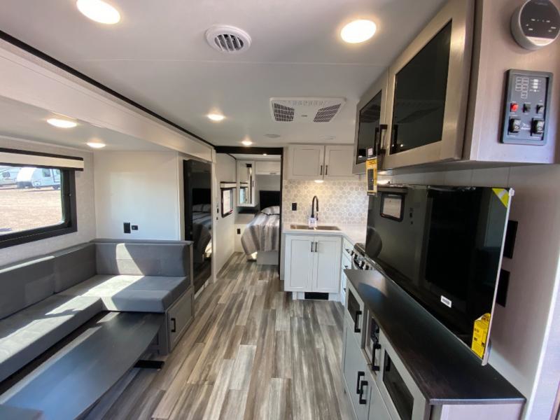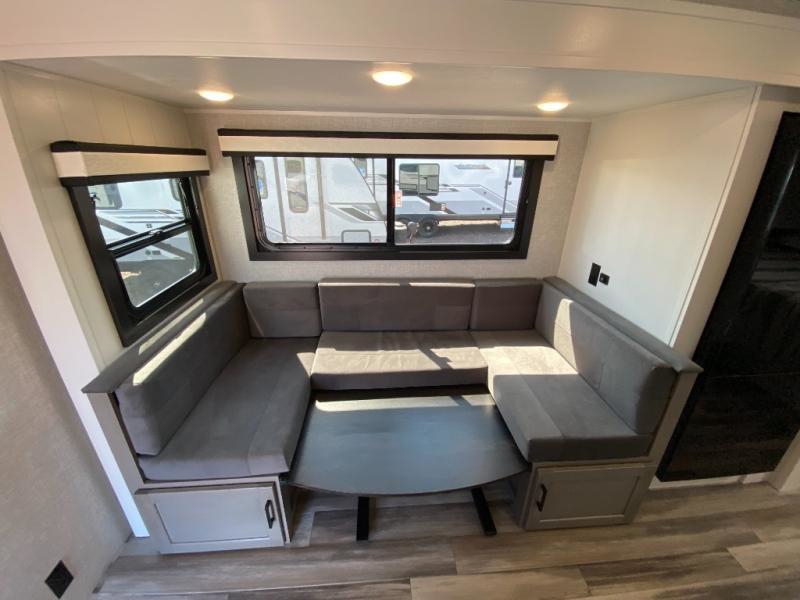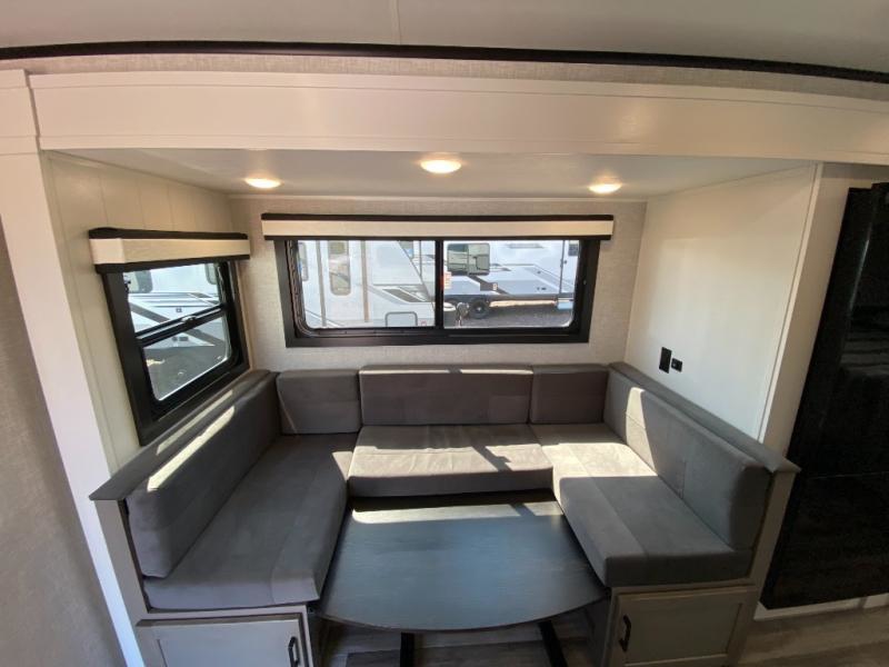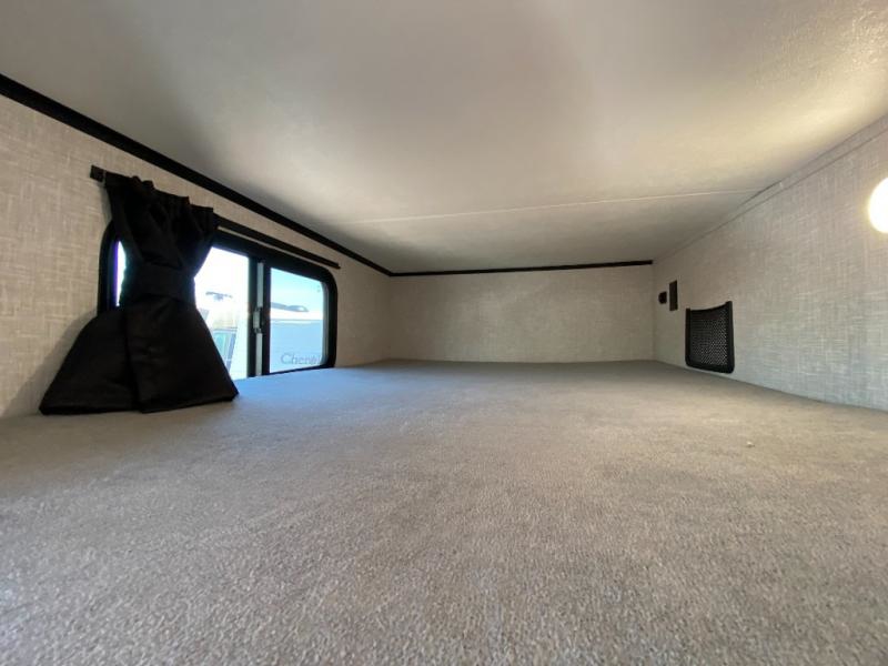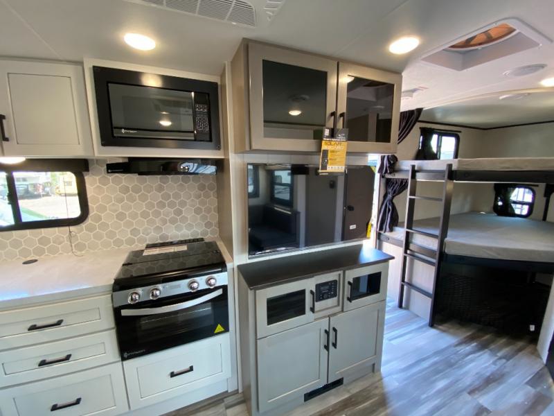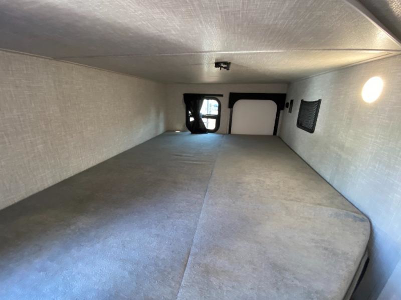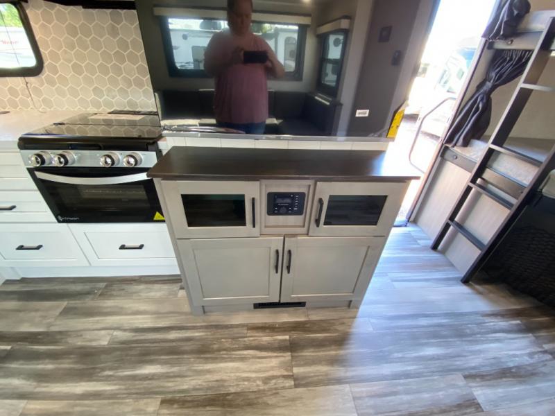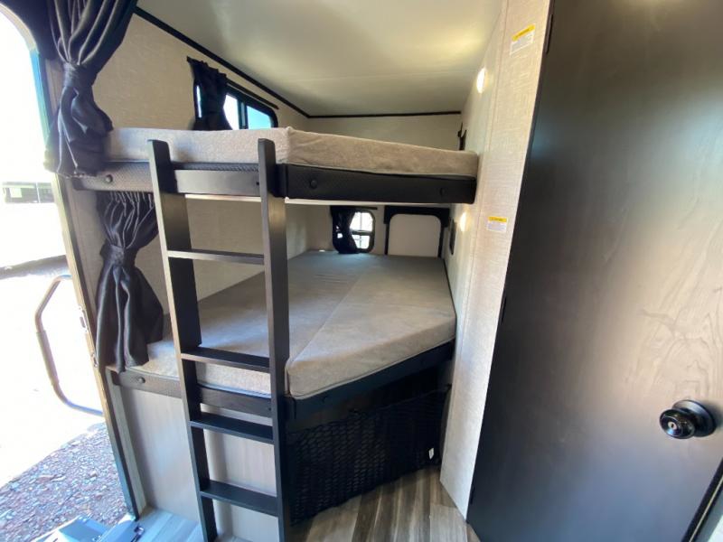 There is so much to love about this trailer from the double-size bunks in the rear with a ladder for easy access, plus the cargo door that allows you to stow larger items from the exterior to the interior underneath the bunks. You also have exterior storage compartments for outdoor gear. And the cook can choose to make meals using the outside kitchen including a refrigerator to store some cold items or the inside kitchen with full amenities including an 11 cu. ft. 12V refrigerator and ample counter space. The walk-in pantry is a nice feature as well especially when you have a big crew. There is a private bedroom up front with a queen bed and dual wardrobes for your things, and any other guests can sleep on the U-shaped dinette in the main living area!