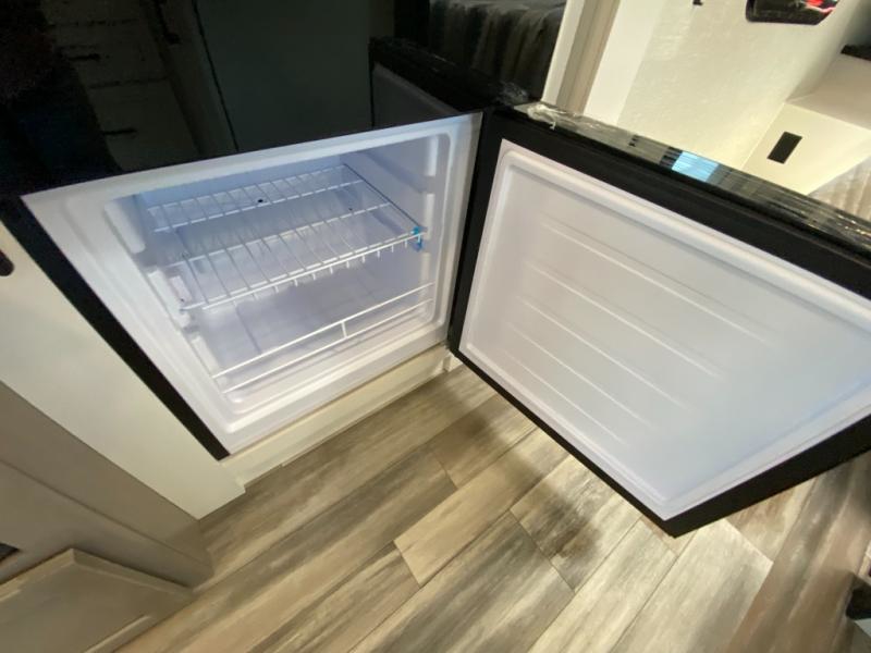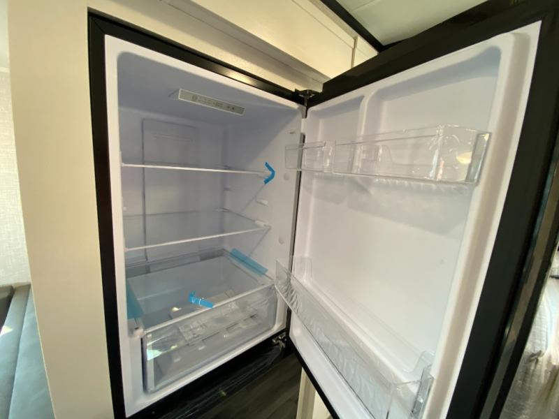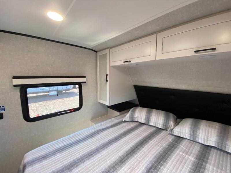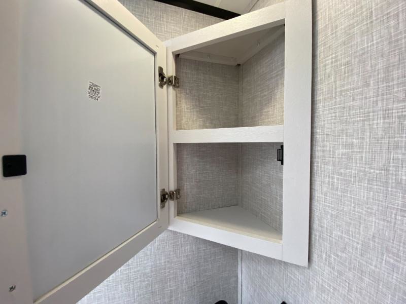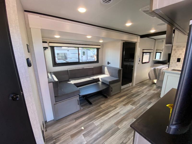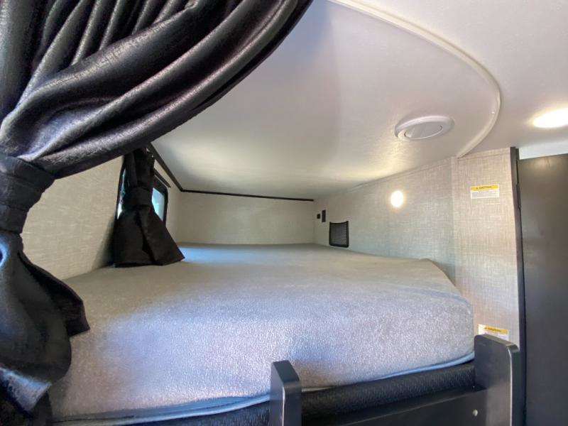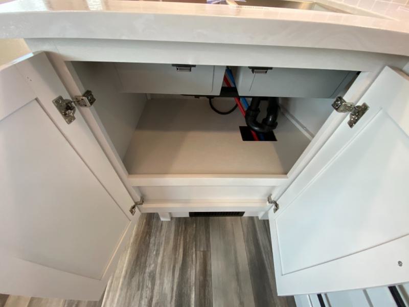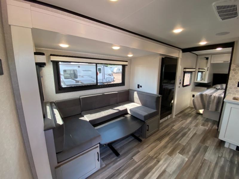 There is so much to love about this trailer from the double-size bunks in the rear with a ladder for easy access, plus the cargo door that allows you to stow larger items from the exterior to the interior underneath the bunks. You also have exterior storage compartments for outdoor gear. And the cook can choose to make meals using the outside kitchen including a refrigerator to store some cold items or the inside kitchen with full amenities including an 11 cu. ft. 12V refrigerator and ample counter space. The walk-in pantry is a nice feature as well especially when you have a big crew. There is a private bedroom up front with a queen bed and dual wardrobes for your things, and any other guests can sleep on the U-shaped dinette in the main living area!