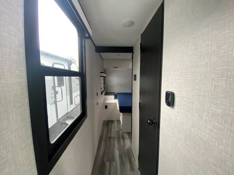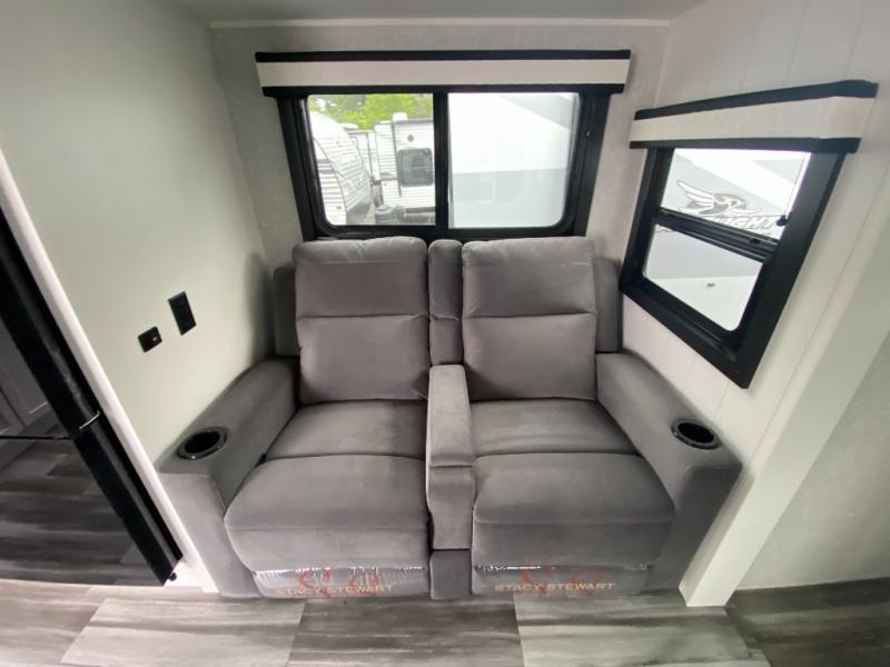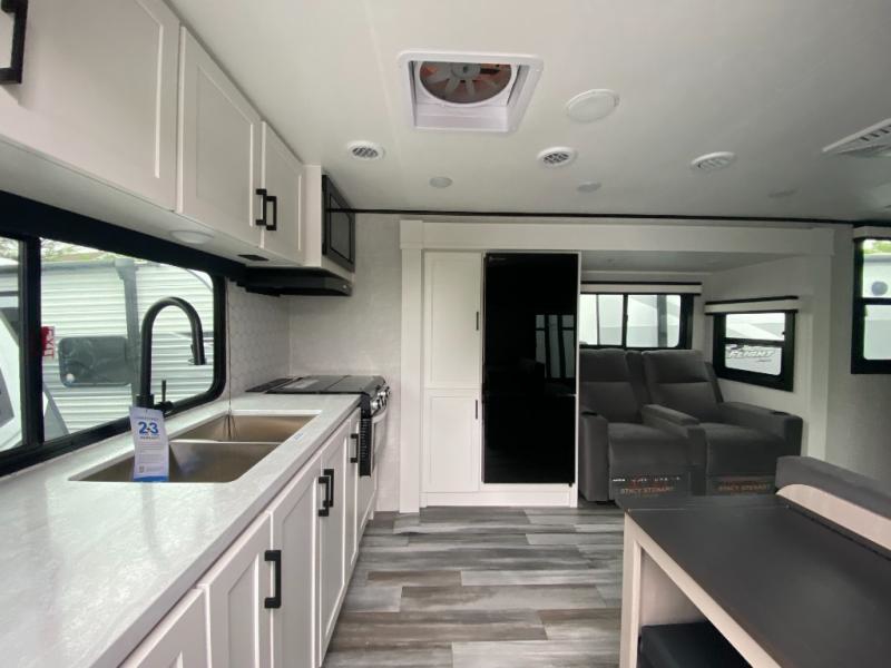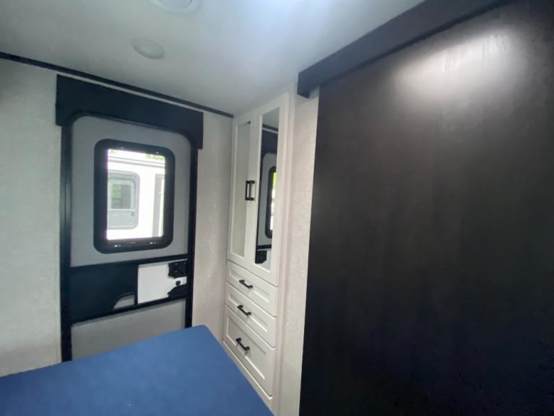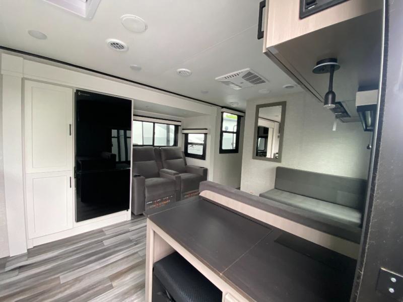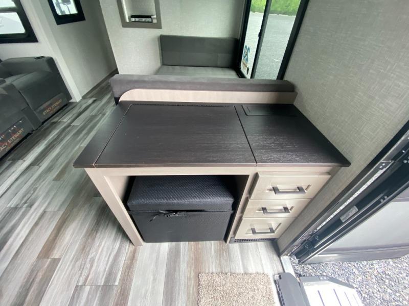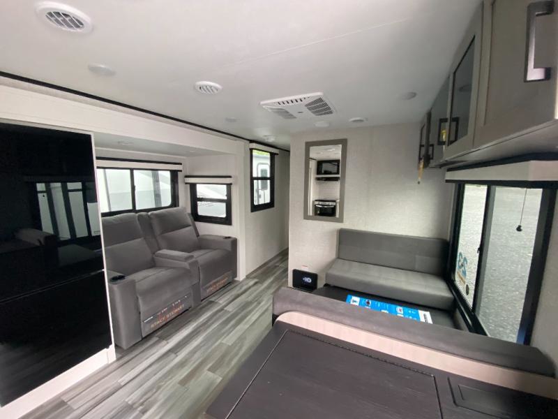 The chef of your group will love this rear kitchen trailer with generous counter space to prep meals! Your crew can dine at the booth dinette or under the 20' power awning with LED lights, and when you're ready to relax, the theater seat with table trays will provide comfort. There is also a storage/desk cabinet with a pull-out ottoman that will allow you to utilize this space however you need it! The spacious full bath will let you clean up each day, and the front private bedroom is sure to make you feel at home. Here, you'll find a queen bed, three wardrobes, plus one of the dual entry doors for added convenience!