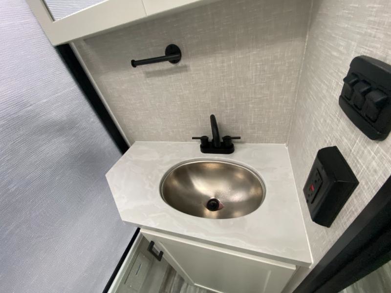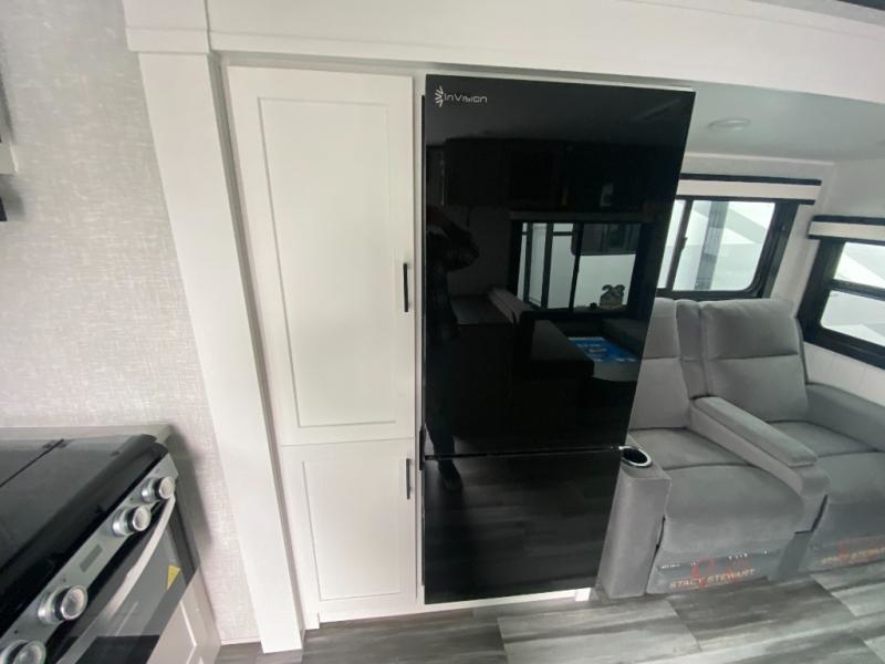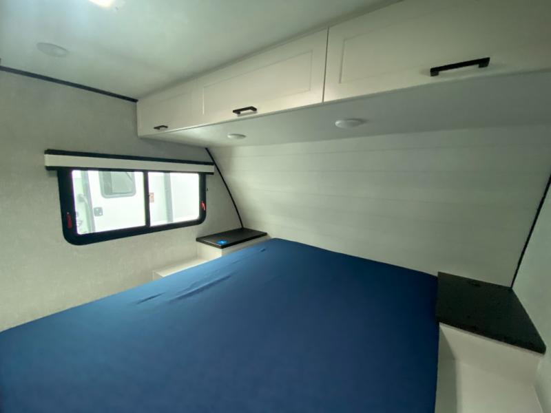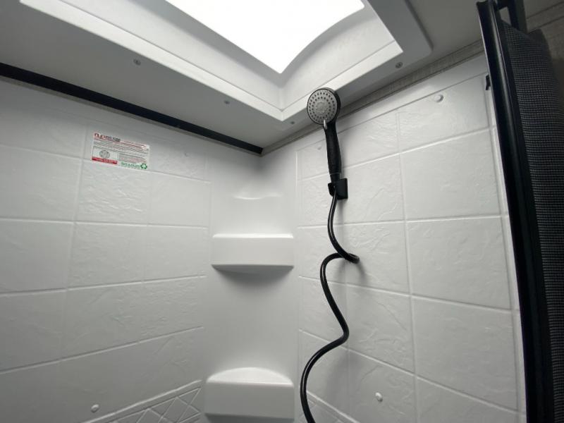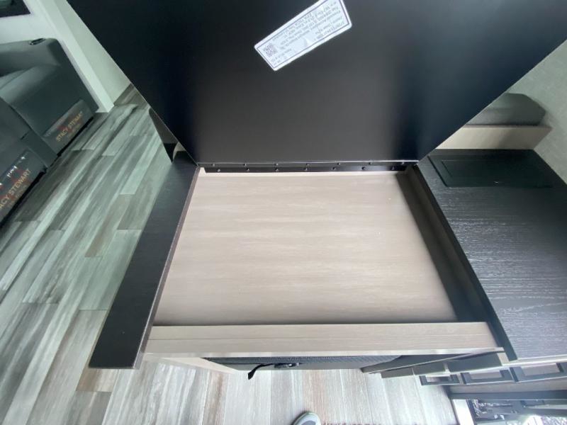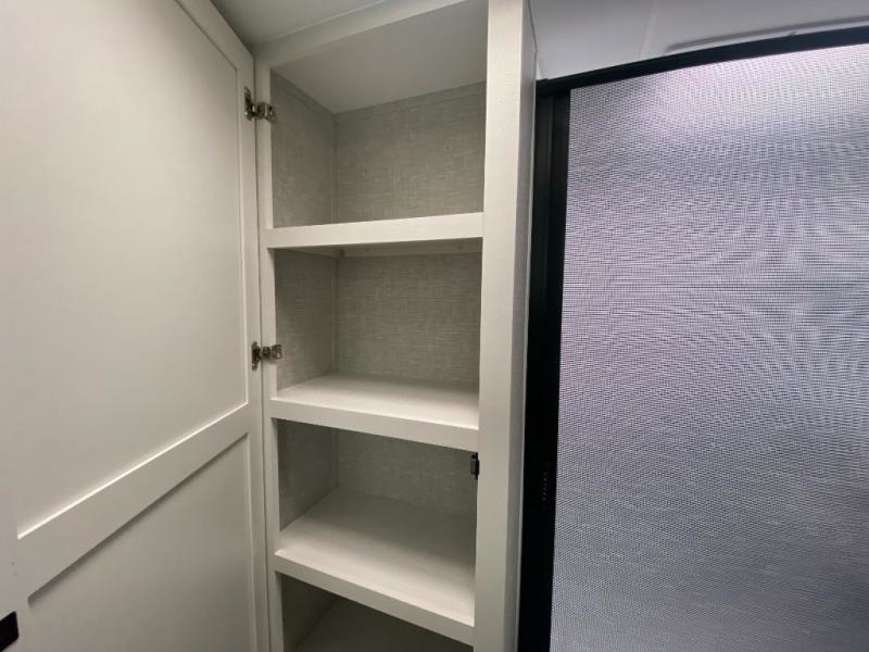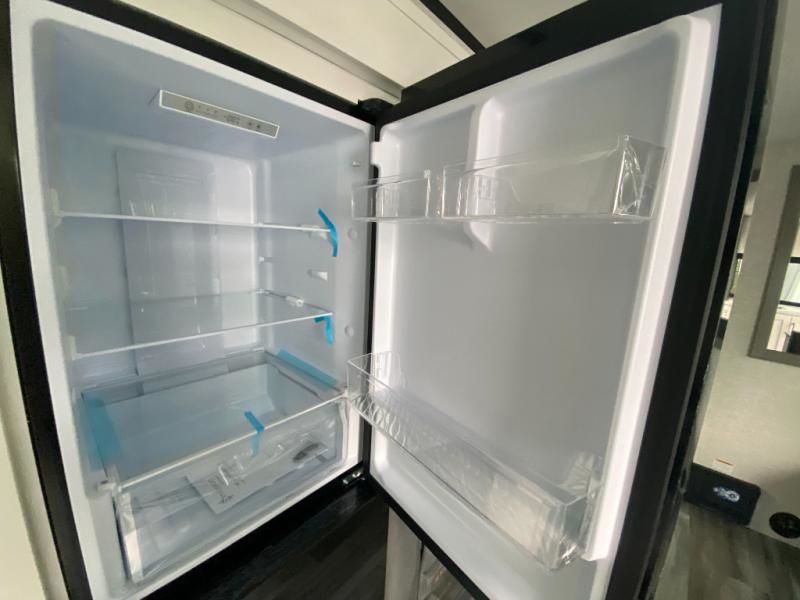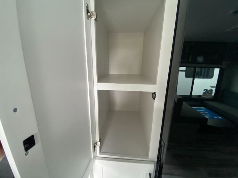 The chef of your group will love this rear kitchen trailer with generous counter space to prep meals! Your crew can dine at the booth dinette or under the 20' power awning with LED lights, and when you're ready to relax, the theater seat with table trays will provide comfort. There is also a storage/desk cabinet with a pull-out ottoman that will allow you to utilize this space however you need it! The spacious full bath will let you clean up each day, and the front private bedroom is sure to make you feel at home. Here, you'll find a queen bed, three wardrobes, plus one of the dual entry doors for added convenience!
