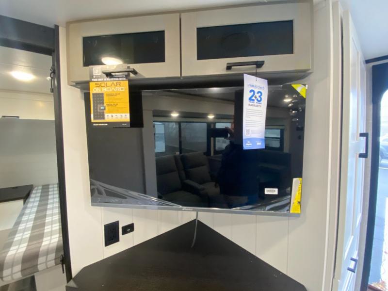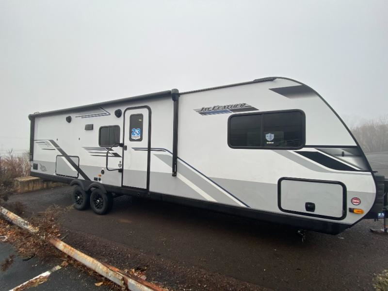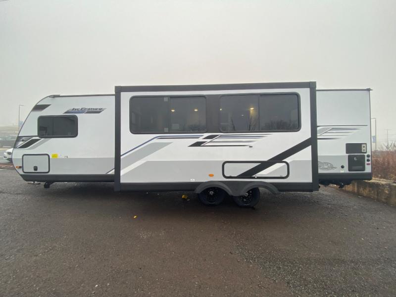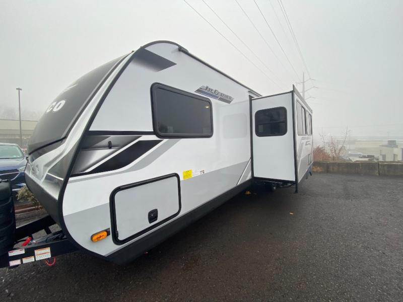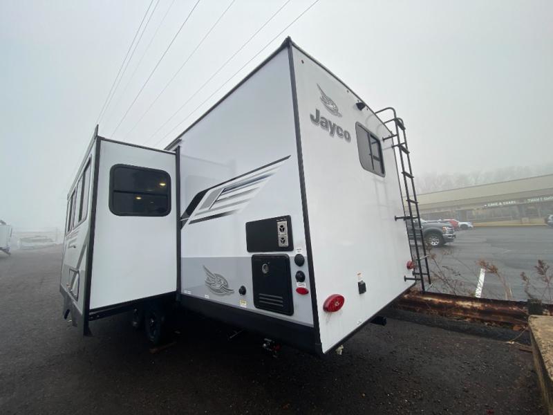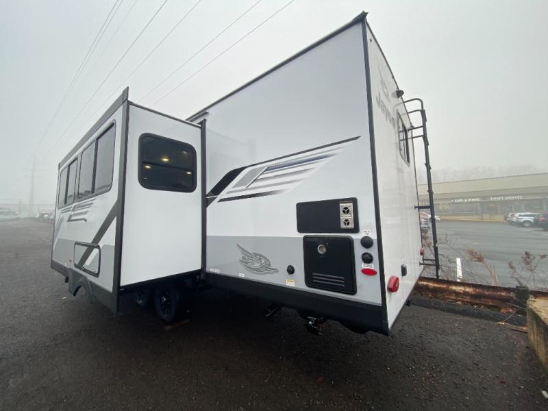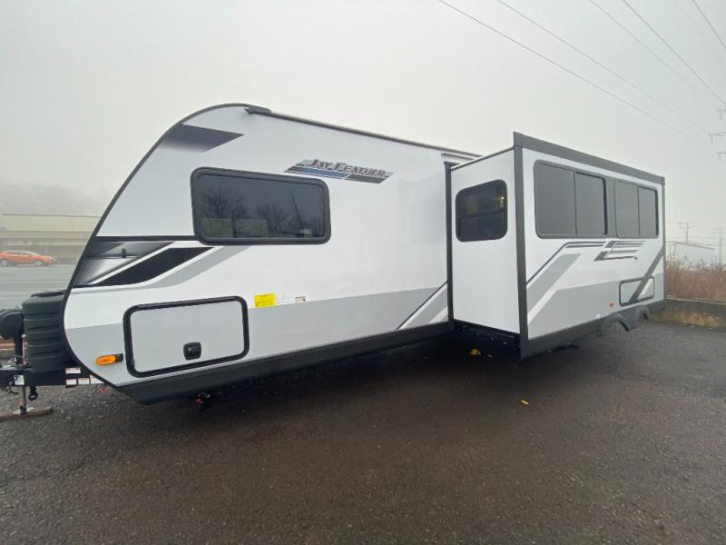 With any Jay Feather travel trailer by Jayco, you will enjoy lightweight towing, convenient exterior amenities, and at-home comforts inside! The Overlander 1 Solar Package included within the Jay Sport Package comes with a 200W solar panel and a 30-amp digital controller so you can enjoy some off-grid camping. There is also a modern graphics package with a dual-colored sidewall, LCI Solid Step fold-down aluminum tread steps on the main entry door, and Climate Shield 0 -100° F tested weather insulation package that will allow you to camp in all sorts of climates. The Customer Value Package will make time outdoors easier than ever with a power tongue jack and a Rock Solid stabilizer system, plus American-made nitro-filled Goodyear tires with self-adjusting electric brakes. More exterior features include a Keyed-Alike locking system, marine grade exterior speakers, a Magnum Truss roof system, and the list goes on! And we haven't even touched on the interior comforts, like the residential style seamless countertops and vinyl flooring throughout, decorative backsplash, handcrafted hardwood door/drawer fronts, and multiple USB charging ports to keep you going!