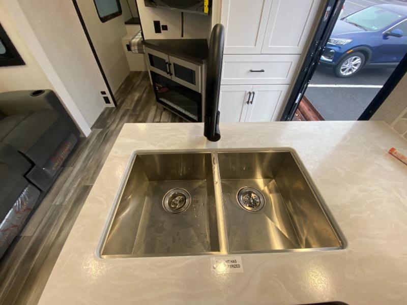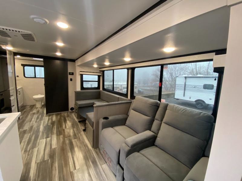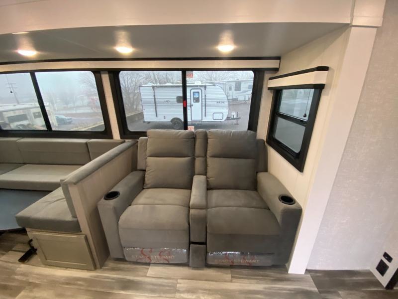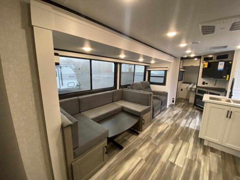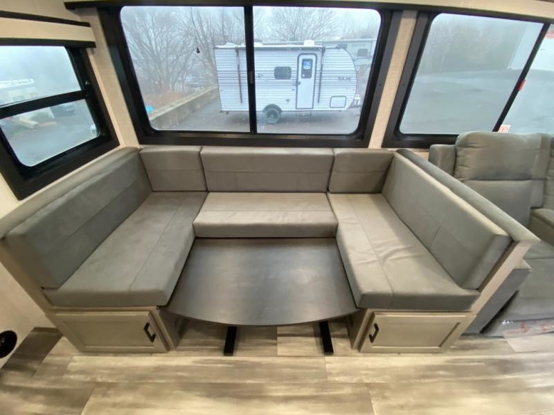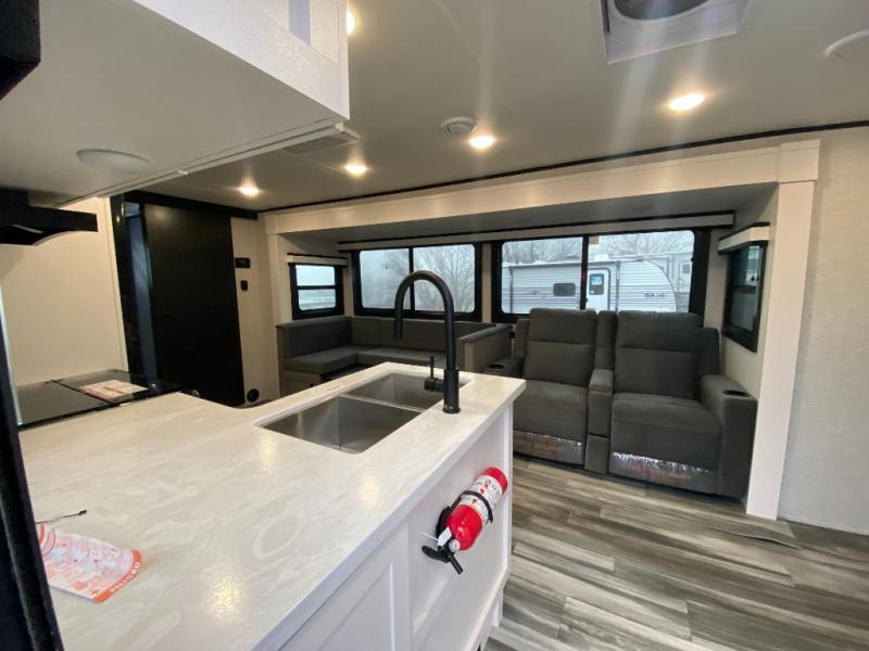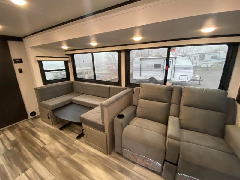 It won't be hard to find comfort in this spacious travel trailer! The large slide out in the main living area will provide more floor space to let the dog nap on the floor and let the cook whip up dinner in the kitchen. There is a tri-fold sofa and U-shaped dinette that will be perfect for meals times, relaxing, and extra sleeping space. This unit includes a full rear bath with dual bath sinks, a linen closet, plus a shower with a seat for added comfort. The front private bedroom includes a queen bed, dual nightstands, and a bedroom closet to keep your space tidy. Head outdoors to visit under the 20' awning, grab your fishing poles from the exterior storage, or fill the dogs water bowl with the external shower!