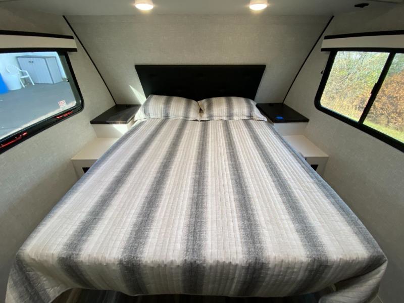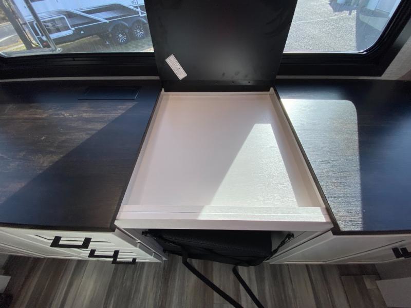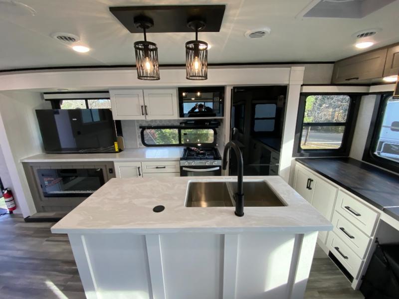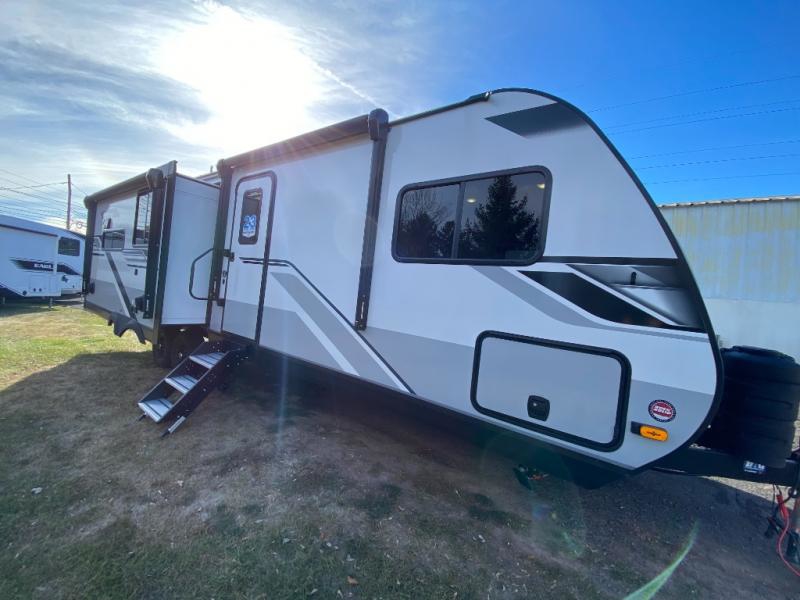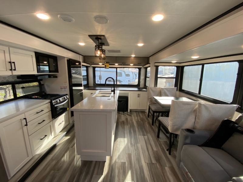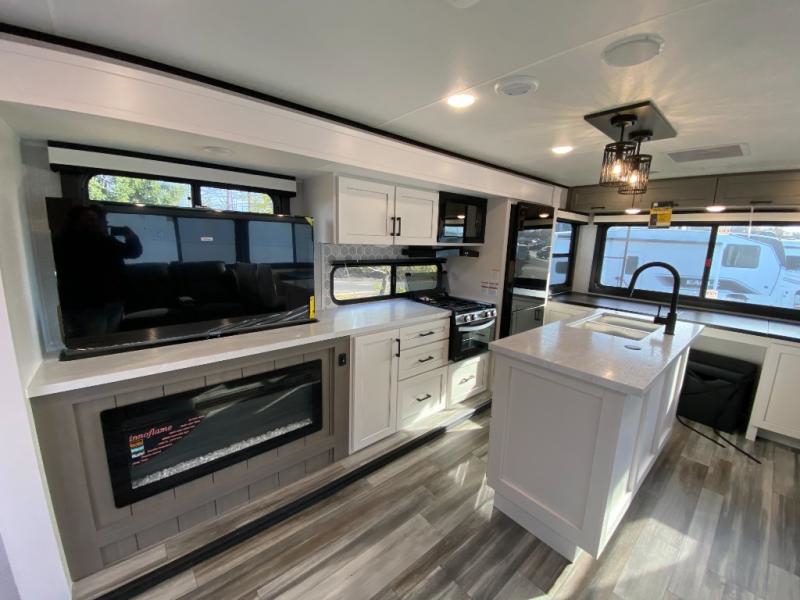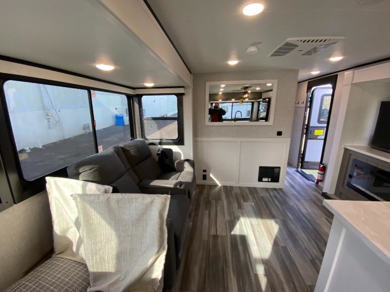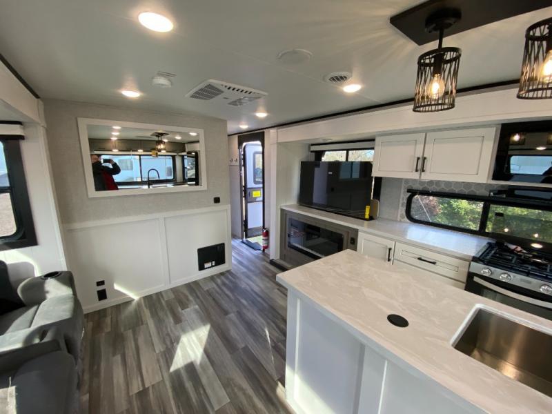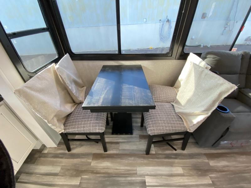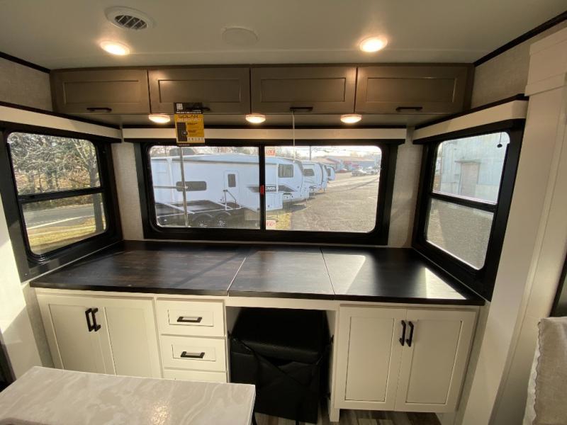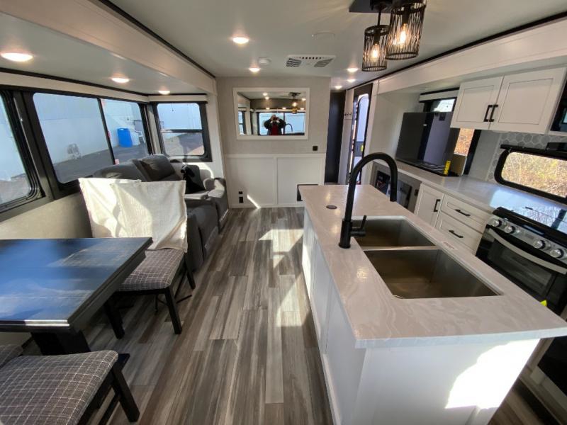 Perfect for weekend trips or extended stays, this travel trailer is the one! You will find a rear desk with an ottoman plus overhead storage if you plan to work while you're away from home. The dual opposing slides in the combined kitchen and living area will create an open floorplan, and the kitchen island will provide the chef of your group with more counter space. There is a tri-fold sofa and booth dinette that double as seating and sleeping space, and the full bath onboard will keep everyone clean. Don't overlook the front private bedroom with a queen bed and plenty of storage space for your belongings!