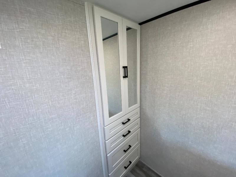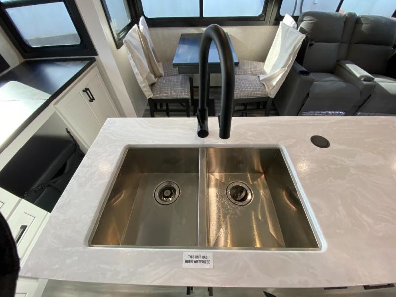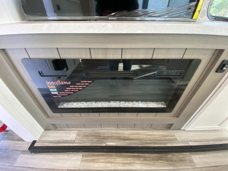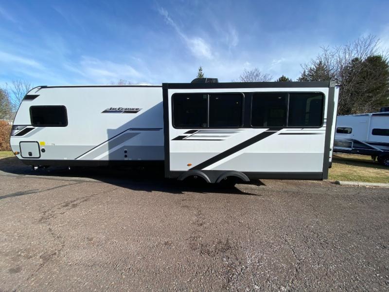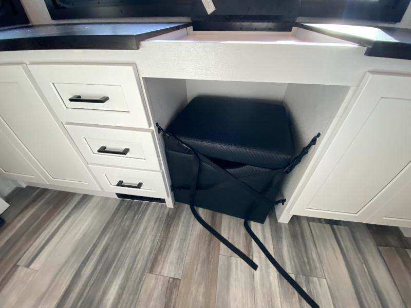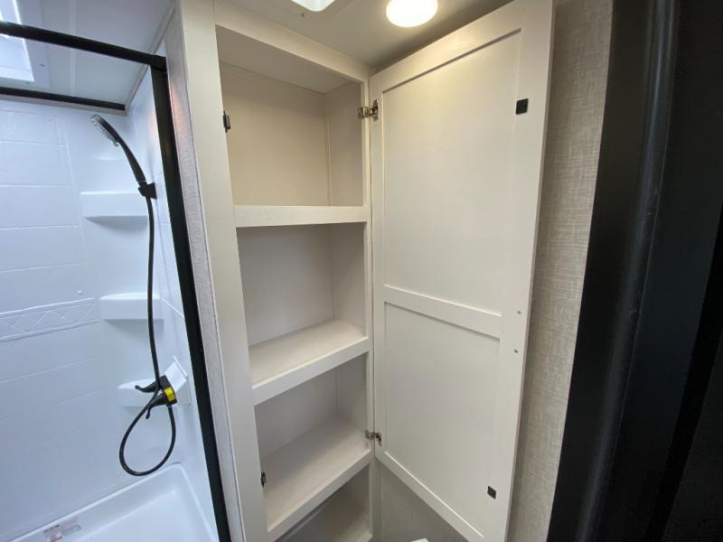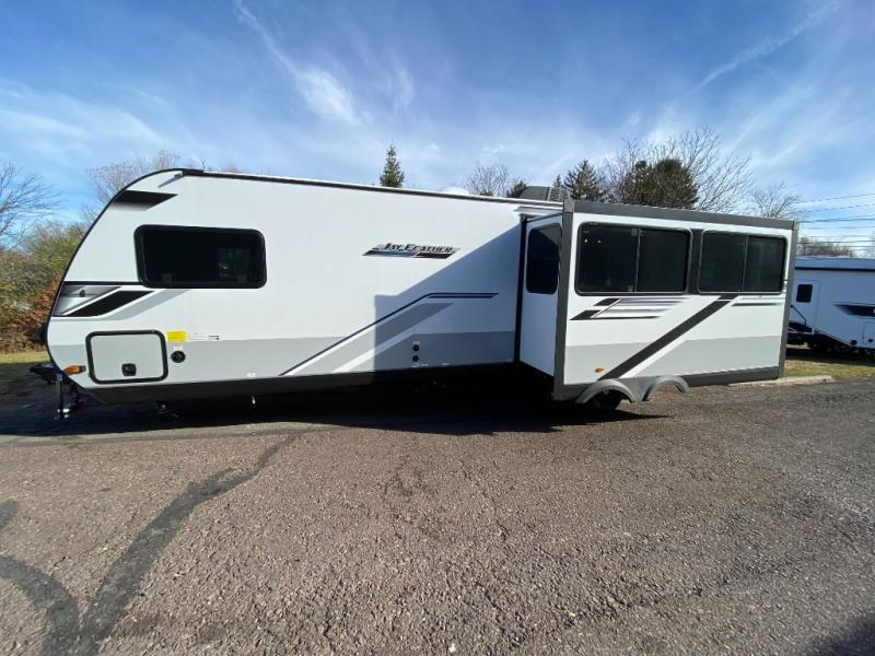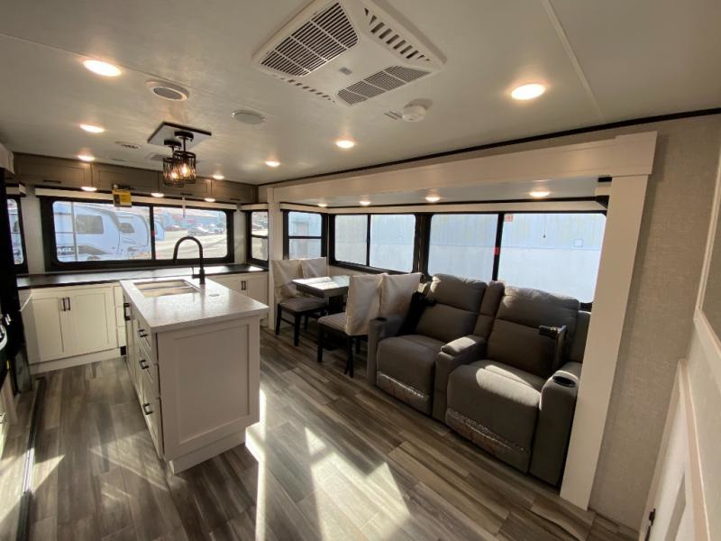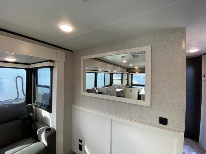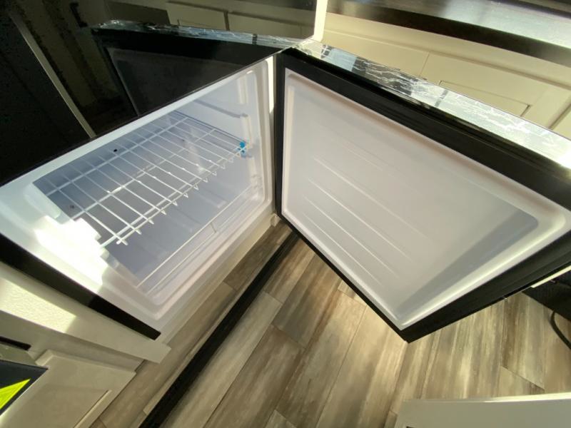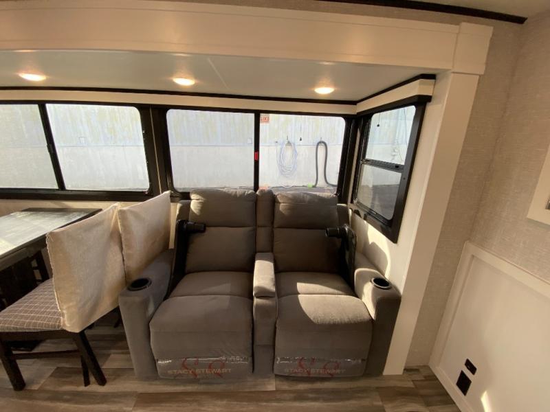 Perfect for weekend trips or extended stays, this travel trailer is the one! You will find a rear desk with an ottoman plus overhead storage if you plan to work while you're away from home. The dual opposing slides in the combined kitchen and living area will create an open floorplan, and the kitchen island will provide the chef of your group with more counter space. There is a tri-fold sofa and booth dinette that double as seating and sleeping space, and the full bath onboard will keep everyone clean. Don't overlook the front private bedroom with a queen bed and plenty of storage space for your belongings!