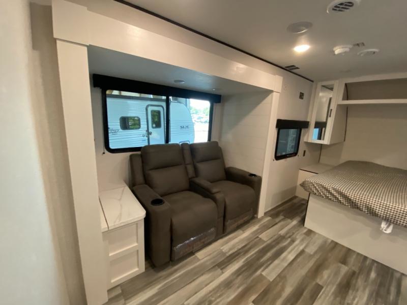 This couple's trailer will be perfect for weekend trips to the lake or extended stays at the campground. You can sleep on the front queen bed each night instead of on an air mattress, and the dual bedroom wardrobes will help keep your space organized. The theater seat with tables is within a slide for more floor space, and the fully-equipped kitchen will allow you to make meals each day. You'll also appreciate the rear corner full bath to stay clean throughout each trip!