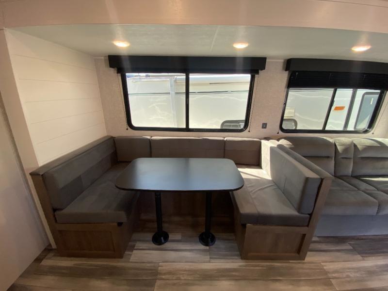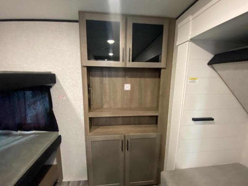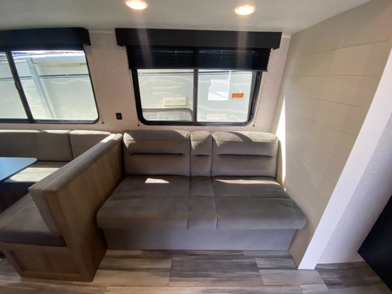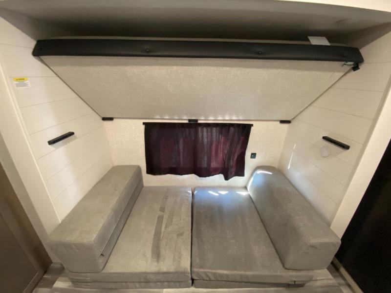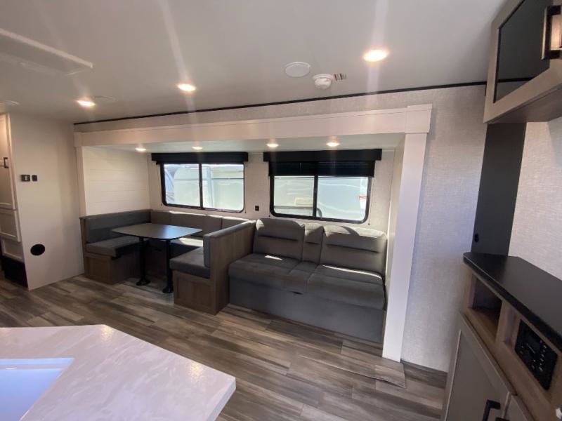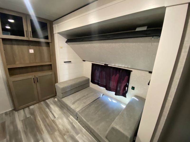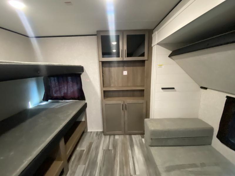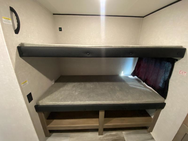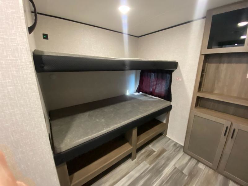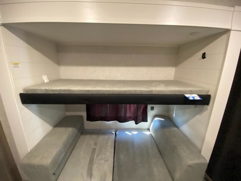The whole gang can join along on camping trips in this double slide out travel trailer! There is a rear private bunkhouse with a bunk bed and J-cube futon sofa below plus two additional bunks across the room. You'll find your own space in the front private bedroom, which also includes an RV queen bed and dual wardrobes. The middle kitchen and living room will be a favorite place to come together since there is a jack-knife sofa and U-shaped dinette plus a fully-equipped kitchen to make meals each day. This model also includes a full bath with one of the dual entry doors for added convenience!