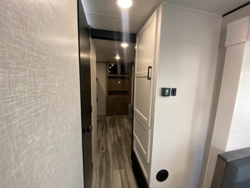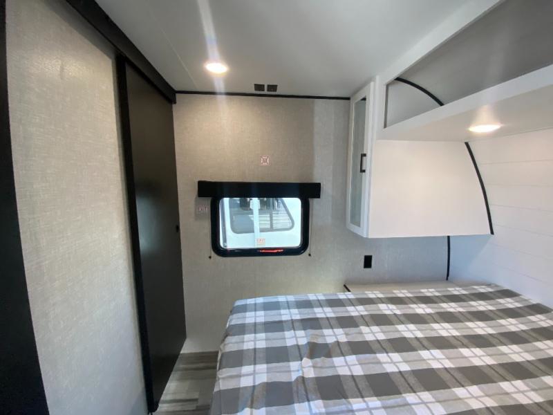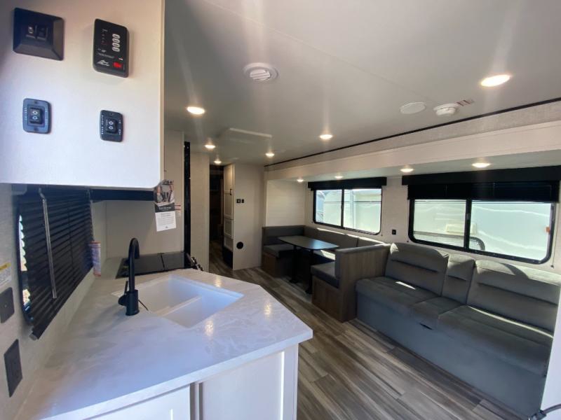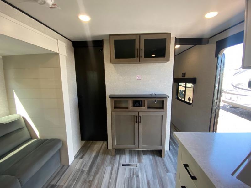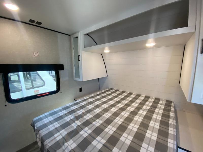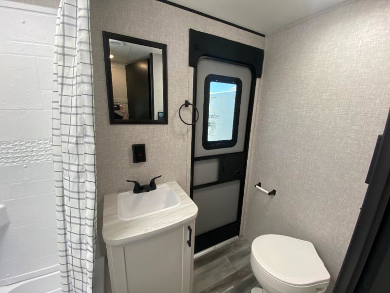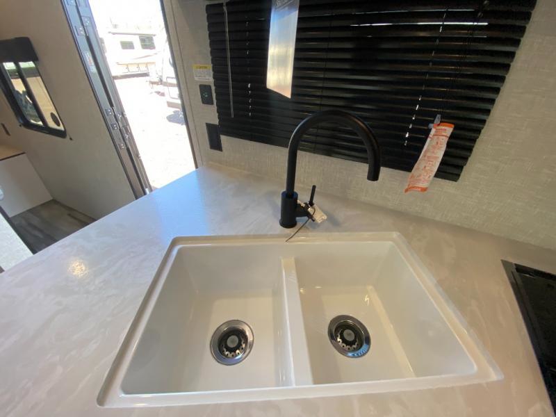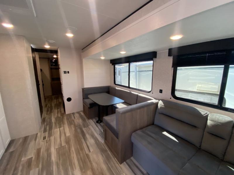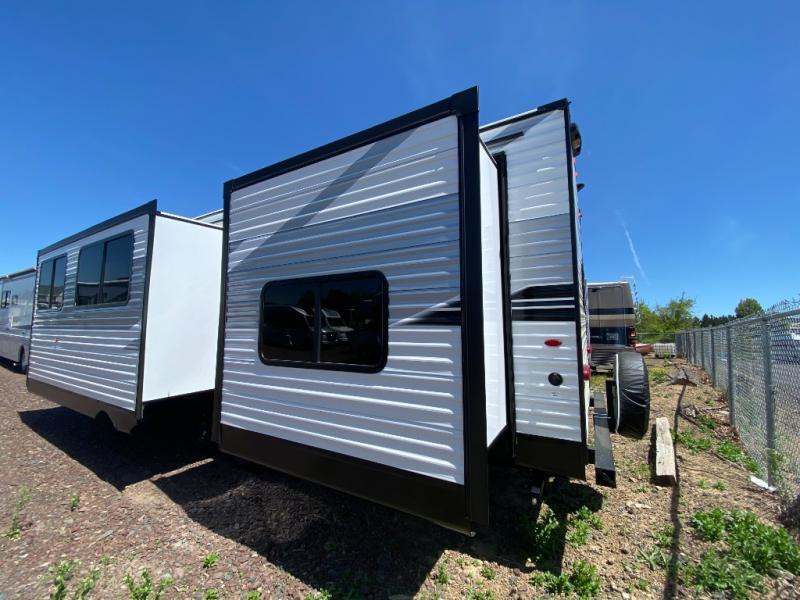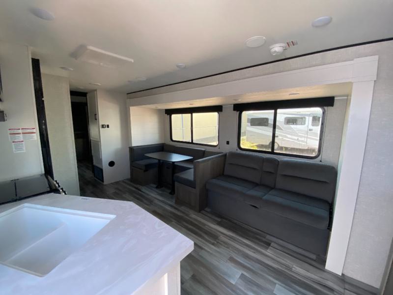 The whole gang can join along on camping trips in this double slide out travel trailer! There is a rear private bunkhouse with a bunk bed and J-cube futon sofa below plus two additional bunks across the room. You'll find your own space in the front private bedroom, which also includes an RV queen bed and dual wardrobes. The middle kitchen and living room will be a favorite place to come together since there is a jack-knife sofa and U-shaped dinette plus a fully-equipped kitchen to make meals each day. This model also includes a full bath with one of the dual entry doors for added convenience!