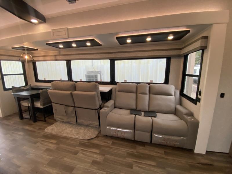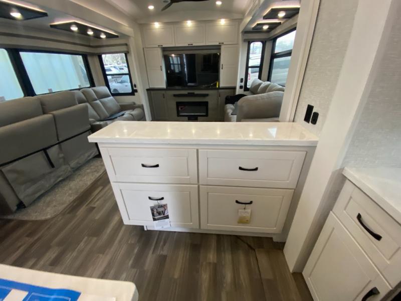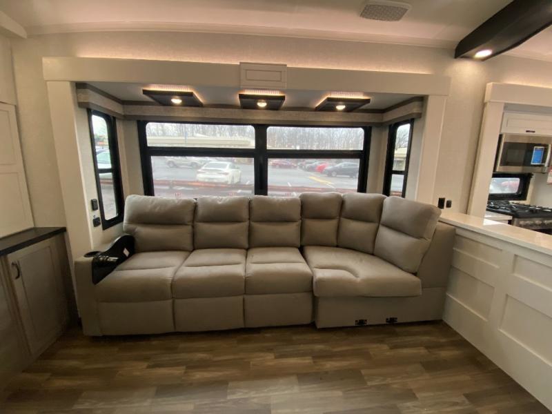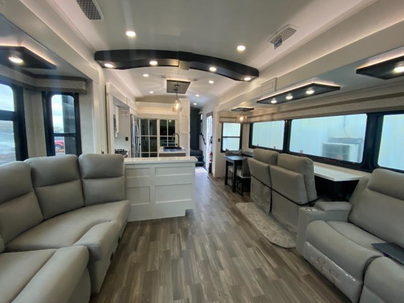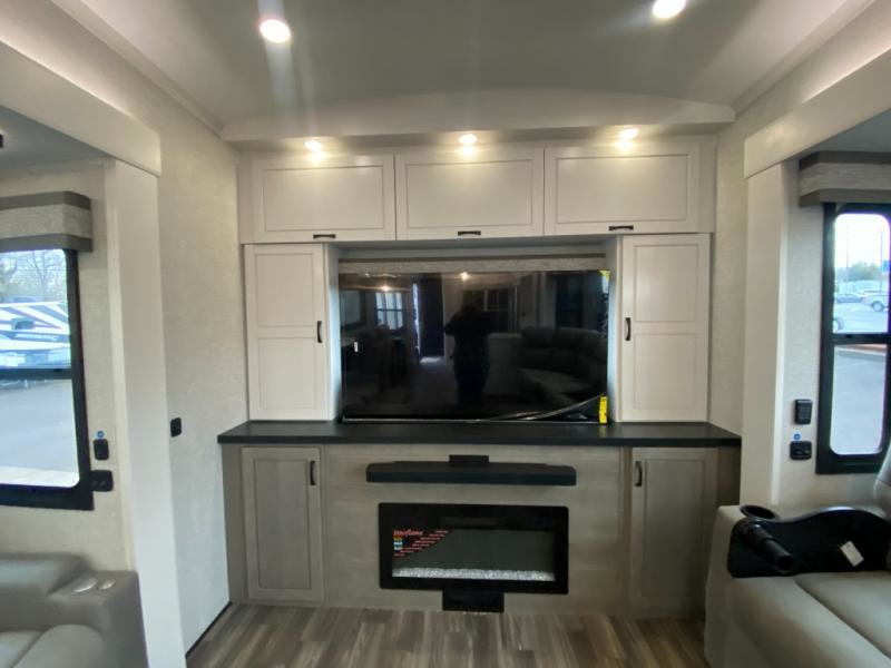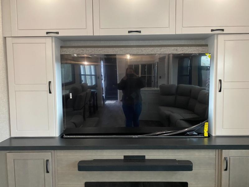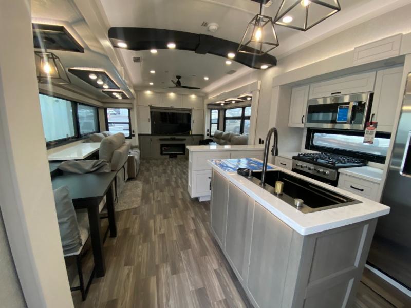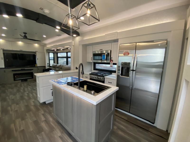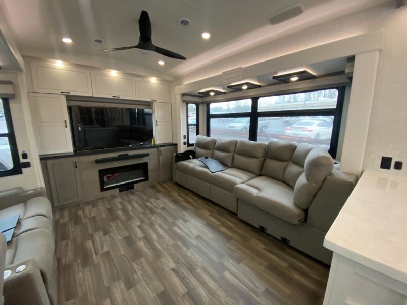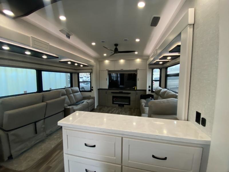 Prepare for great adventures in this fifth wheel! The rear living area features a massive L-shaped sofa which includes a hide-a-bed as well as recliner seats! Plus there's an additional set of theater seats all facing the entertainment center with fireplace and 50" Smart TV. A flexible desk/coffee bar connects the living room to the kitchen so you can work or relax as needed. Meals will be easy to prepare with the island with sink and pull-out cutting board, plus pantry, microwave, and residential refrigerator. Up front you will find the private bedroom with its king bed, closet with drawers and hamper, and even a second TV. The full bath features a shower with seat and a linen closet for convenient storage. Outside you'll find a pair of awnings and a pull-out griddle.