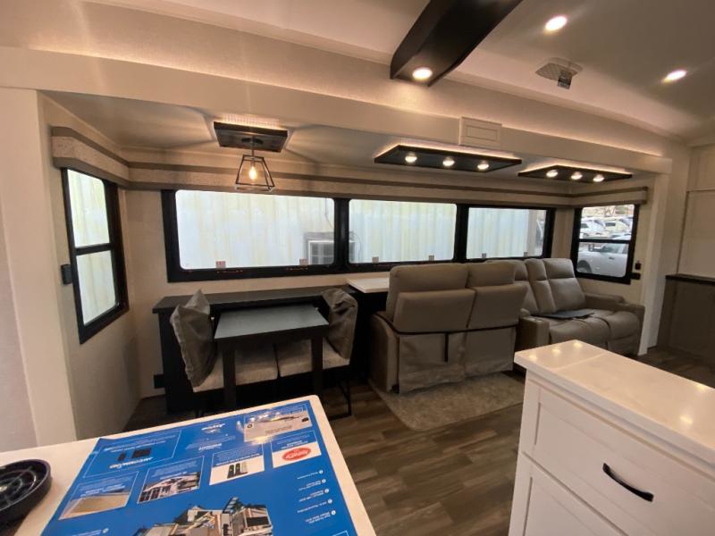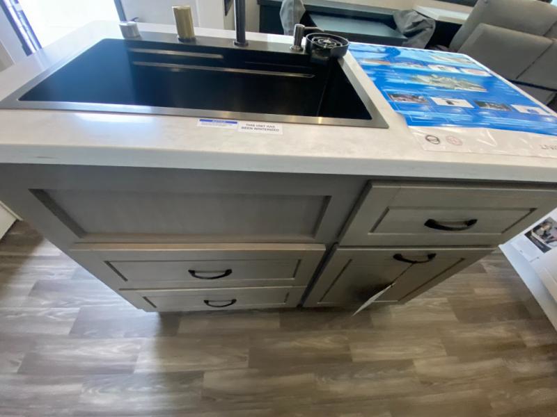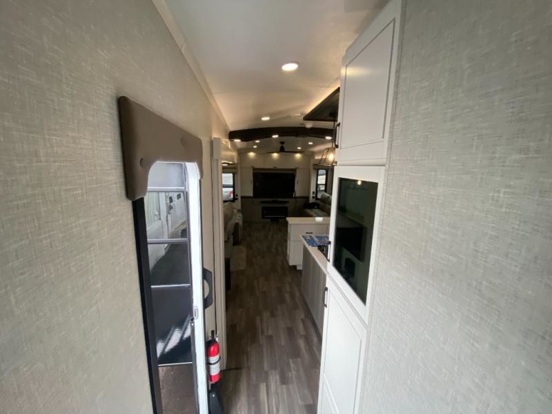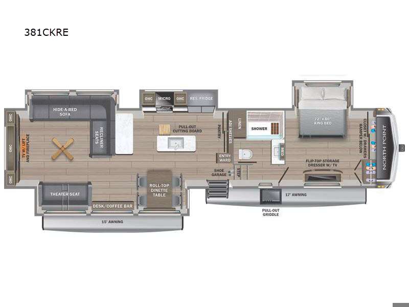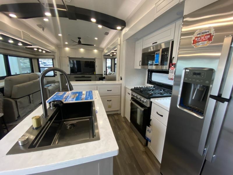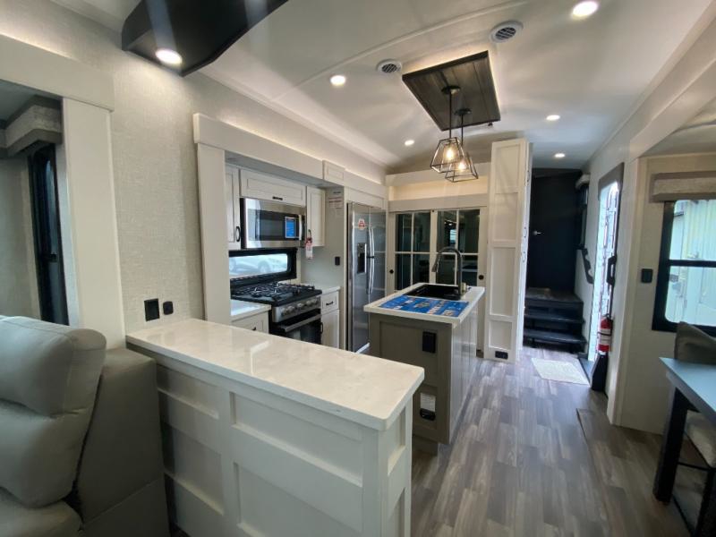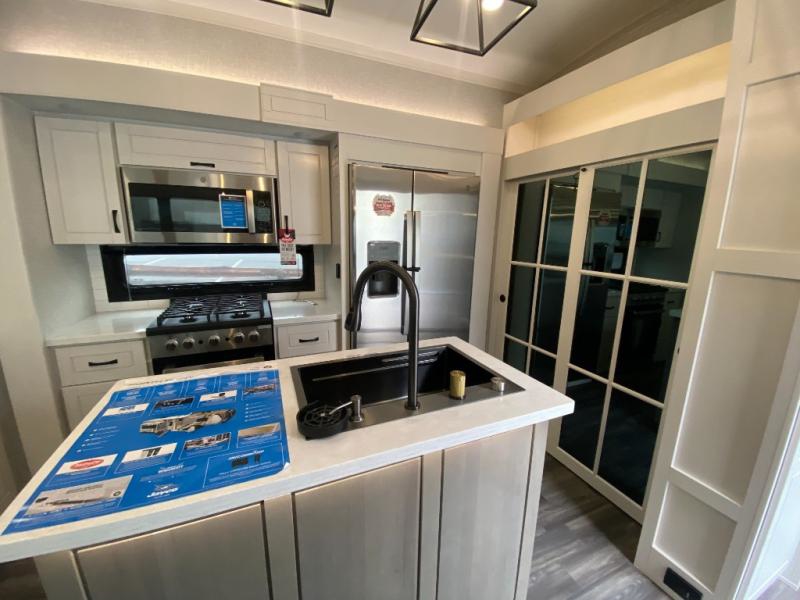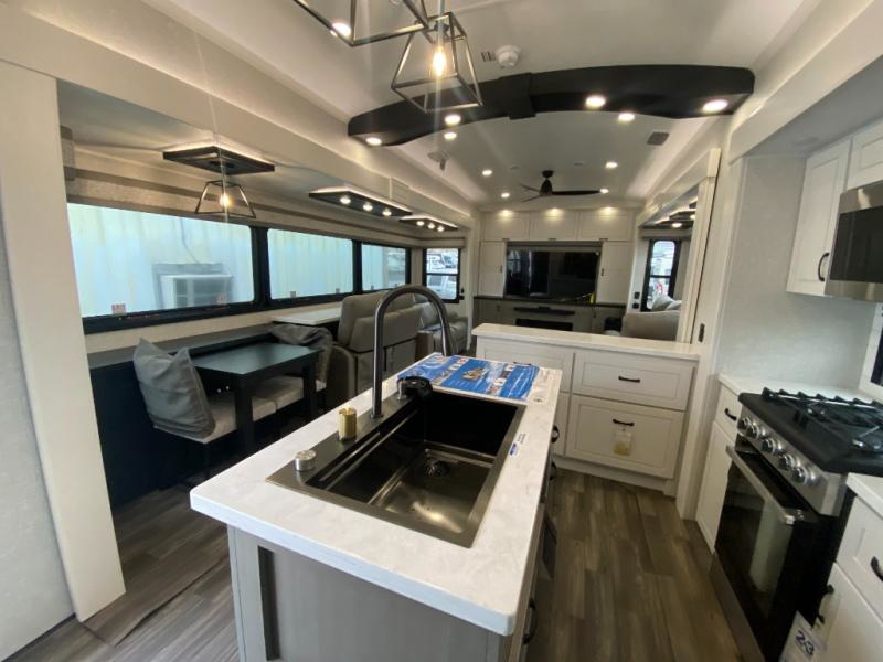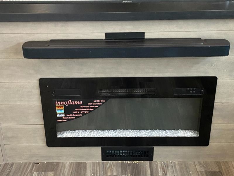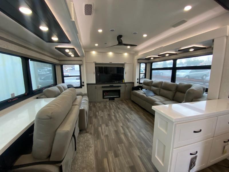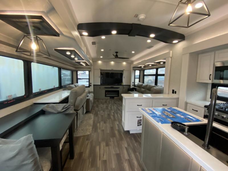 Prepare for great adventures in this fifth wheel! The rear living area features a massive L-shaped sofa which includes a hide-a-bed as well as recliner seats! Plus there's an additional set of theater seats all facing the entertainment center with fireplace and 50" Smart TV. A flexible desk/coffee bar connects the living room to the kitchen so you can work or relax as needed. Meals will be easy to prepare with the island with sink and pull-out cutting board, plus pantry, microwave, and residential refrigerator. Up front you will find the private bedroom with its king bed, closet with drawers and hamper, and even a second TV. The full bath features a shower with seat and a linen closet for convenient storage. Outside you'll find a pair of awnings and a pull-out griddle.