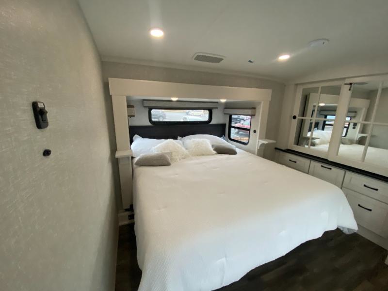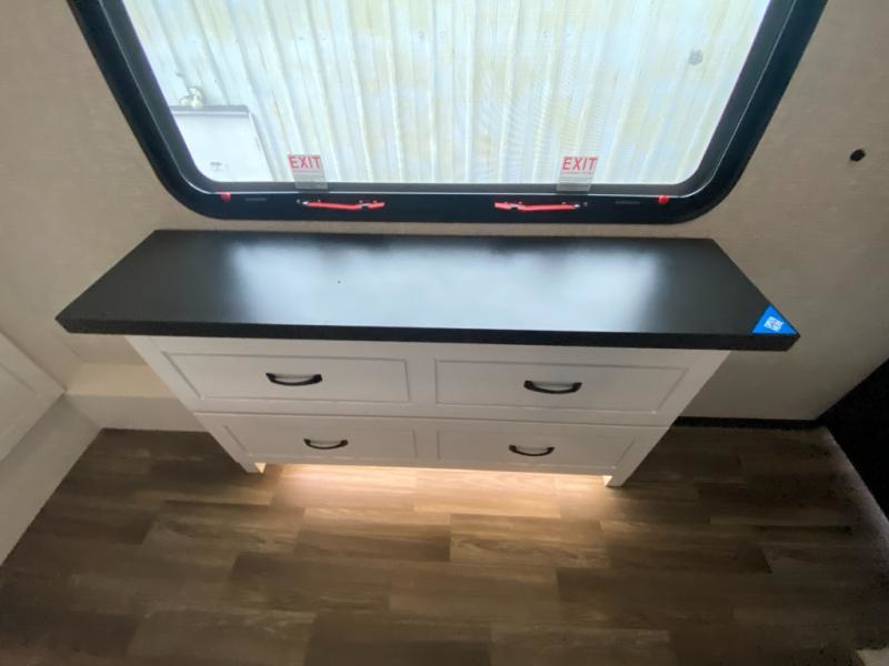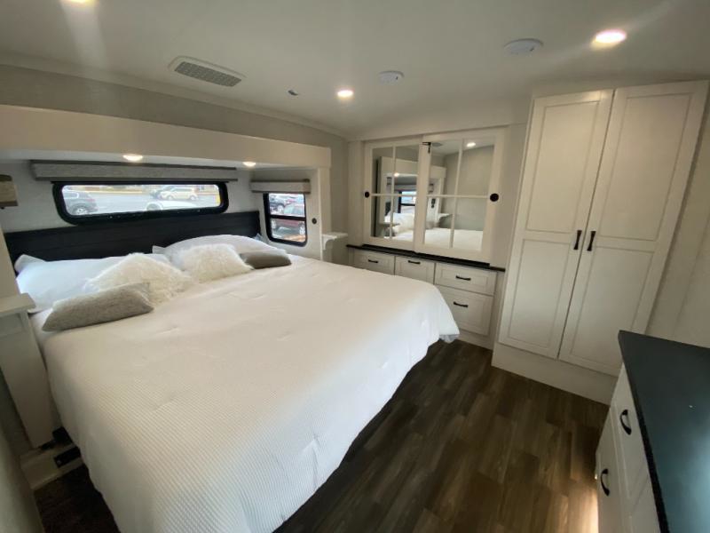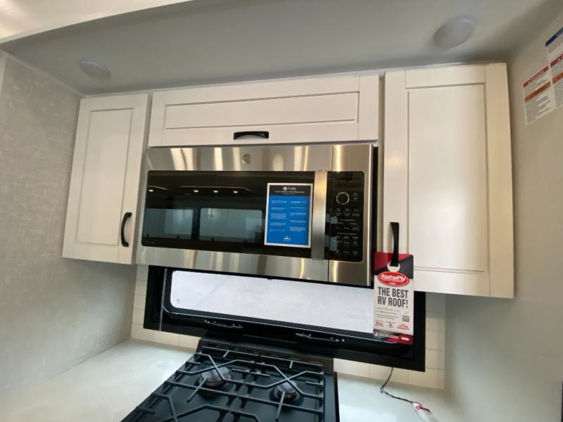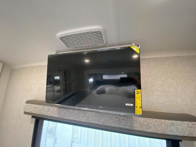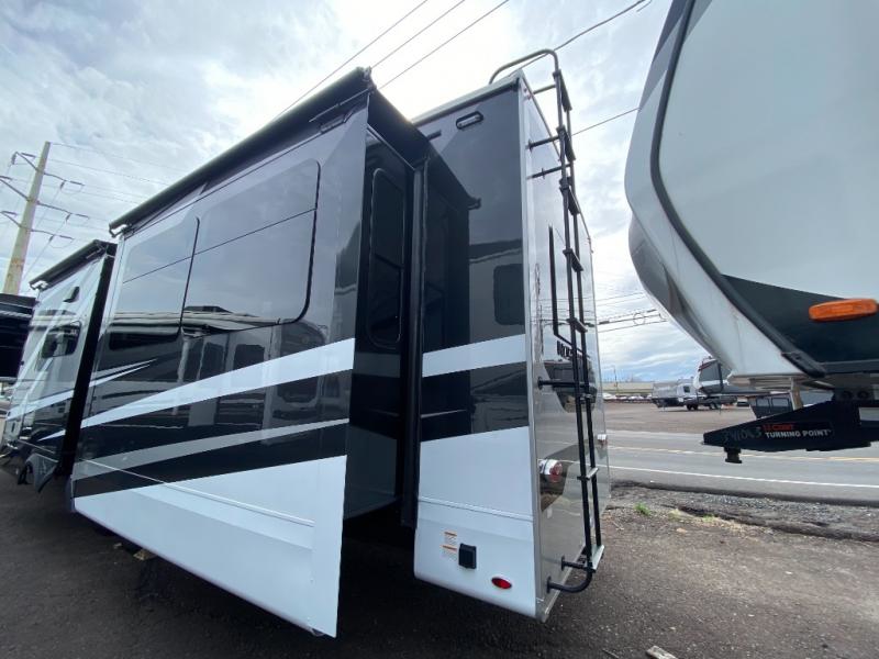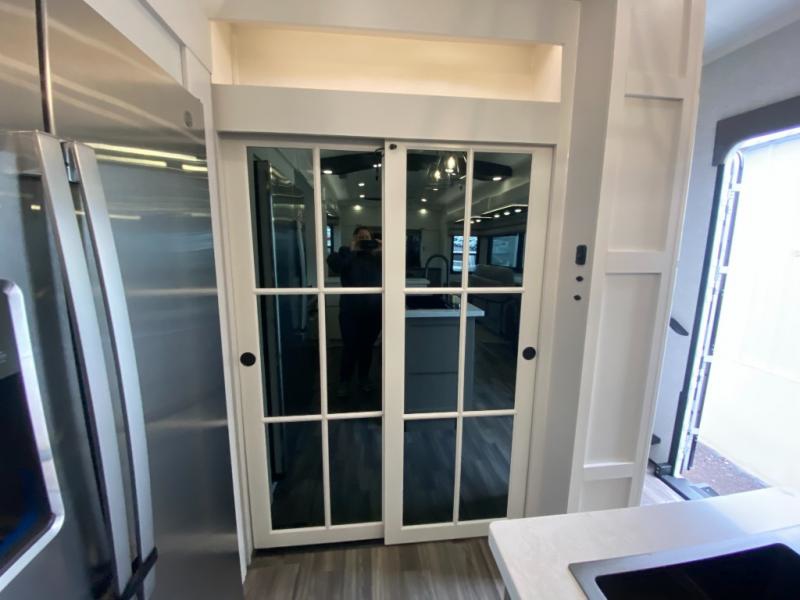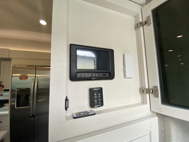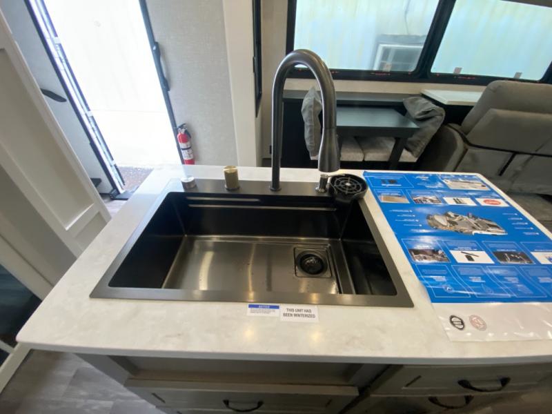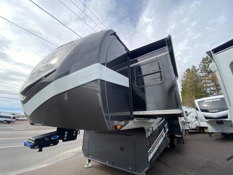 Prepare for great adventures in this fifth wheel! The rear living area features a massive L-shaped sofa which includes a hide-a-bed as well as recliner seats! Plus there's an additional set of theater seats all facing the entertainment center with fireplace and 50" Smart TV. A flexible desk/coffee bar connects the living room to the kitchen so you can work or relax as needed. Meals will be easy to prepare with the island with sink and pull-out cutting board, plus pantry, microwave, and residential refrigerator. Up front you will find the private bedroom with its king bed, closet with drawers and hamper, and even a second TV. The full bath features a shower with seat and a linen closet for convenient storage. Outside you'll find a pair of awnings and a pull-out griddle.