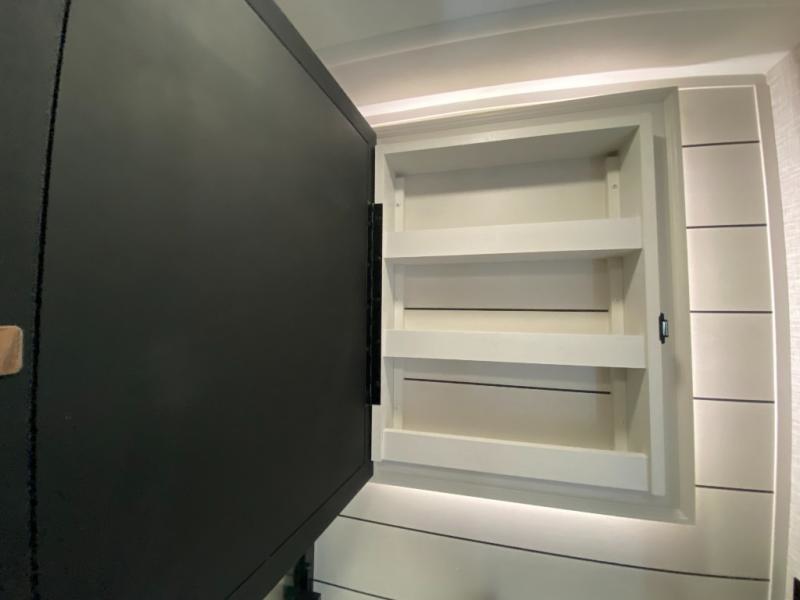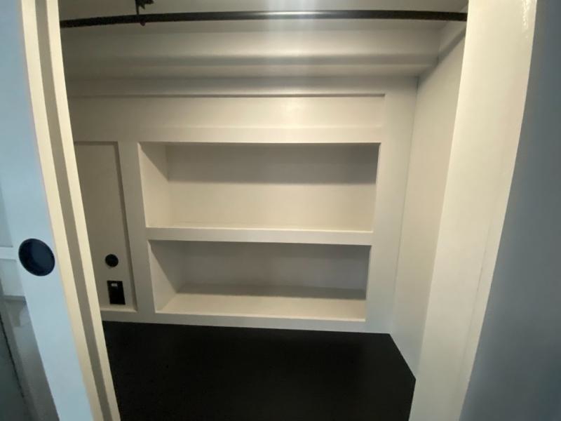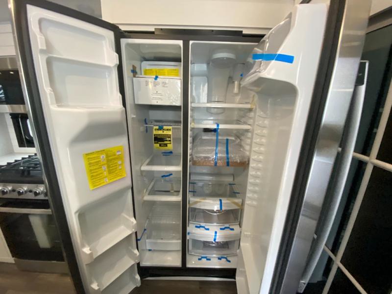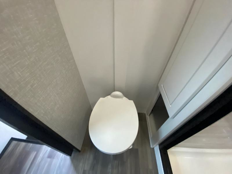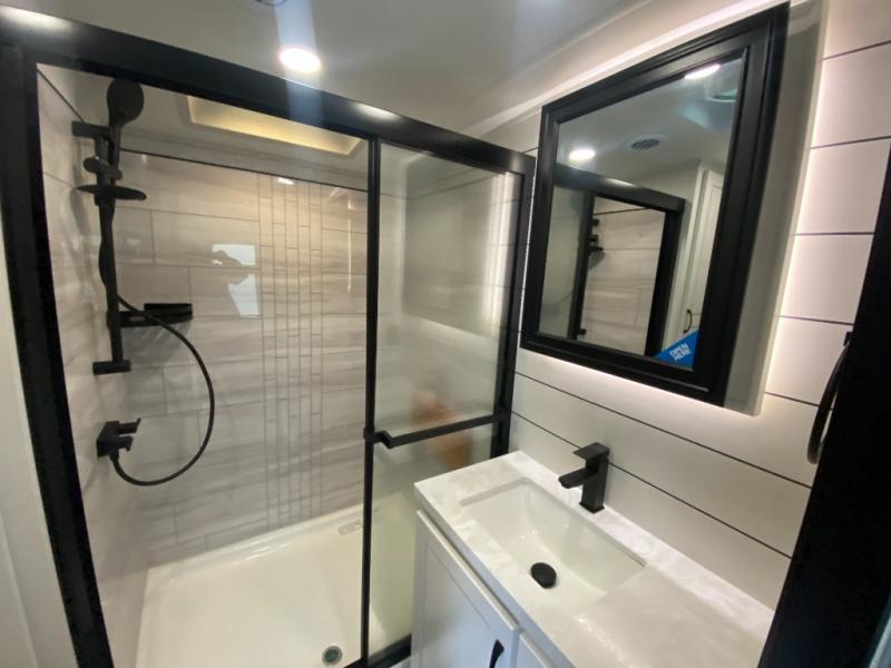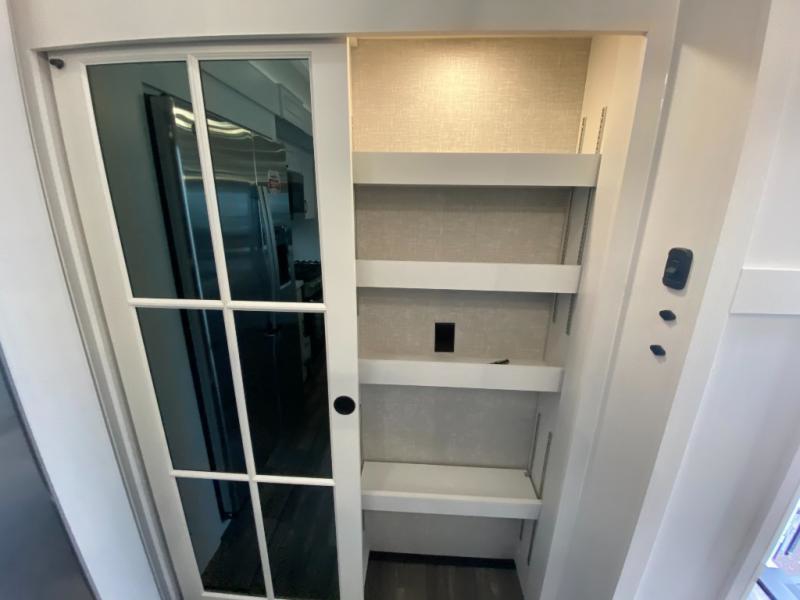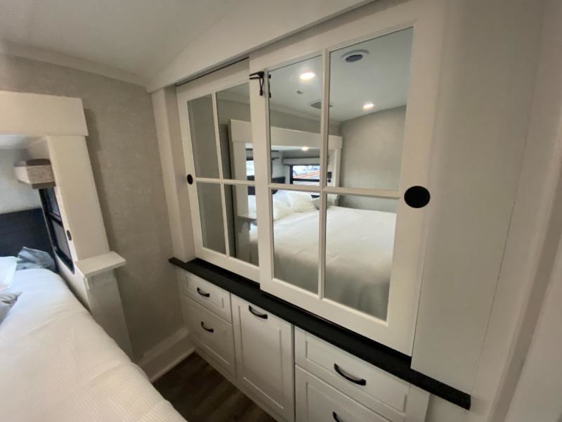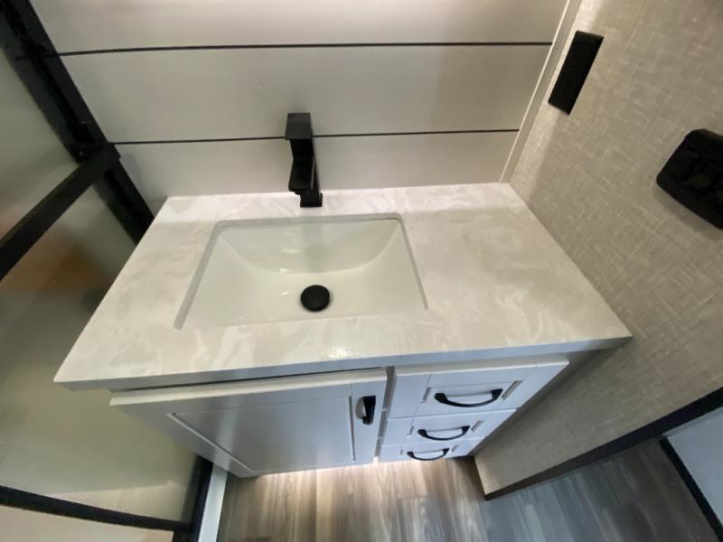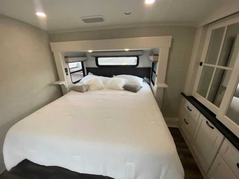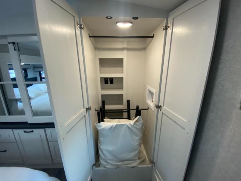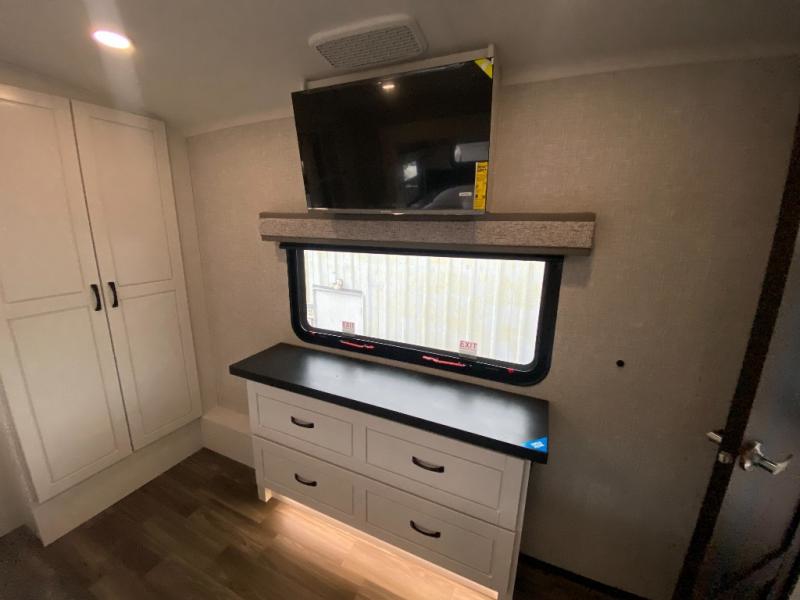 Prepare for great adventures in this fifth wheel! The rear living area features a massive L-shaped sofa which includes a hide-a-bed as well as recliner seats! Plus there's an additional set of theater seats all facing the entertainment center with fireplace and 50" Smart TV. A flexible desk/coffee bar connects the living room to the kitchen so you can work or relax as needed. Meals will be easy to prepare with the island with sink and pull-out cutting board, plus pantry, microwave, and residential refrigerator. Up front you will find the private bedroom with its king bed, closet with drawers and hamper, and even a second TV. The full bath features a shower with seat and a linen closet for convenient storage. Outside you'll find a pair of awnings and a pull-out griddle.