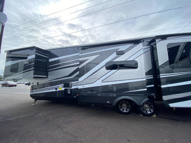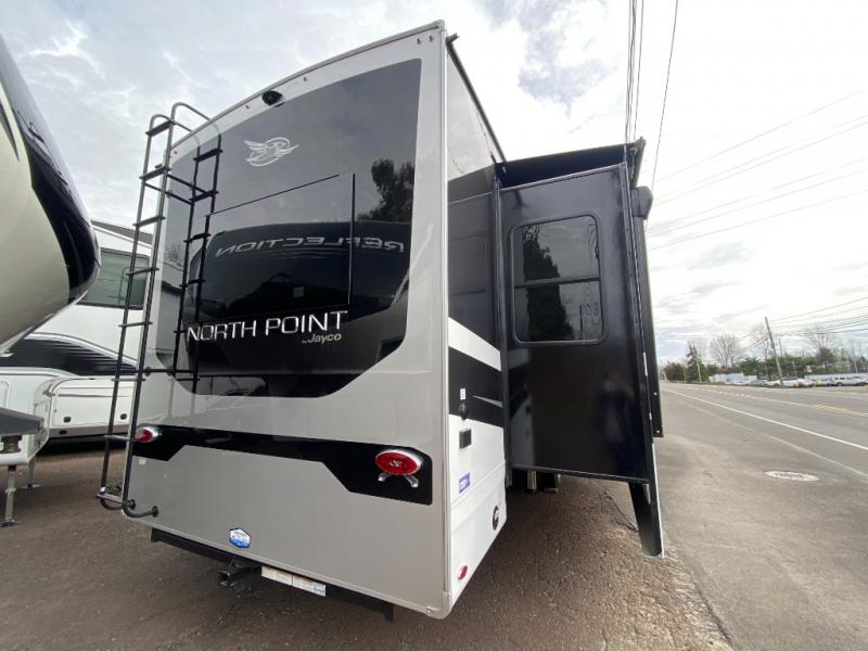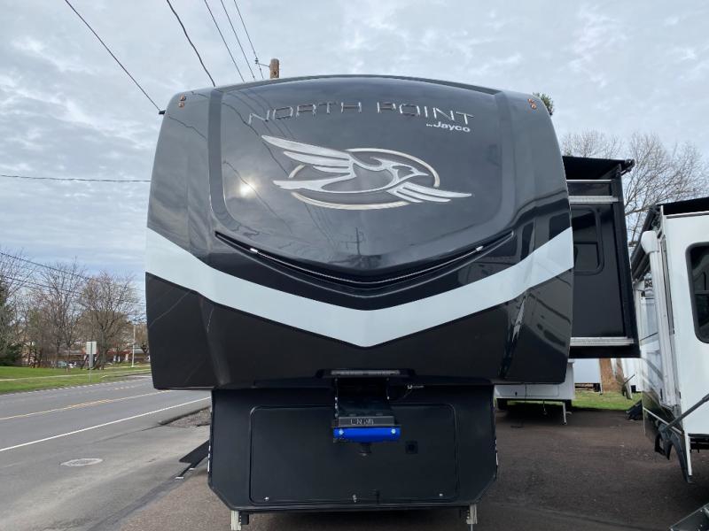 With any North Point fifth wheel by Jayco you begin with a strong foundation with a custom frame, designed and sized specifically to best support each unit. Constructed with Stronghold VBL™ aluminum framed, vacuum bond laminated walls and the Magnum Truss™ XL6™ roof system with a one-piece, seamless roof material, which is the strongest tested roof in the industry. The 5-Star Handling package is included with Uniroyal tires, a MORryde rubber pin box, Dexter axles with Nev-R-Adjust brakes, MORryde CRE-3000 rubberized suspension and wet bolt fasteners and bronze bushings. The interior has handcrafted hardwood glazed doors and drawers, vinyl flooring throughout, an integrated under-mount sink in the main bathroom, plus so much more you just have to see one to believe it all!