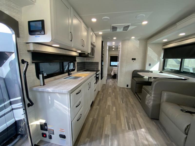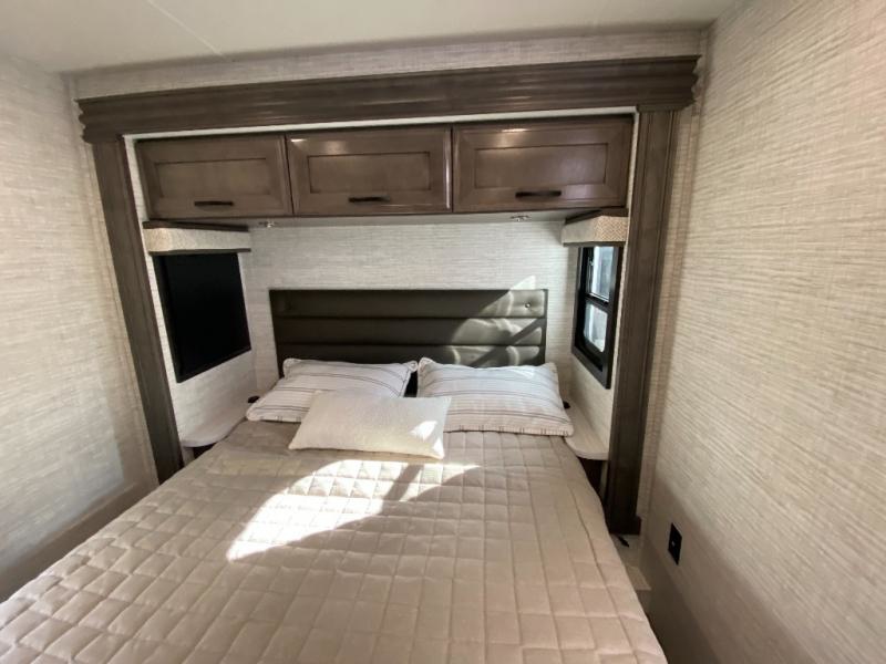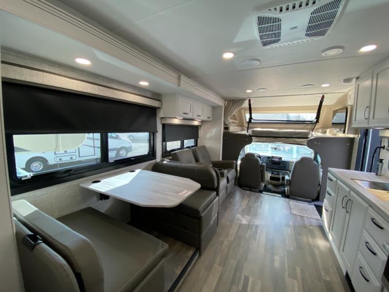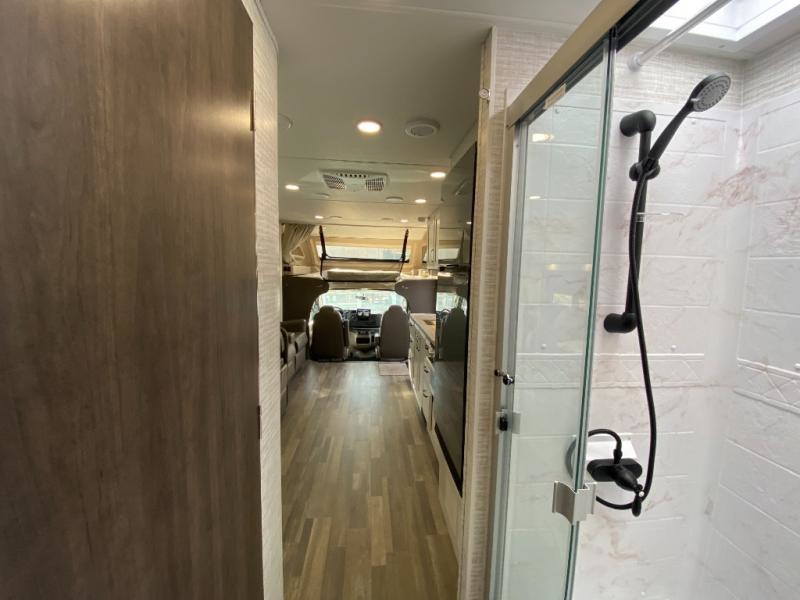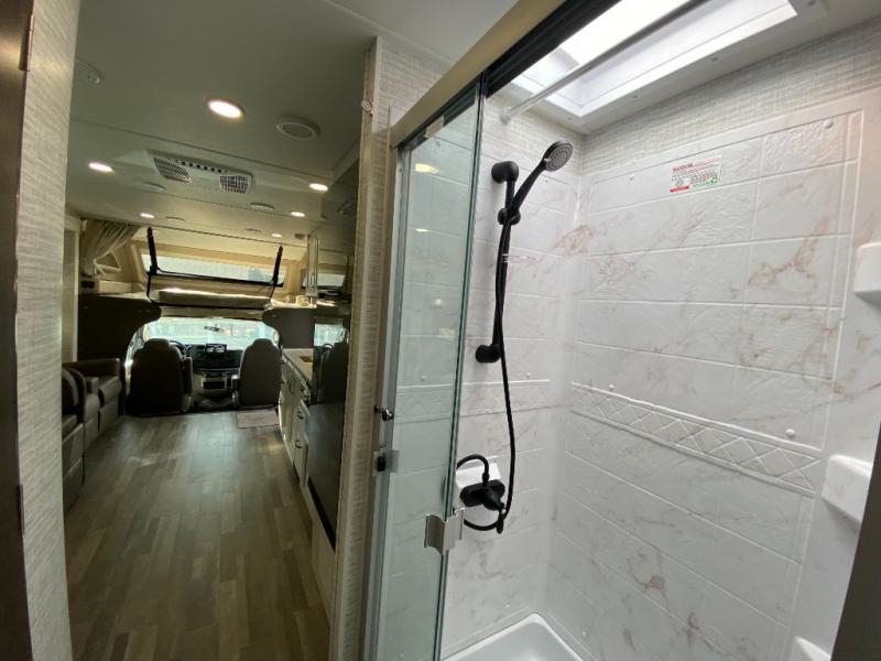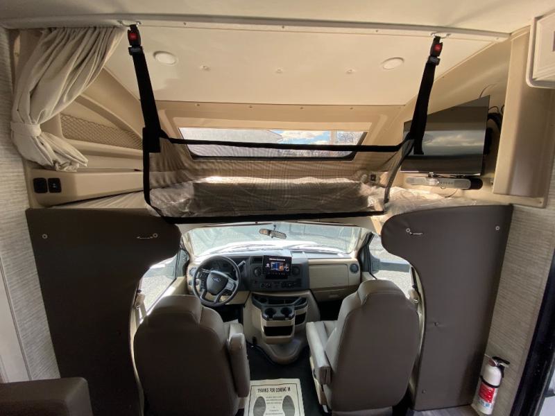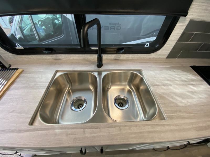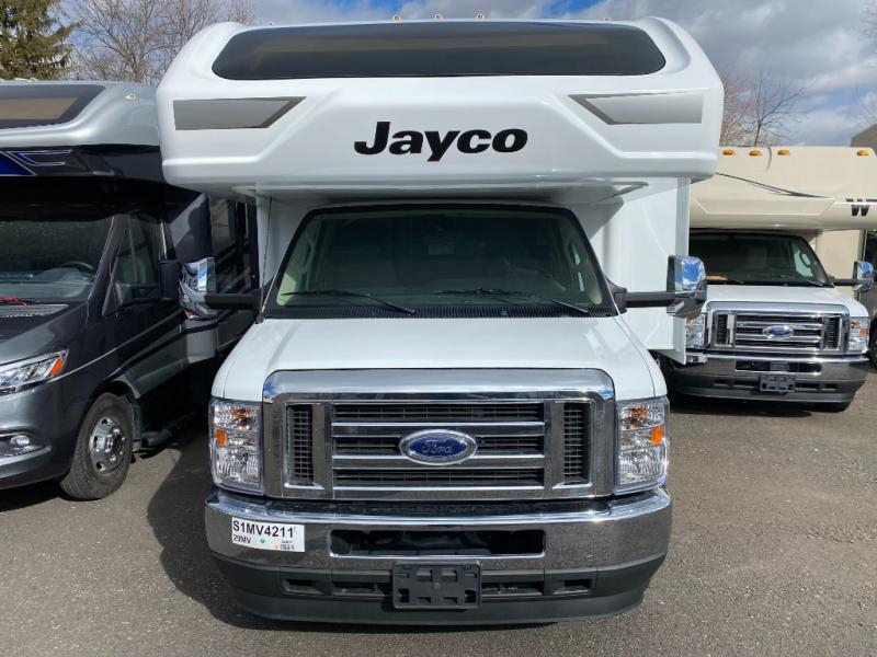 With any Greyhawk Class C gas motorhome by Jayco you will experience smooth sailing thanks to the JRIDE PLUS that comes with Koni shock absorbers, a computer-balanced driveshaft, Hellwig helper springs, and more. The Ford E-450 chassis with a 7.3L V8 325 HP engine will power your excursions, and you'll appreciate the added safety features for your peace of mind. Each model features a Sony infotainment center with Apple CarPlay and Android Auto, backup and side-view cameras, and a tire pressure monitor system the driver is sure to appreciate. Durable construction begins with Stronghold VBL roof, floor and sidewalls, bead-foam insulation, and a one-piece seamless fiberglass front cap. Head inside to find blackout night roller shades, LED-lit pressed countertops, an 84" interior ceiling height, and hardwood cabinet doors and drawers.