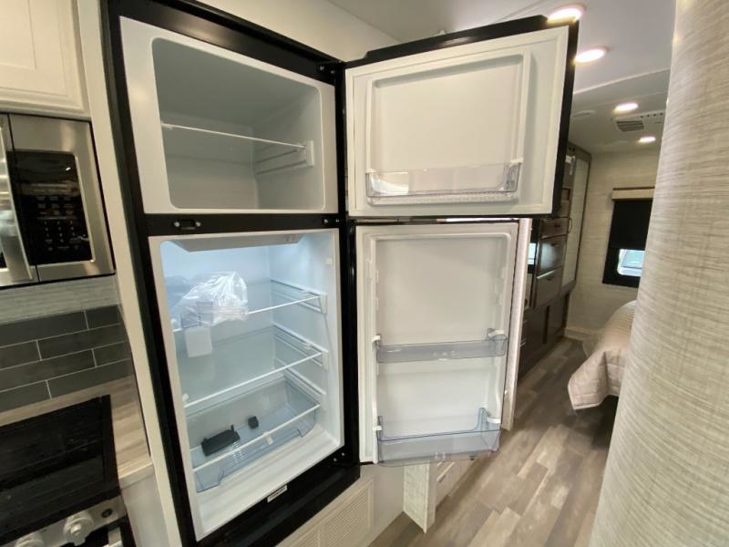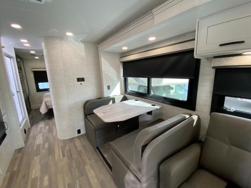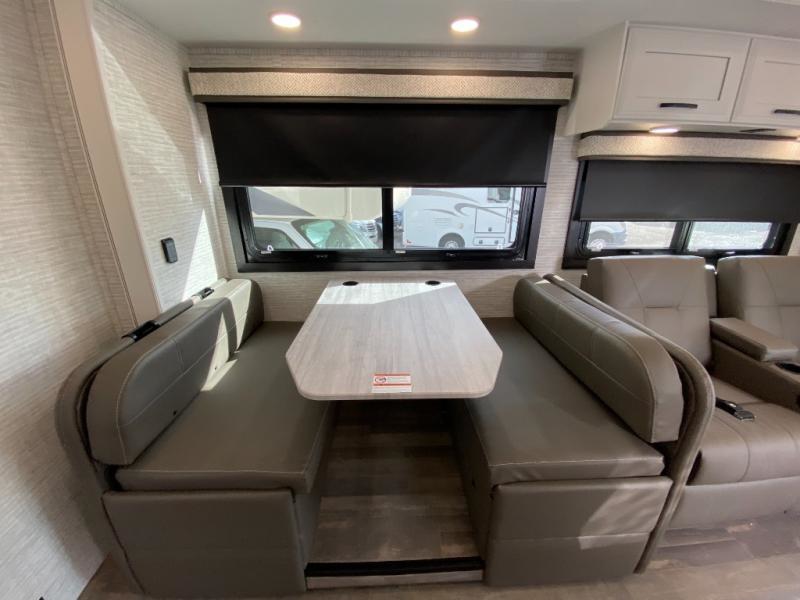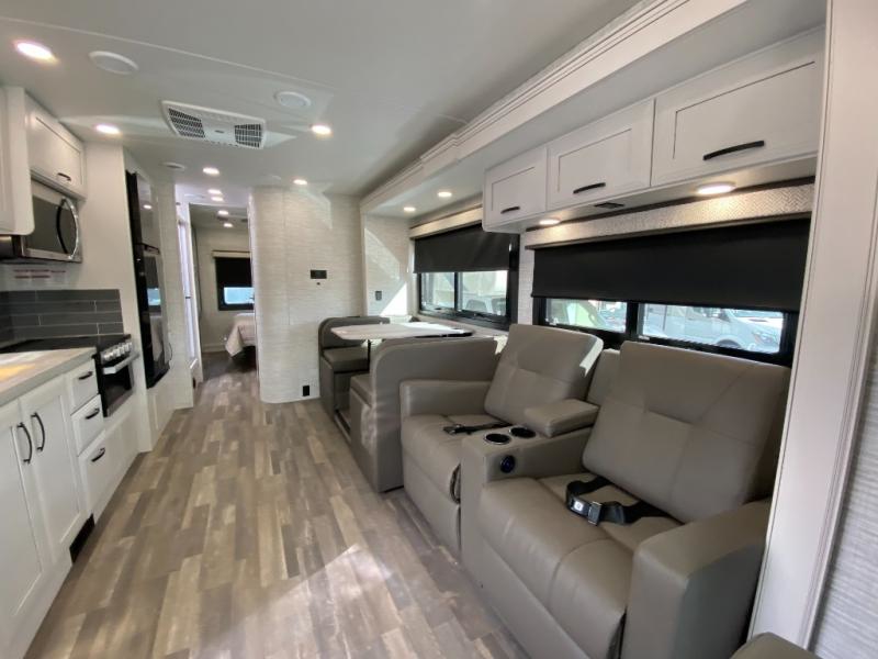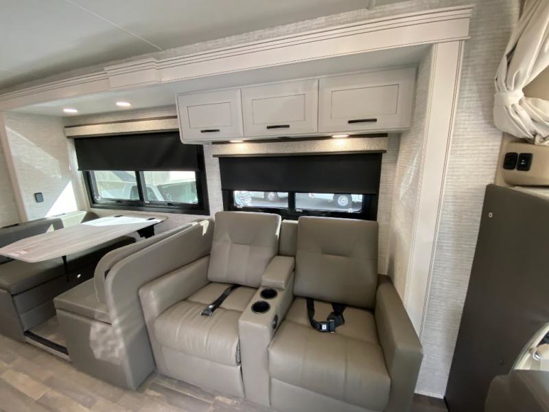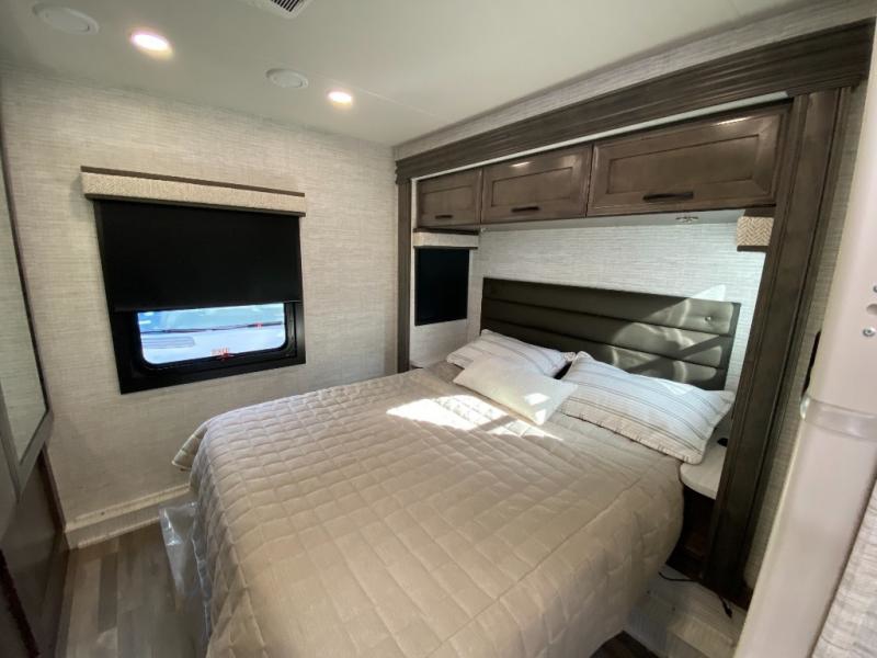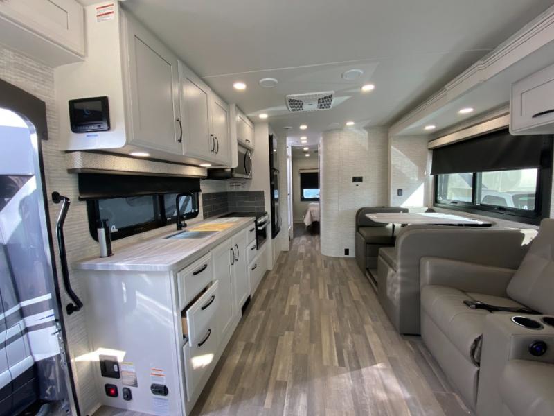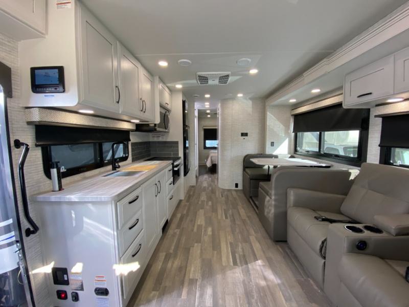 With any Greyhawk Class C gas motorhome by Jayco you will experience smooth sailing thanks to the JRIDE PLUS that comes with Koni shock absorbers, a computer-balanced driveshaft, Hellwig helper springs, and more. The Ford E-450 chassis with a 7.3L V8 325 HP engine will power your excursions, and you'll appreciate the added safety features for your peace of mind. Each model features a Sony infotainment center with Apple CarPlay and Android Auto, backup and side-view cameras, and a tire pressure monitor system the driver is sure to appreciate. Durable construction begins with Stronghold VBL roof, floor and sidewalls, bead-foam insulation, and a one-piece seamless fiberglass front cap. Head inside to find blackout night roller shades, LED-lit pressed countertops, an 84" interior ceiling height, and hardwood cabinet doors and drawers.