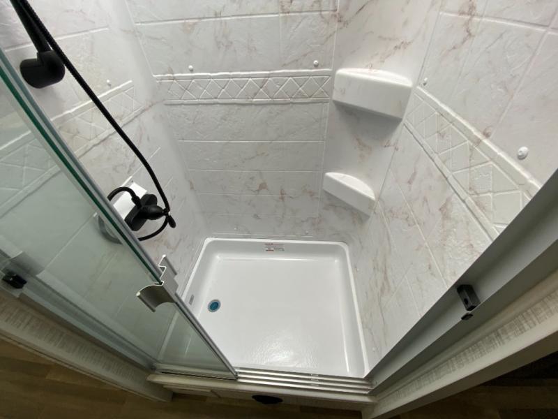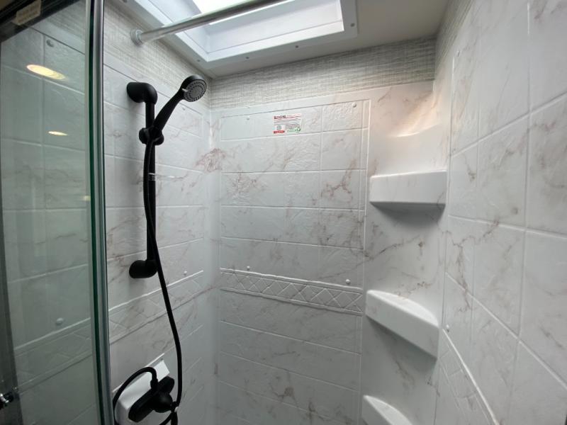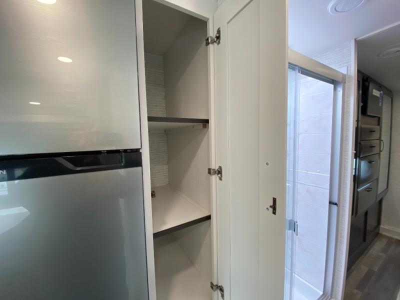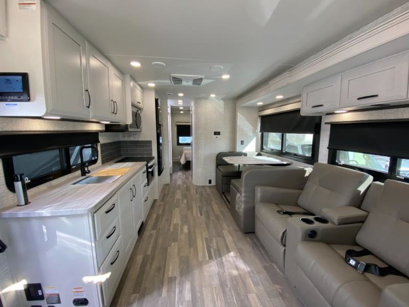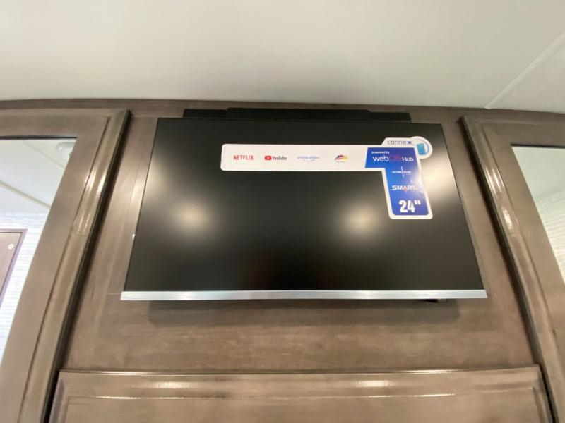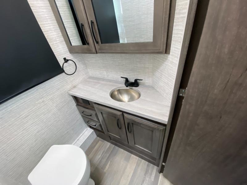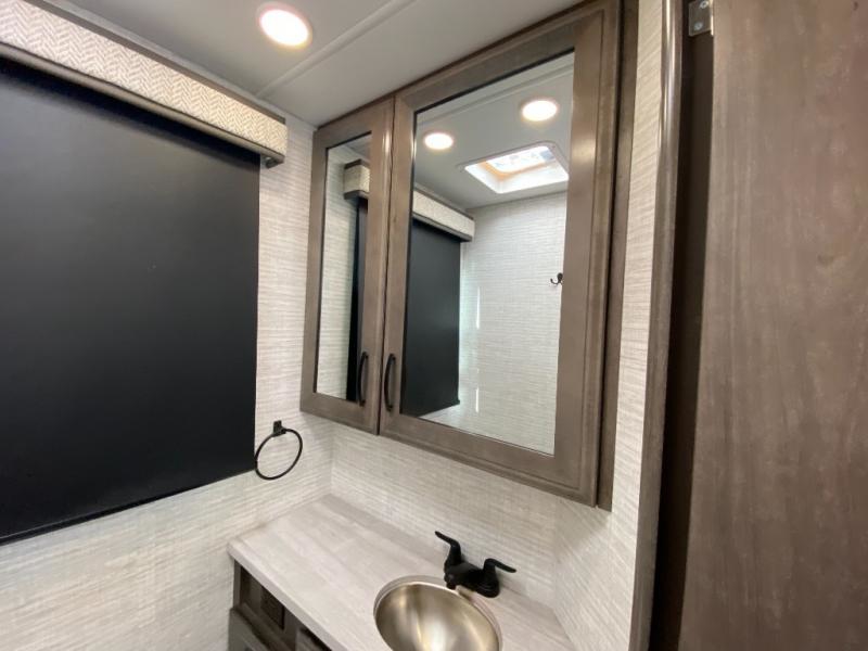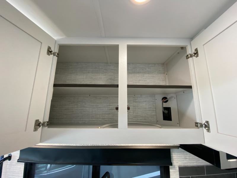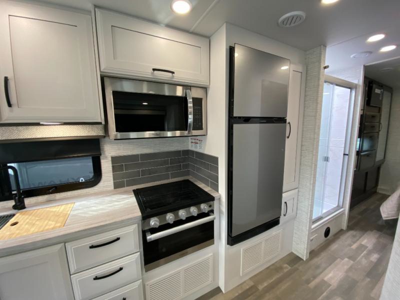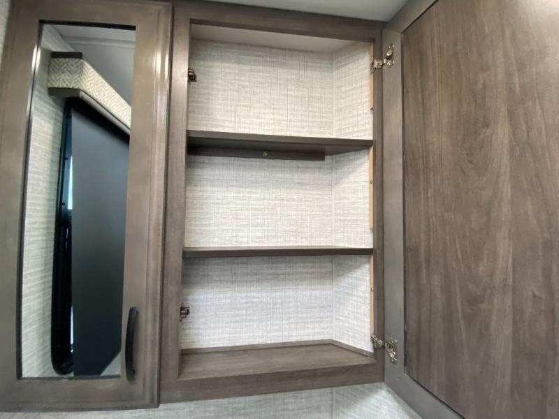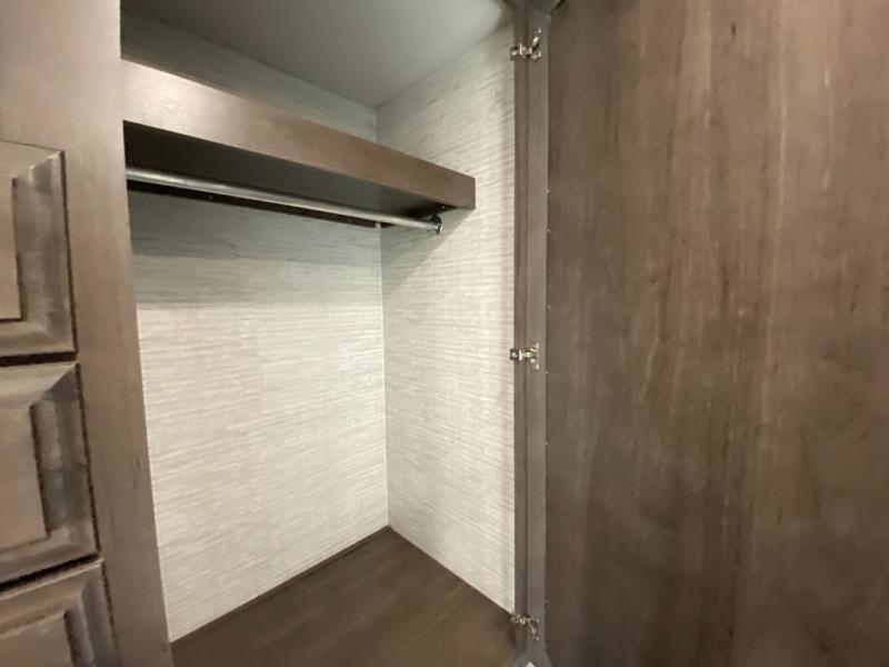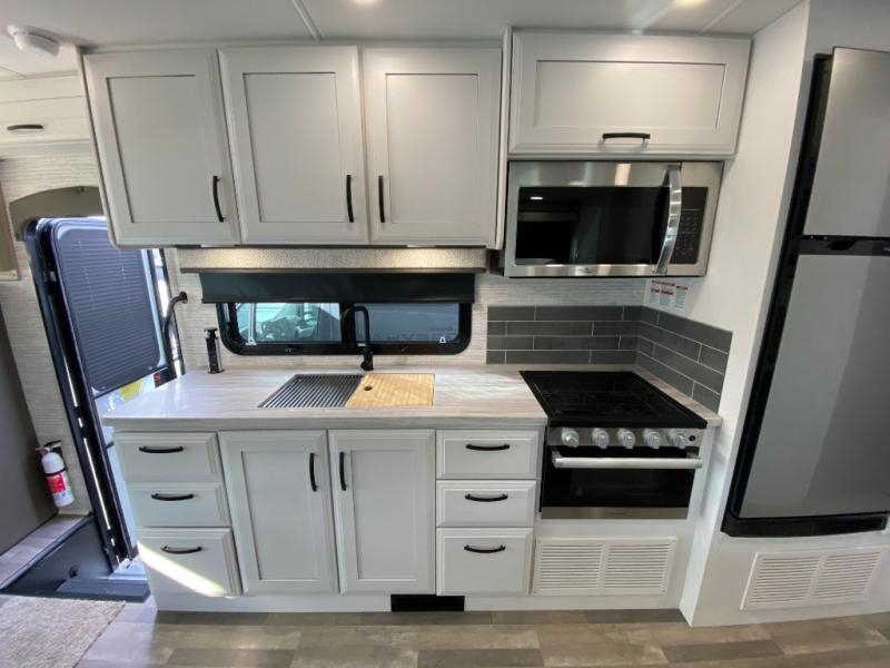 This motorhome includes double slides so you can enjoy more interior space, just like at home! The 42" x 70" booth dinette and 60" tri-fold sofa are in great view of the LED HD Smart TV, and your guests can sleep here, as well as on the cab-over bunk. This Greyhawk kitchen includes a Furrion all-in-one cooktop and oven, a residential-size microwave, and a pantry to store dry goods. You will find a convenient 30" x 36" shower, with the private toilet and sink across the hall so two people can freshen up at once. And don't overlook the rear bedroom with its queen bed slide out, dual bedroom wardrobes, and cabinet!
