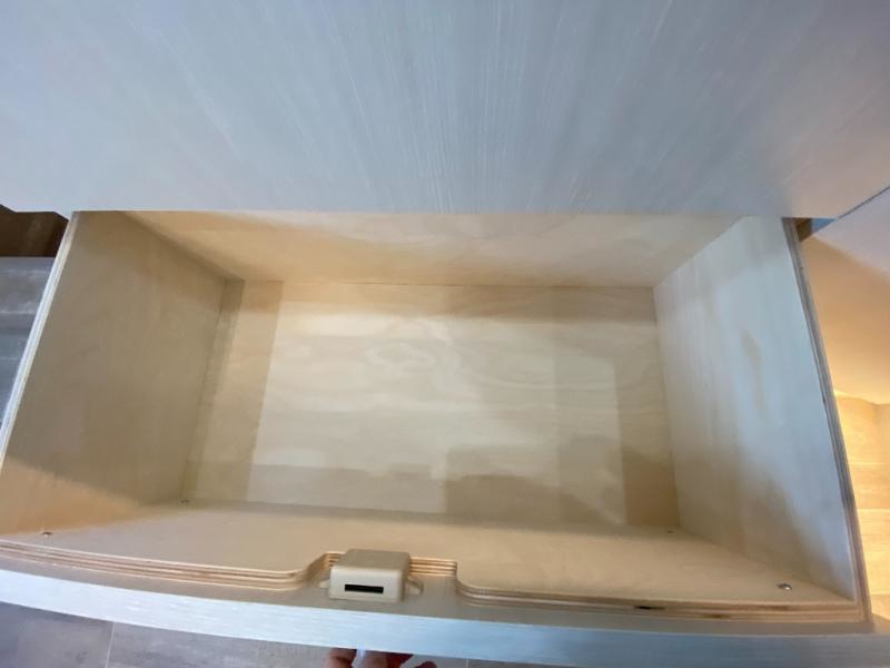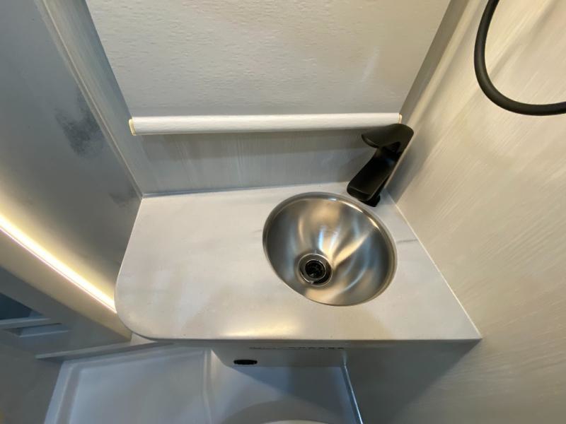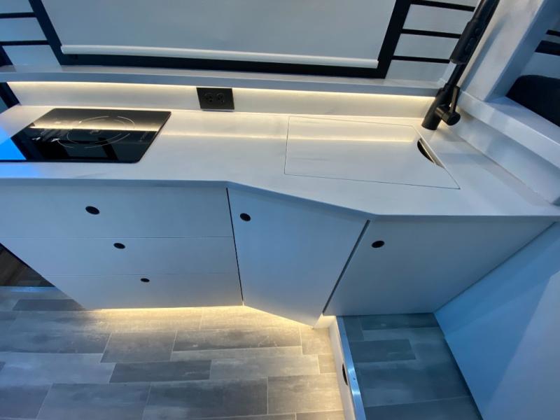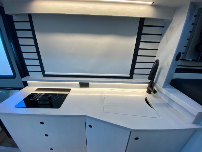 Private Wet Bathroom: Experience the comfort of a fully-equipped bathroom within a compact van. This space features a residential-style china bowl toilet, separate sink, handheld showerhead, and medicine cabinet with mirror. Designed for durability, the bathroom is lined with Corian and waterproof laminate, combining functionality with a long-lasting finish.