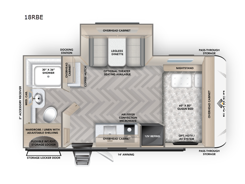 The 2026 Ember RV E-Series 18RBE is a lightweight, single-axle travel trailer designed for couples and solo travelers seeking comfort and efficiency. Measuring 21'10" in length with a dry weight of 4,165 lbs, it's easily towable by many SUVs and trucks. Inside, enjoy a residential-sized 60" x 80" queen bed, a legless dinette slide-out, and a spacious rear bathroom with a 30" x 36" shower and ample storage. The kitchen is equipped with a 10 cu. ft. 12V refrigerator, dual-burner cooktop, and an air fryer convection microwave. Stay comfortable year-round with the 18,000 BTU "Whisper Quiet" A/C and a 20,000 BTU furnace. Built with durable laminated Azdel Onboard® composite walls and a one-piece Tufflex® PVC roofing system, the 18RBE offers durability and ease of maintenance.