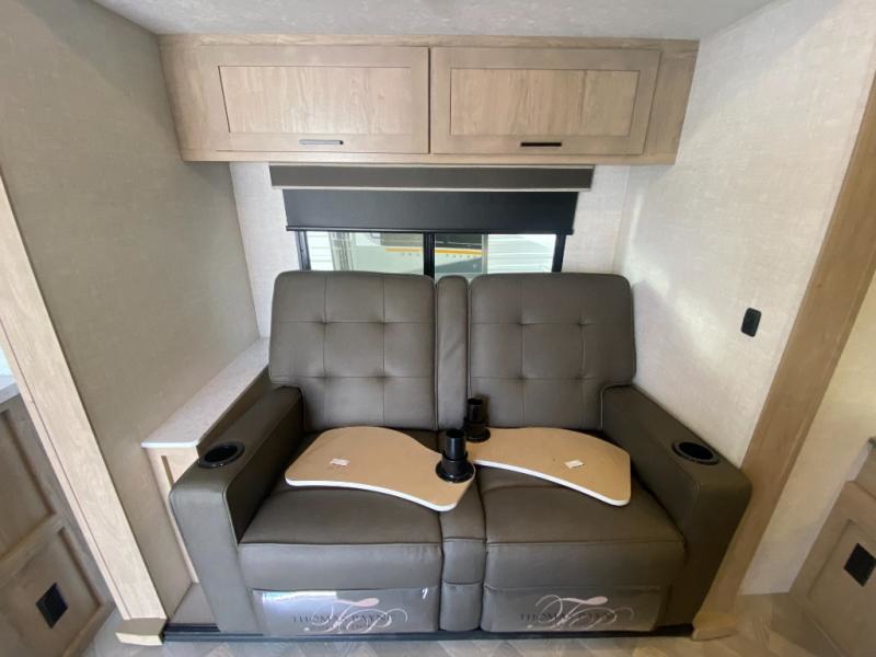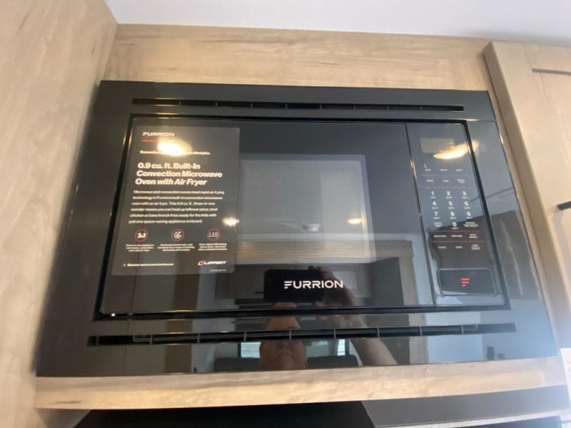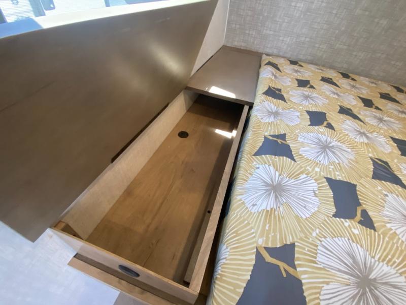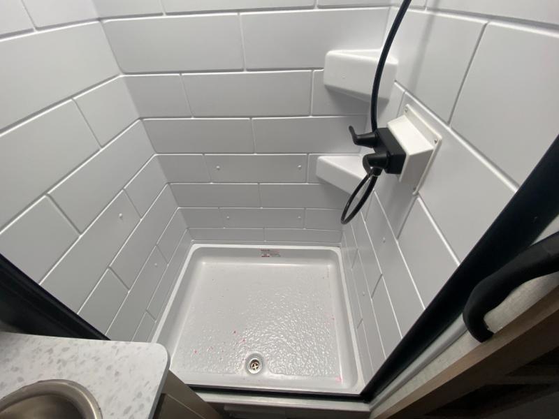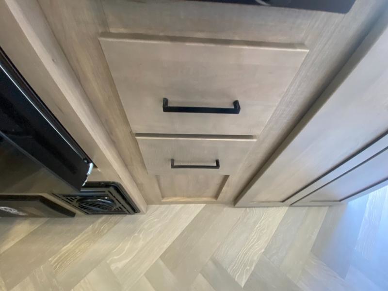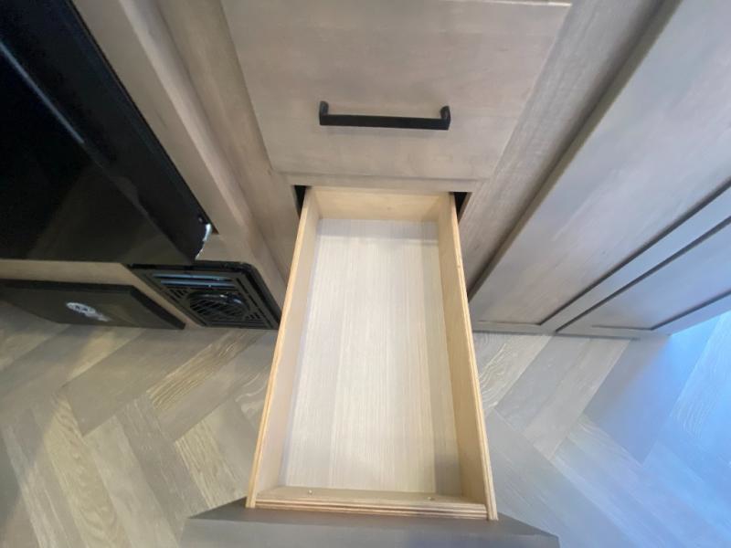 Time at the campground in this travel trailer will be time well spent. Once you arrive at your destination, you can put out the 14' electric awning, unpack the pass-through storage, then head inside for lunch. There is an air fryer convection microwave plus a dual burner cooktop to make meals each day, and the 10 cu. ft. 12V refrigerator will keep your food fresh. A legless dinette slide provides a place to dine together and even let a guest sleep over. If you're not needing the extra sleeping space, just choose the optional theater seating! You'll find the front queen bed will give you a great night's rest, and there is a full rear bath on board that will allow you to freshen up each morning.
