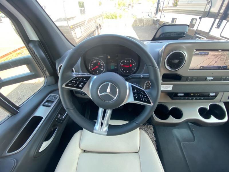 The Winnebago Navion 24T and 24R Class C diesel motorhomes are functional, innovative, and stylish! You can rule the interstate with the Mercedes-Benz RWD Sprinter chassis, or choose the optional Mercedes-Benz AWD Sprinter chassis to tackle tougher terrain. A Lithium Power Package comes with a 320-amp-hour lithium battery and a dedicated second alternator that will allow you to charge the batteries faster while you're on the road. There are also two 120-watt solar panels to keep you going when you're off-grid. Since there is a heated gear garage with L-track cargo tie-downs, you can bring along two full-size bikes and additional gear for hiking, plus there are 110V/12V charging ports and LED lighting here for added convenience. The contemporary interior features blackout roller shades for the lounge and dining area, woven vinyl flooring throughout, and dimmable LED lighting. There is also a Winnebago Connect that is integrated into your Winnebago app that acts as your RV companion. Now you can stay informed on vehicle system alerts, travel prep resources, energy management, and more!