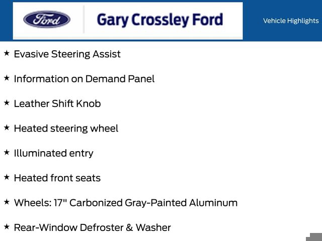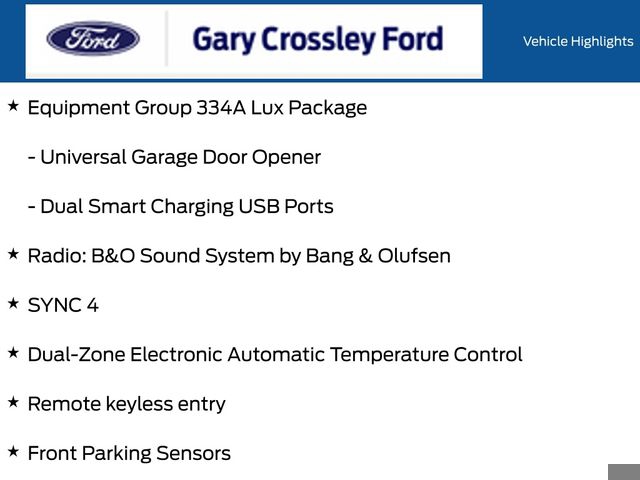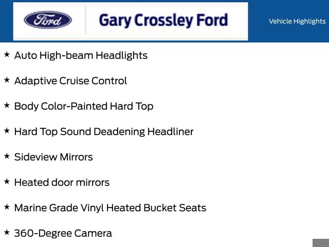 - Radio: B&O Sound System by Bang & Olufsen, SYNC 4, Dual-Zone Electronic Automatic Temperature Control, Remote keyless entry, Exterior Parking Camera Rear, Front Parking Sensors, Auto High-beam Headlights, Adaptive Cruise Control, Body Color-Painted Hard Top, Hard Top Sound Deadening Headliner, Heated door mirrors, 360-Degree Camera, Evasive Steering Assist, Heated steering wheel, Leather Shift Knob, Marine Grade Vinyl Heated Bucket Seats, Heated front seats, Wheels: 17" Carbonized Gray-Painted Aluminum, Rear-Window Defroster & Washer, 4.46 Axle Ratio