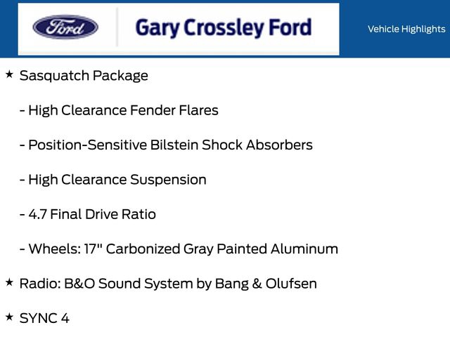 Ford Bronco 2025 Azure Gray Metallic Tri-Coat Factory MSRP: $70,415 $2,915 off MSRP! 2-Door Intelligent Access w/Lock/Unlock, 360-Degree Camera, 4.7 Final Drive Ratio, Adaptive Cruise Control, Ambient Footwell Lighting, Black Appearance Package, Black Molded-In-Color Door Handles, Black Molded-In-Color Fender Flares, Black Molded-In-Color Sideview Mirror Caps, Black-Painted Molded-In-Color Grille, BLIS Blind Spot Information System, Connected Navigation, Dr & Pass Illuminated Sliding Visor Vanity Mirrors, Dual Smart Charging USB Ports, Dual-Zone Electronic Automatic Temperature Control, Equipment Group 334A Lux Package, Evasive Steering Assist, Exterior Parking Camera Rear, Front Parking Sensors, Front Row Heated Seats, Hard Top Sound Deadening Headliner, Heated front seats, Heated steering wheel, High Clearance Fender Flares, High Clearance Suspension, Illuminated entry, Information on Demand Panel, Lane-Keeping System, Leather Shift Knob, Leather-Trimmed/Vinyl Bucket Seats, Position-Sensitive Bilstein Shock Absorbers, Power Outlet - Back Side of Center Floor Console, Radio: B&O Sound System by Bang & Olufsen, Rear Parking Sensors, Rear-Window Defroster & Washer, Remote keyless entry, Sasquatch Package, Shadow Black Painted Hard Top, Sideview Mirrors, SYNC 4, Universal Garage Door Opener, Wheels: 17" Carbonized Gray Painted Aluminum. 2.7L EcoBoost V6 4WD 10-Speed Automatic 4D Sport Utility 17/18 City/Highway MPG Badlands