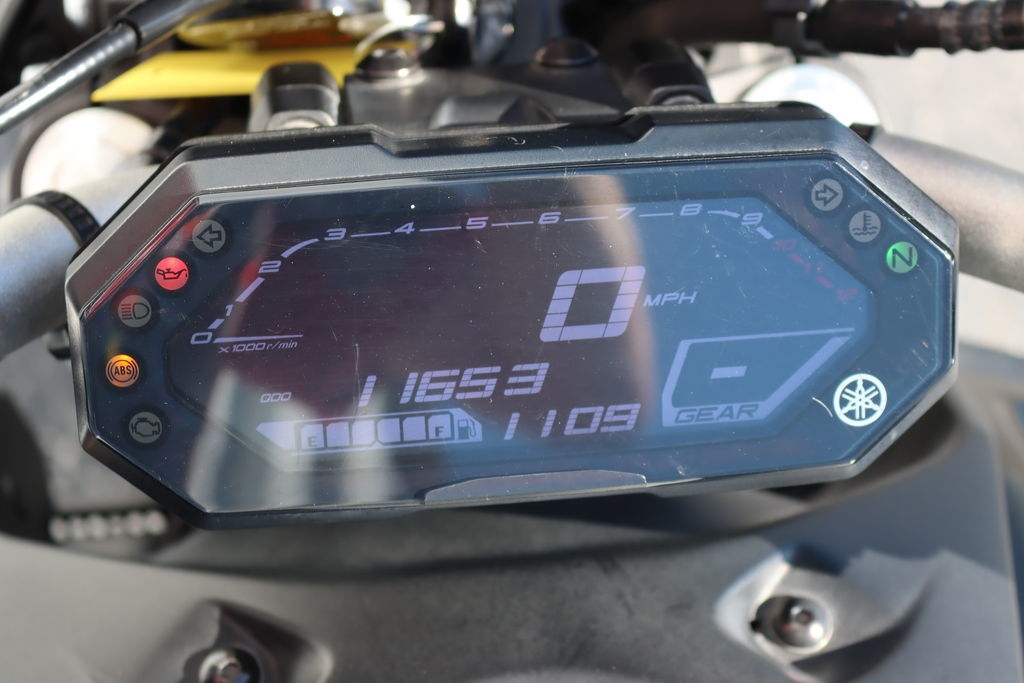 ADDITIONALThe MT-07 features a new multifunction negative-display LCD dash with a black background and white readouts while RPMS of 10k - 12k are indicated with a red color. Designed specifically for the MT-07's cockpit, the arrangement of the information features a larger display for the clock, current gear, trip/odometers and tachometer. Trip 1, Trip 2 and Trip F, the temperature and other meter functions can be toggled and reset with the left handlebar thumb switch while key displays like the gear indicator are on the right while the tachometer are positioned along the top.