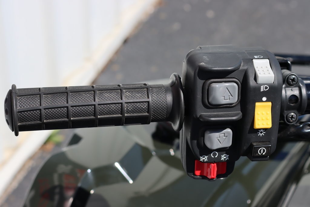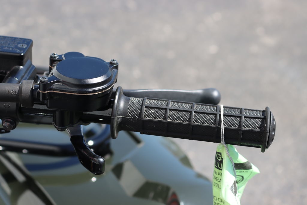 The reverse lever, mounted on the left bar alongside the parking brake, is easy to use without taking your hands off the handlebar.